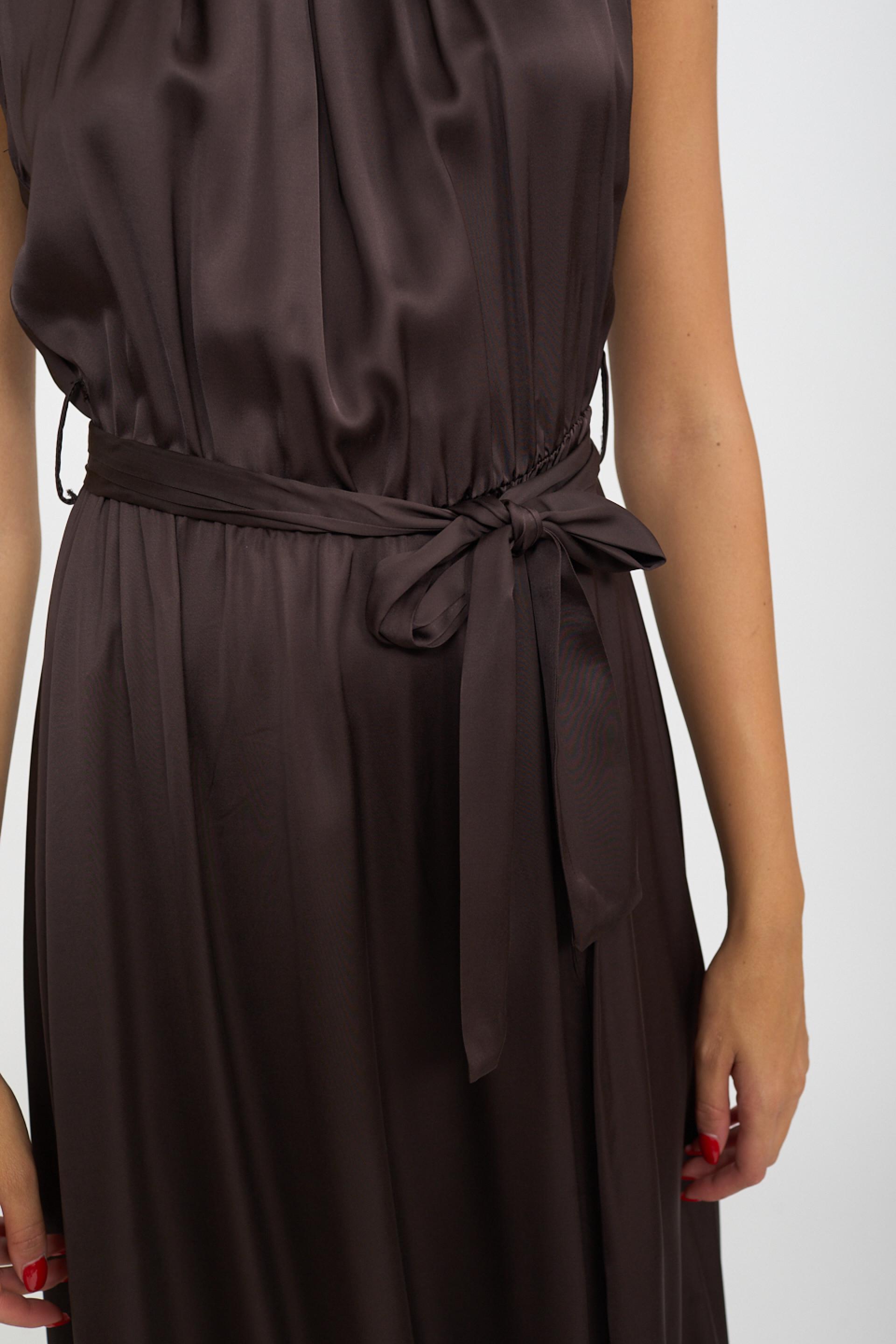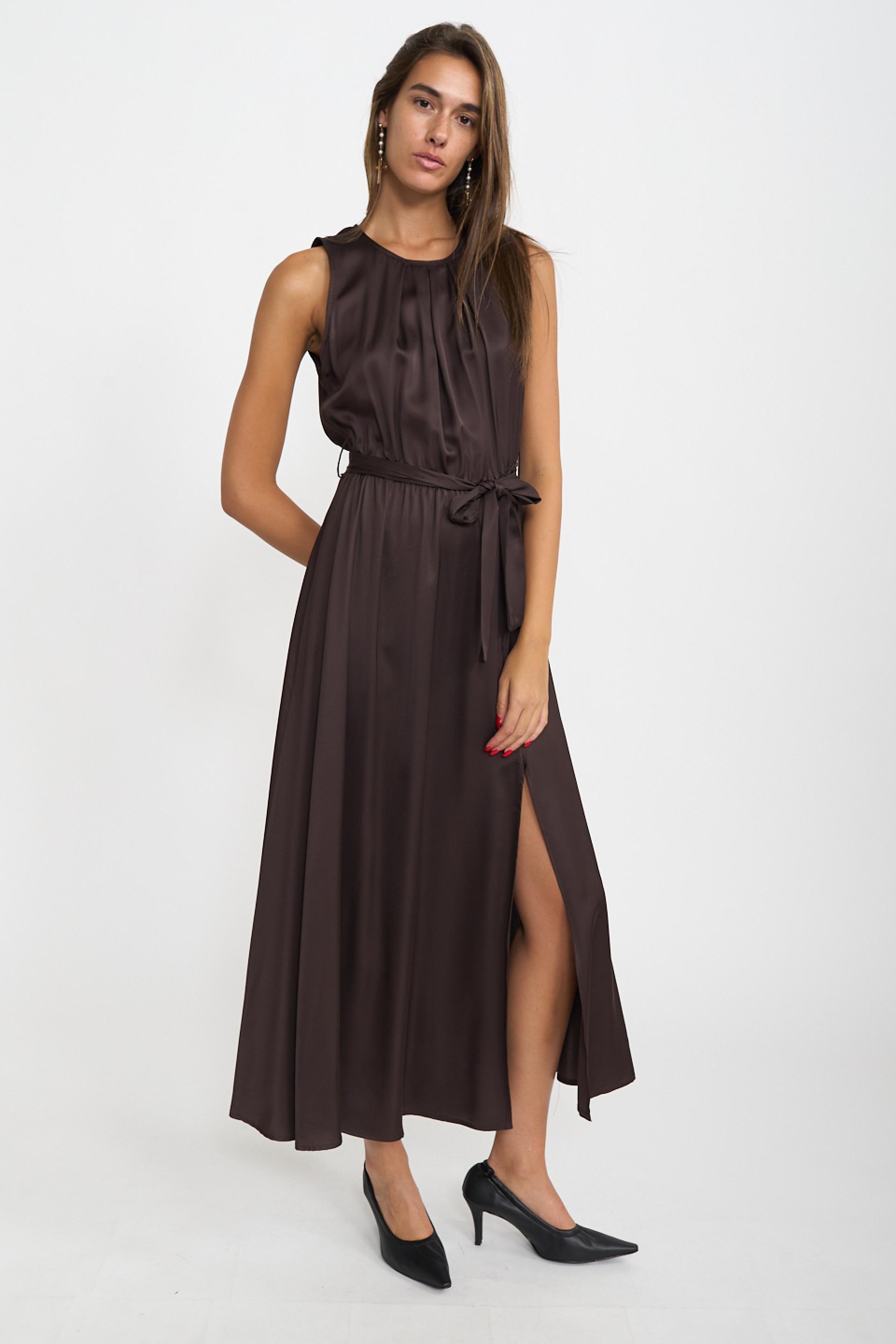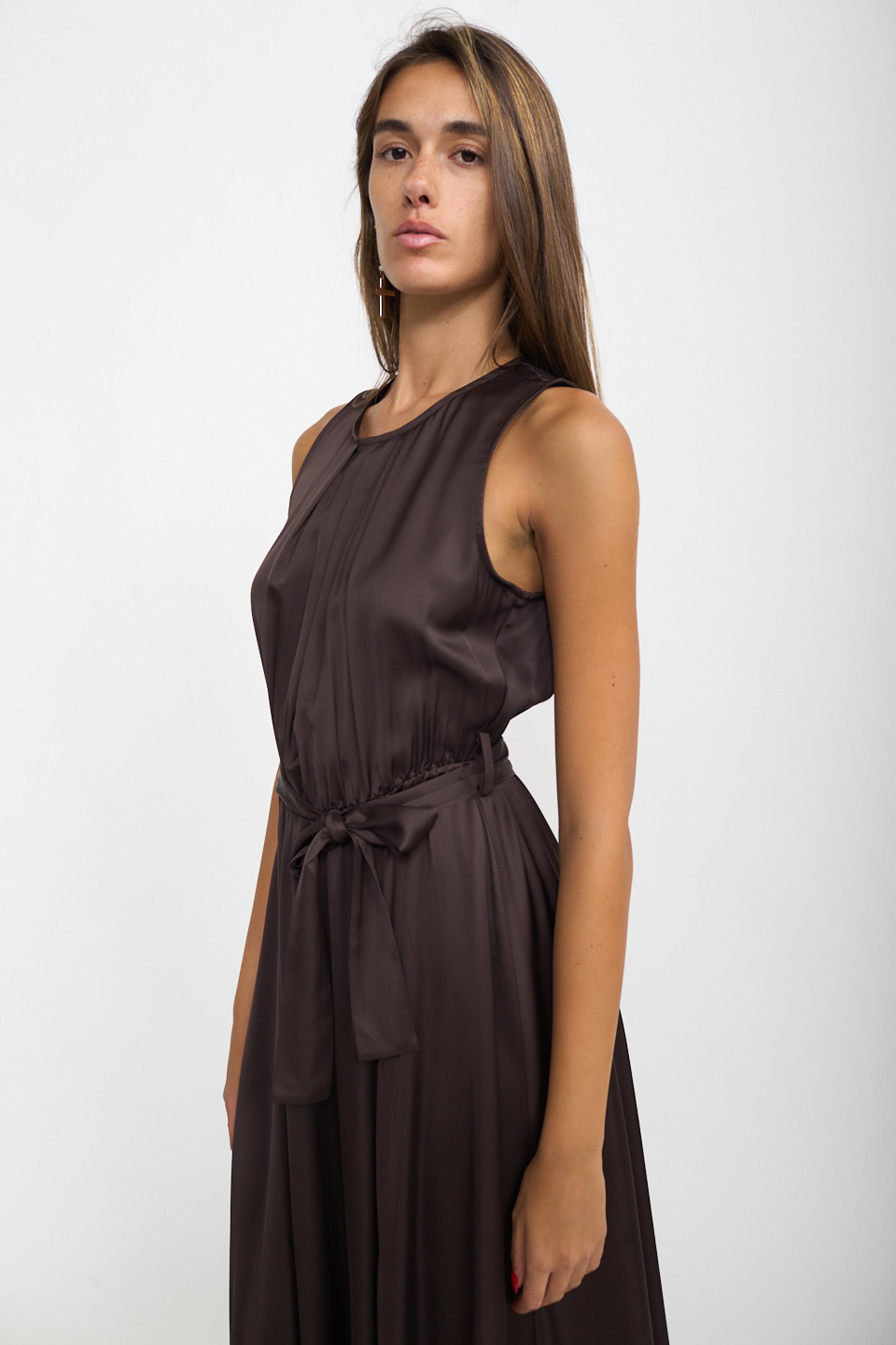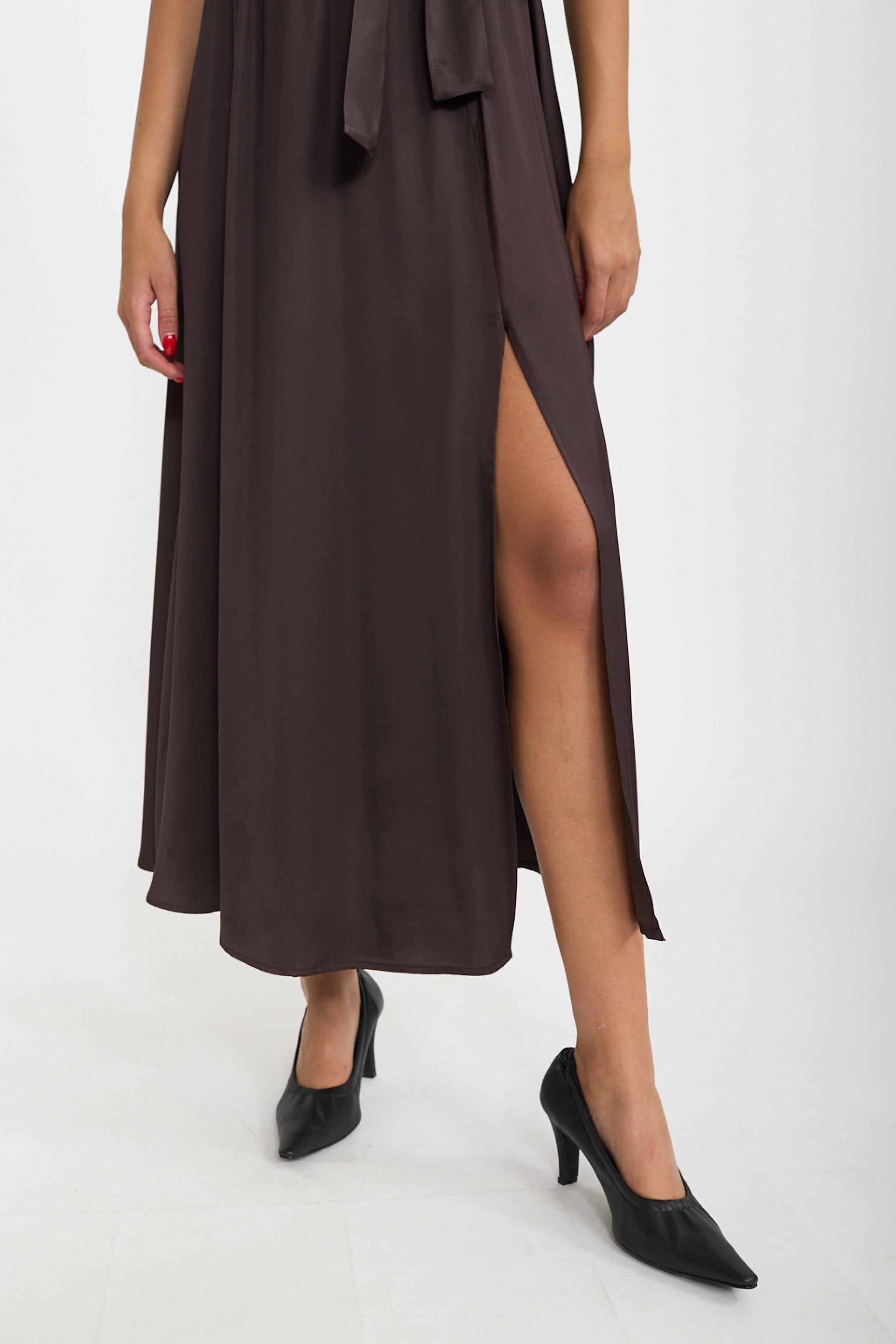 | Abito scollo america lungo in viscosa a ruota. Spacco laterale e dettaglio di pieghe frontali. Passanti in vita con cinta in tessuto. | ||