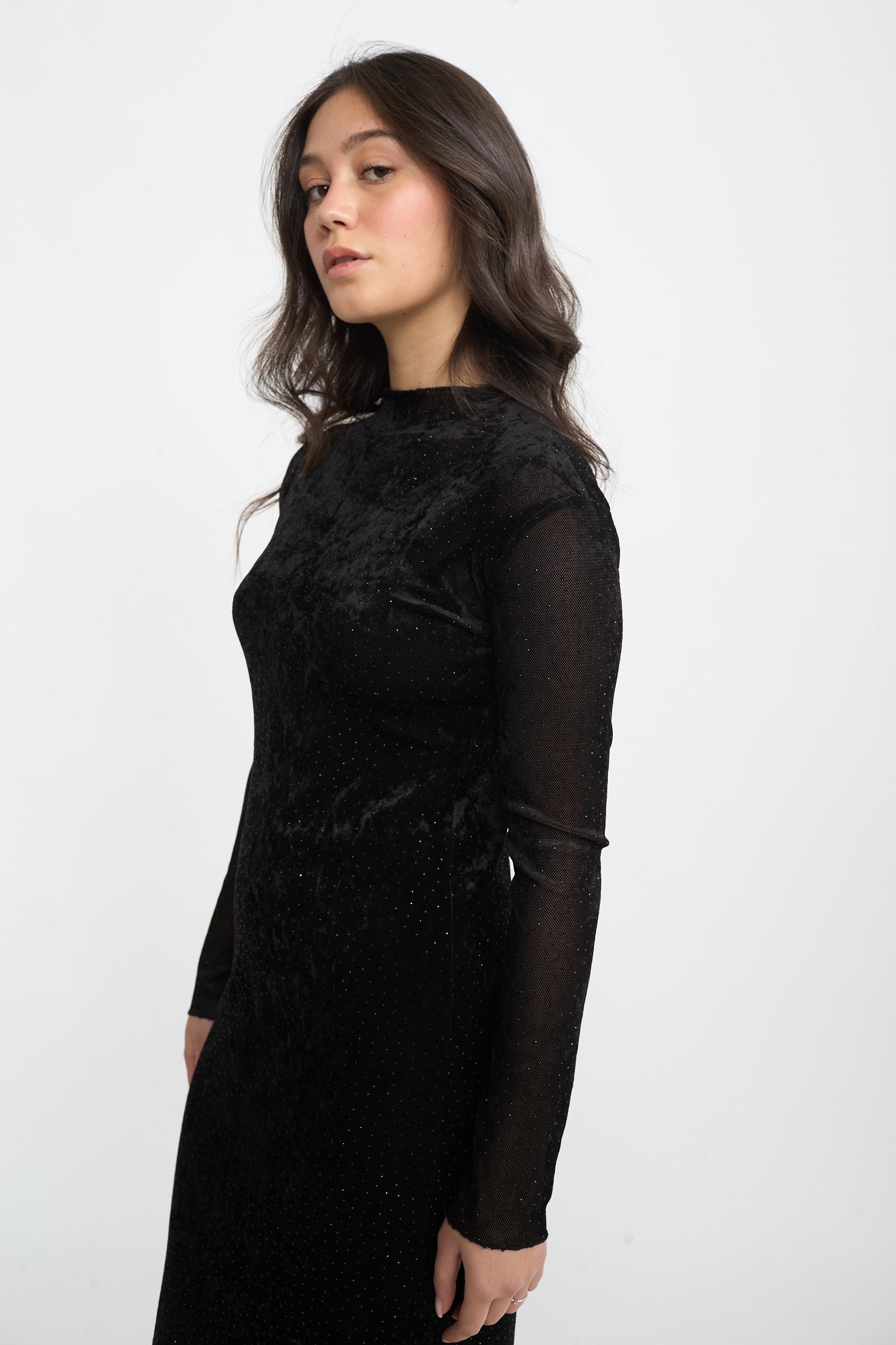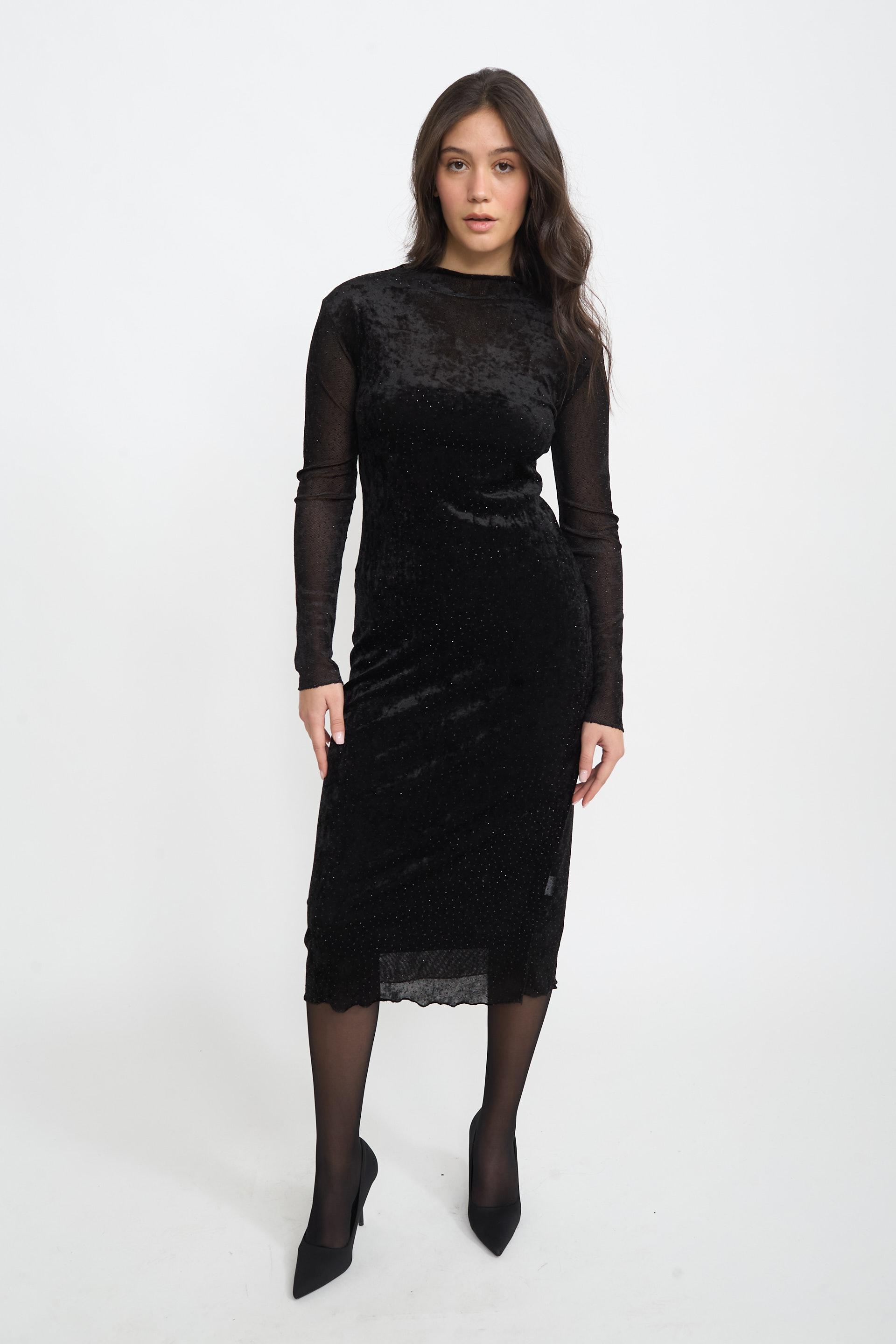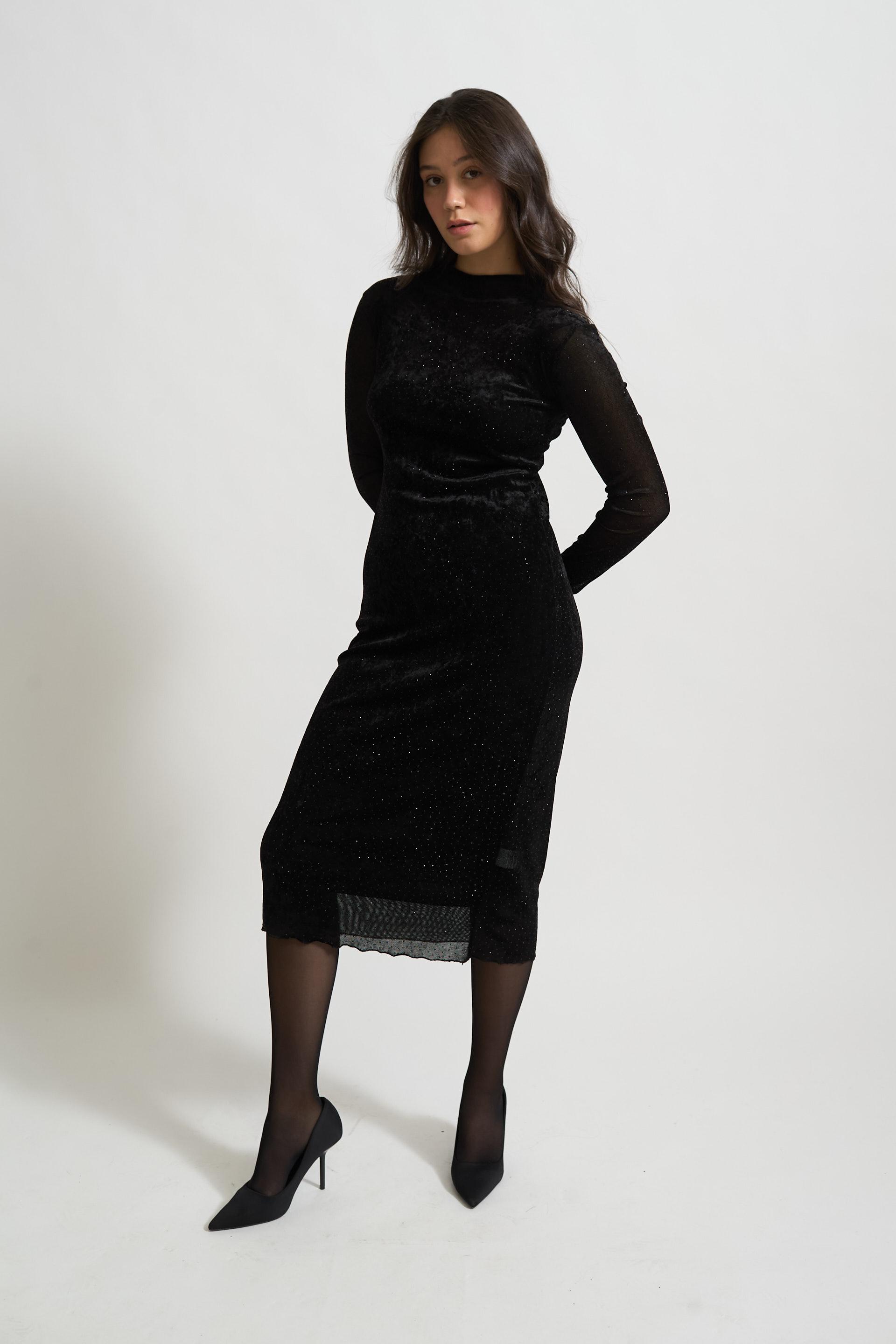 | Abito collo vulcano in ciniglia semitrasparente con strass applicati. | ||