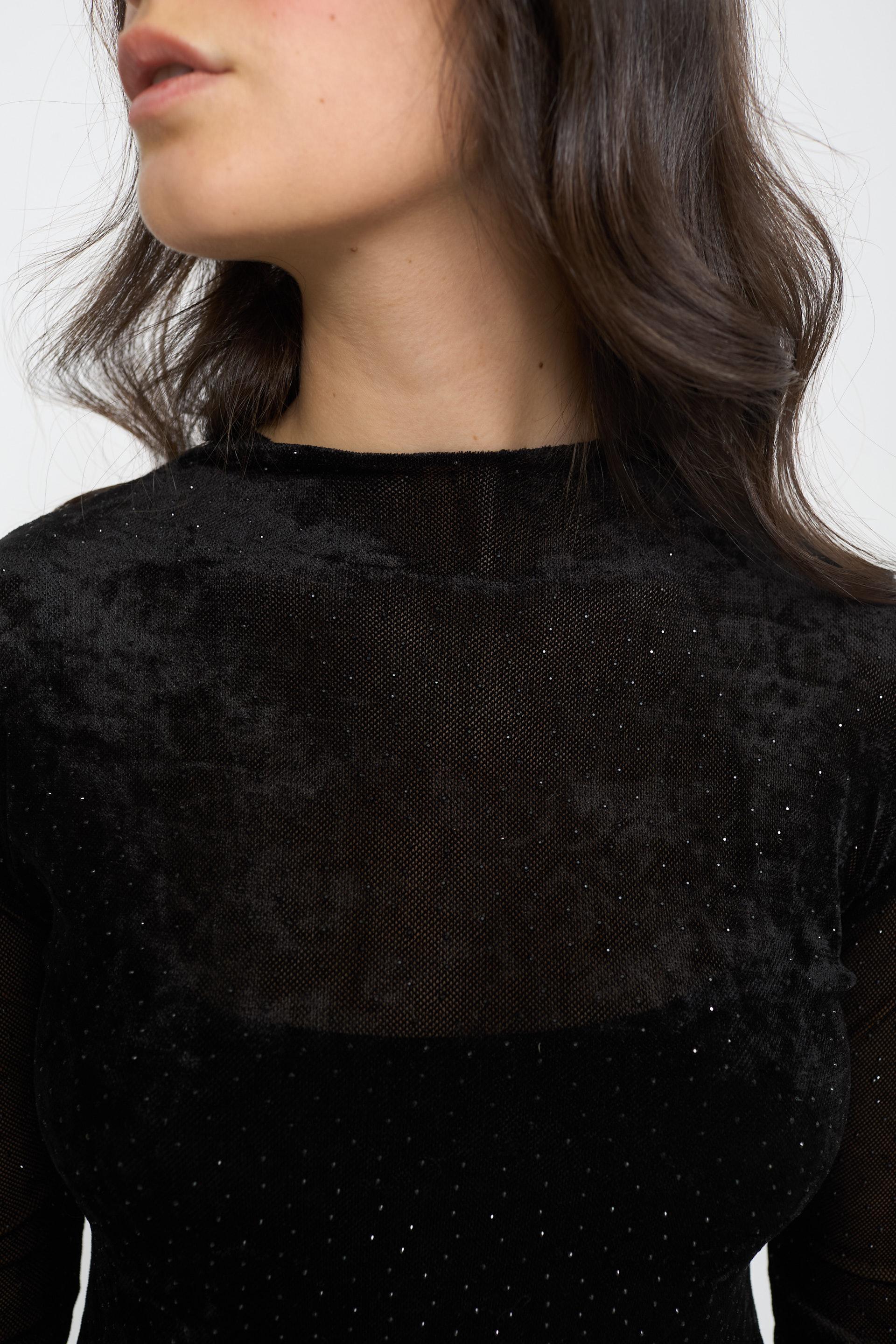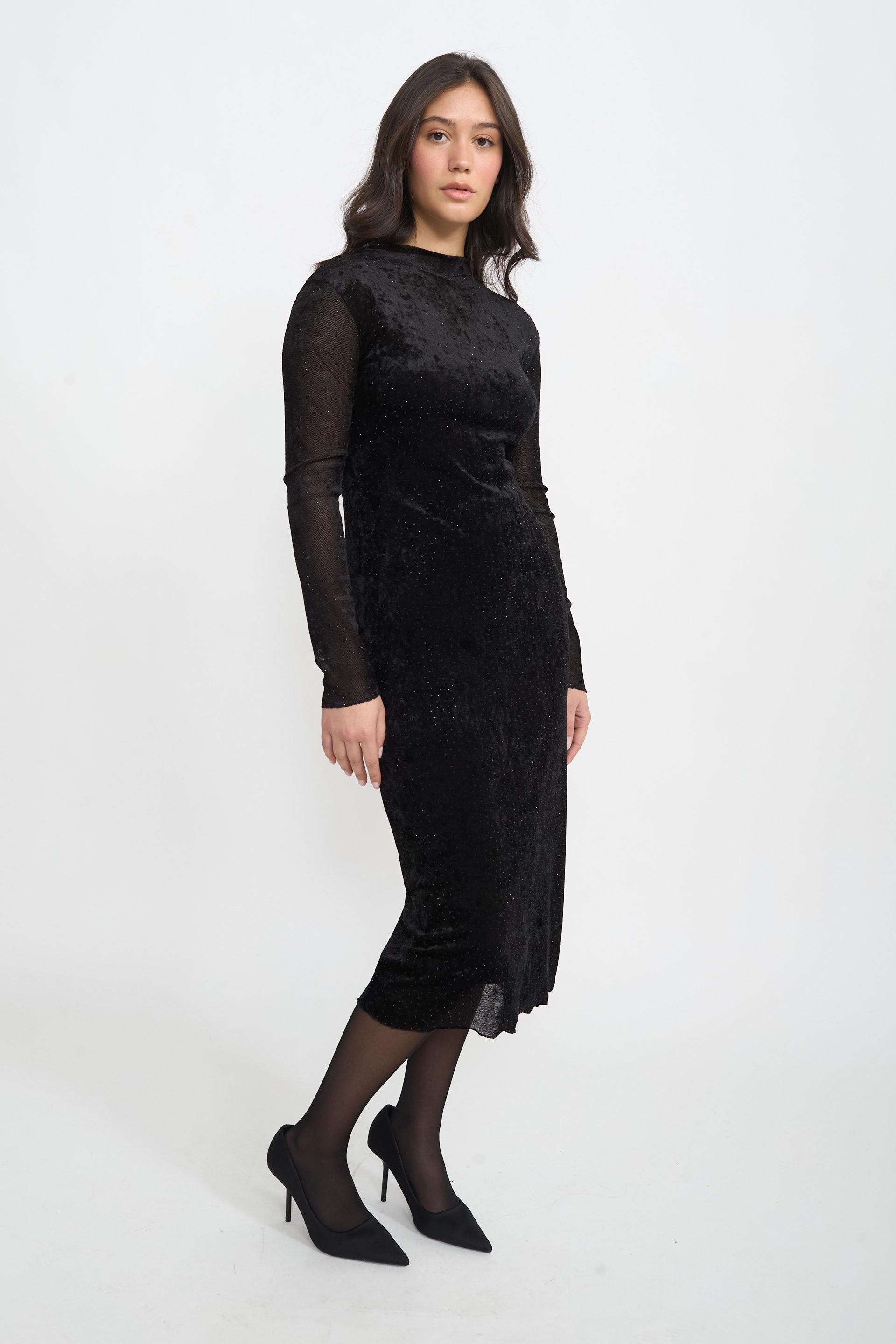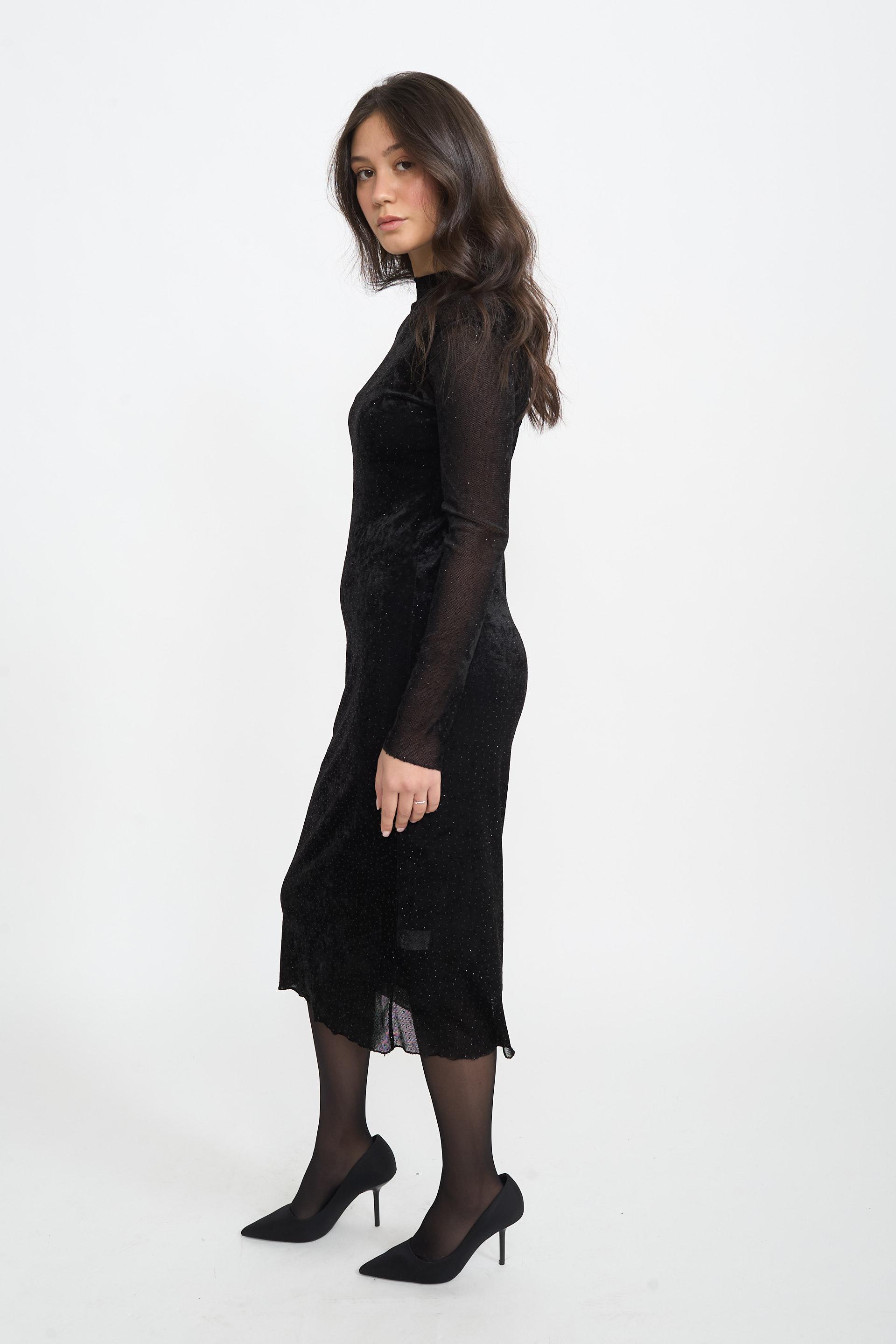 | Abito collo vulcano in ciniglia semitrasparente con strass applicati. | ||