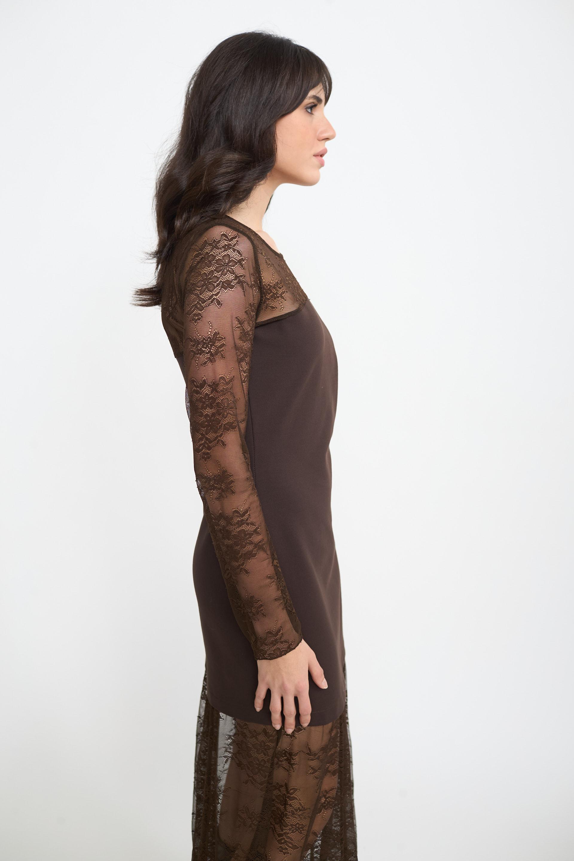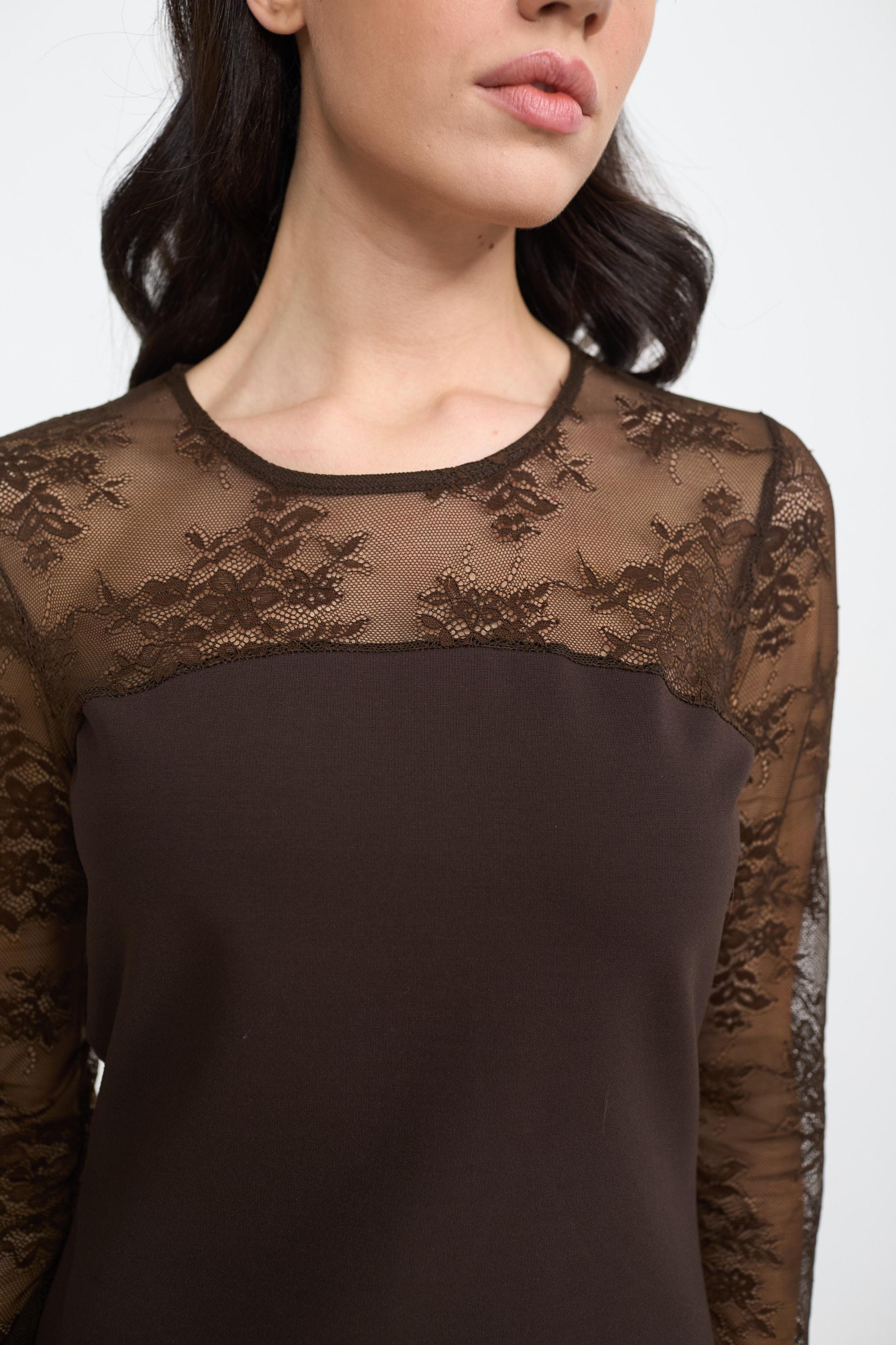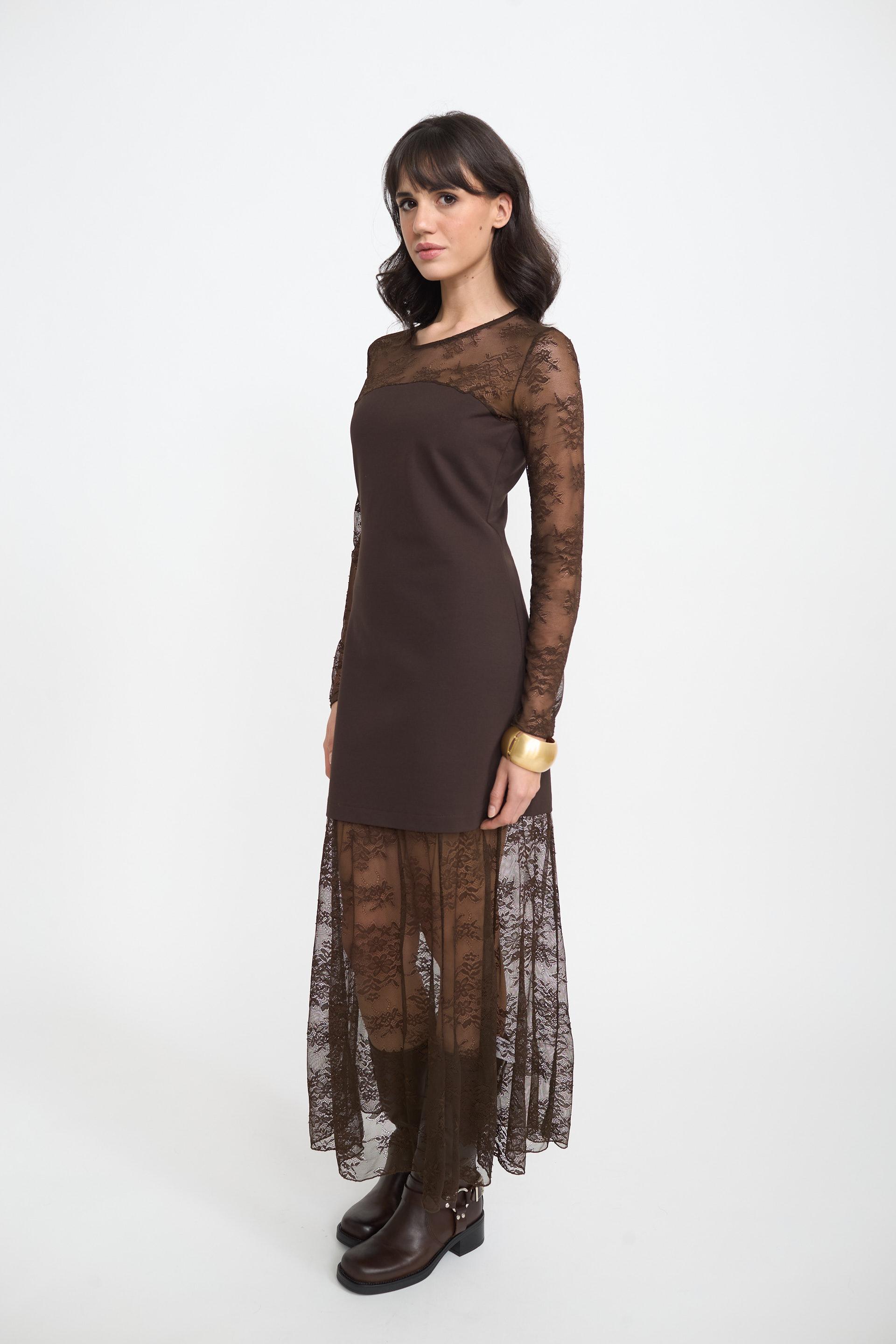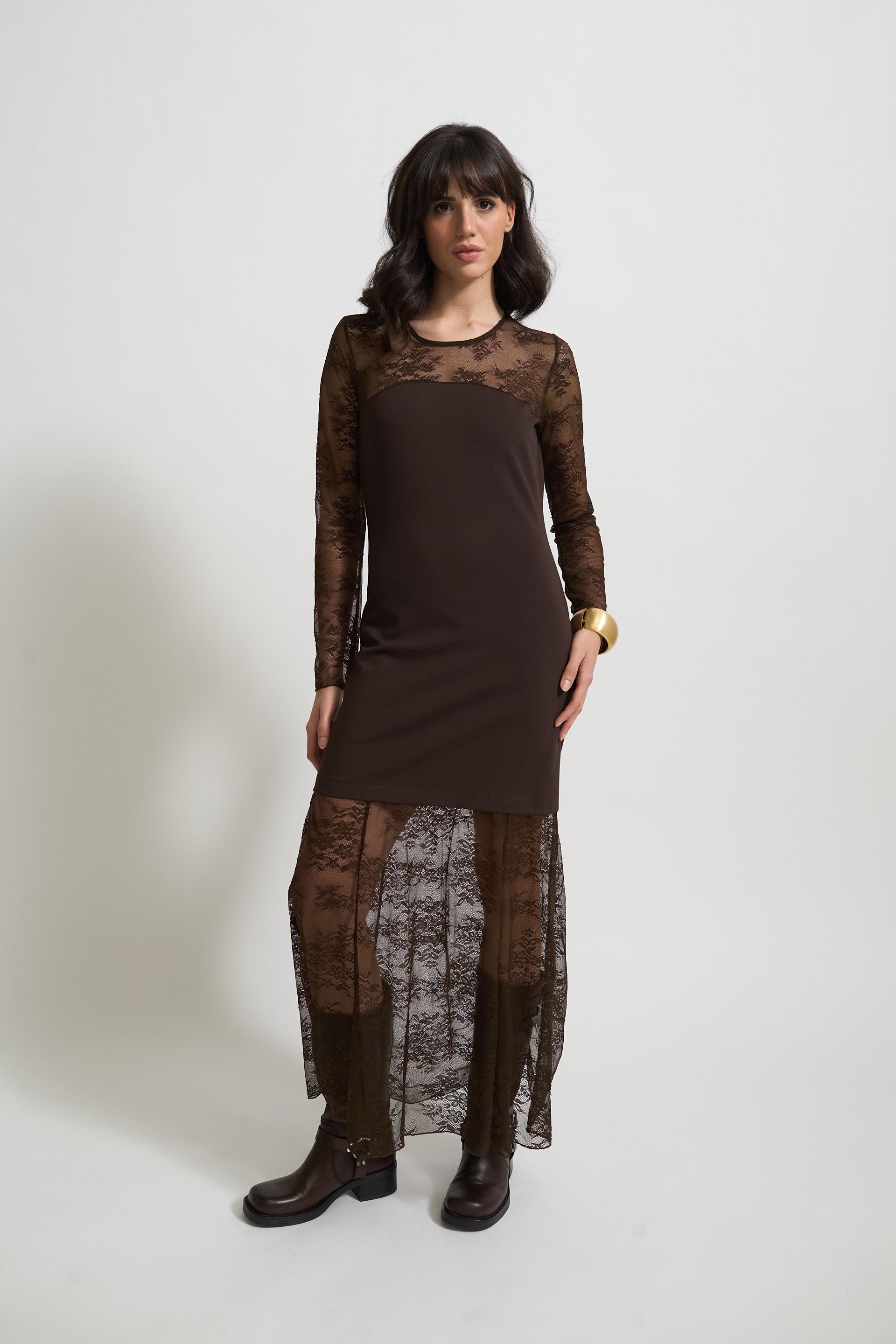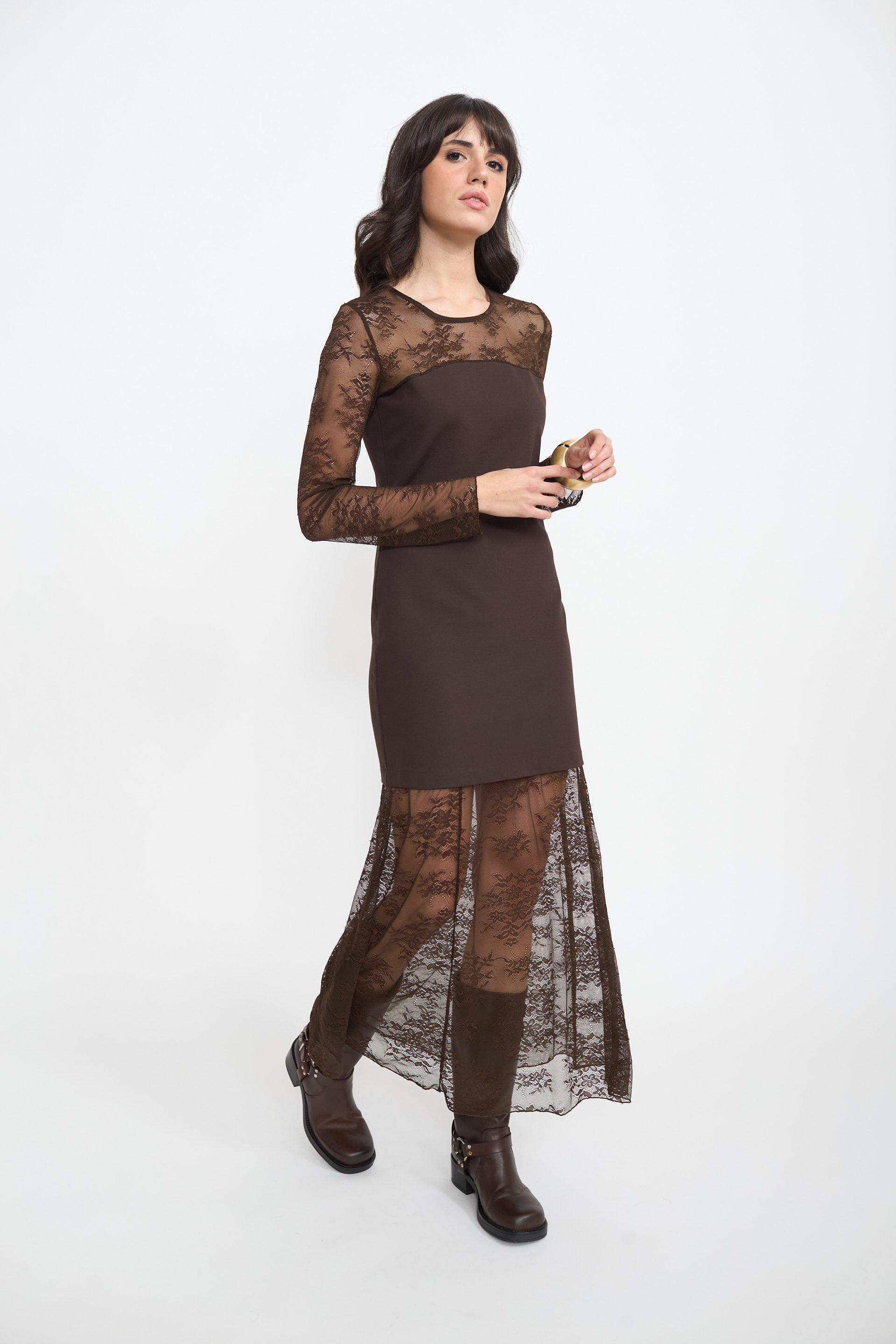 | Abito tubino in punto Milano con scollo, maniche o orlo in pizzo fantasia. | ||