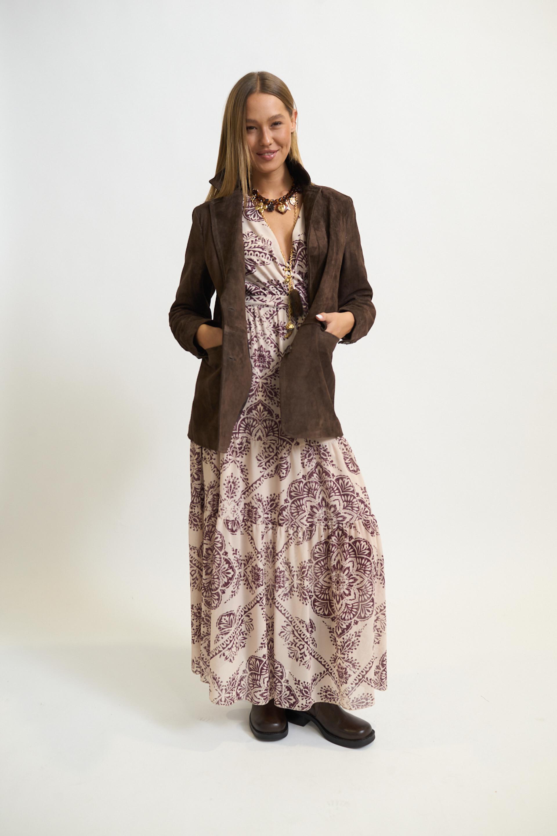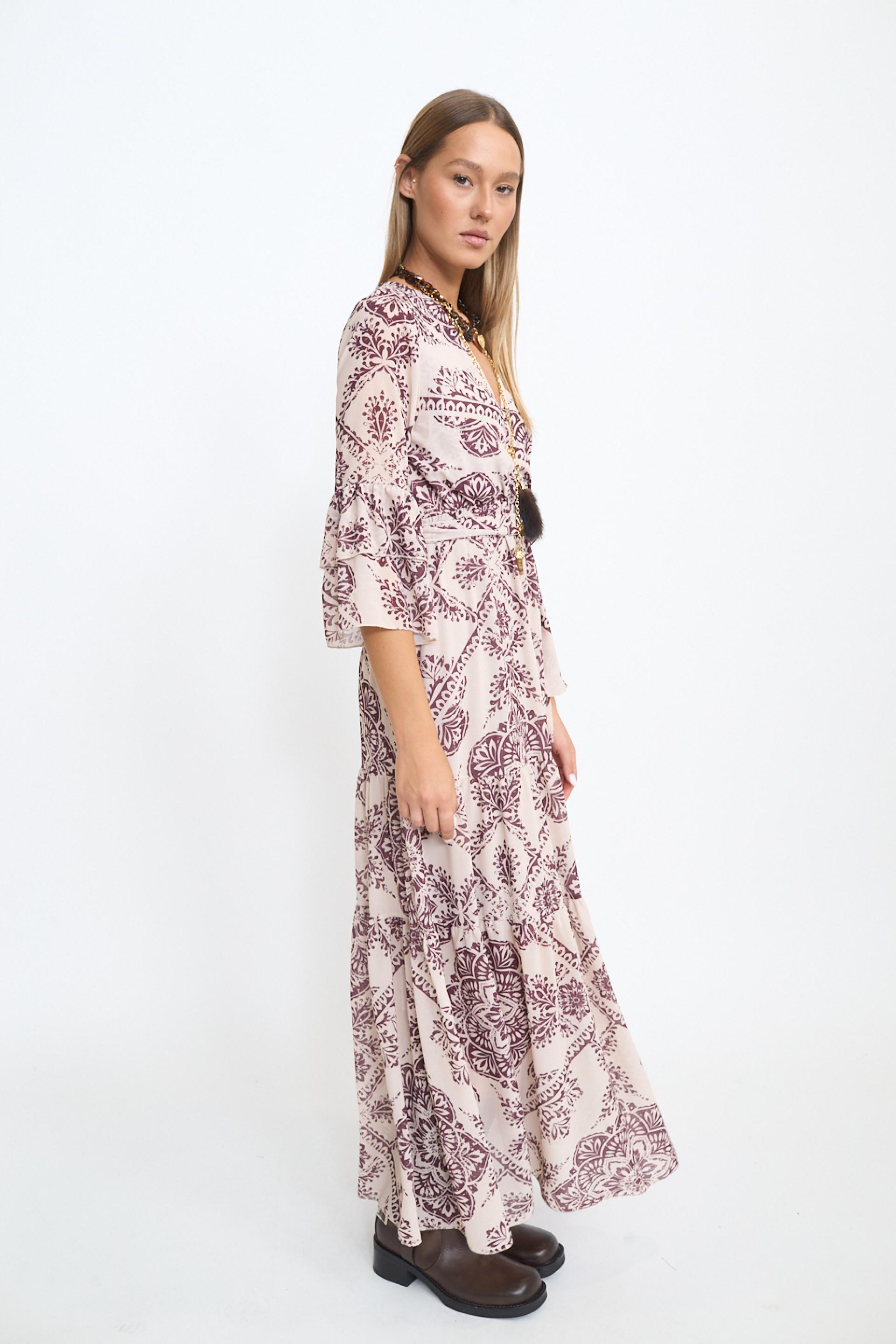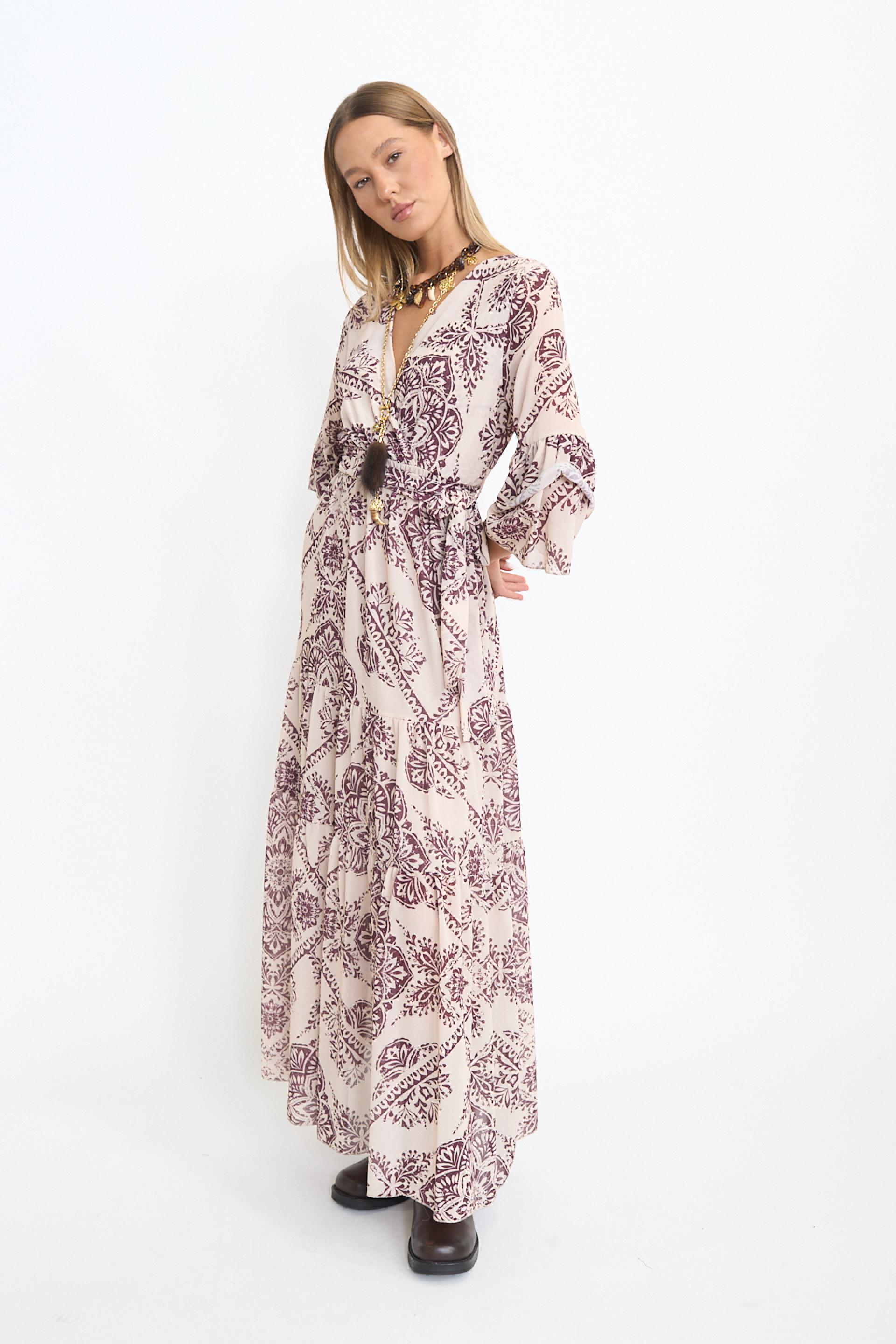 | Abito lungo con scollo ad incrocio in tessuto georgette fantasia. Maniche 3/4 con balze e gonna con balze. Elastico e passanti in vita con cinta in tessuto. Fodera sottogonna. | ||