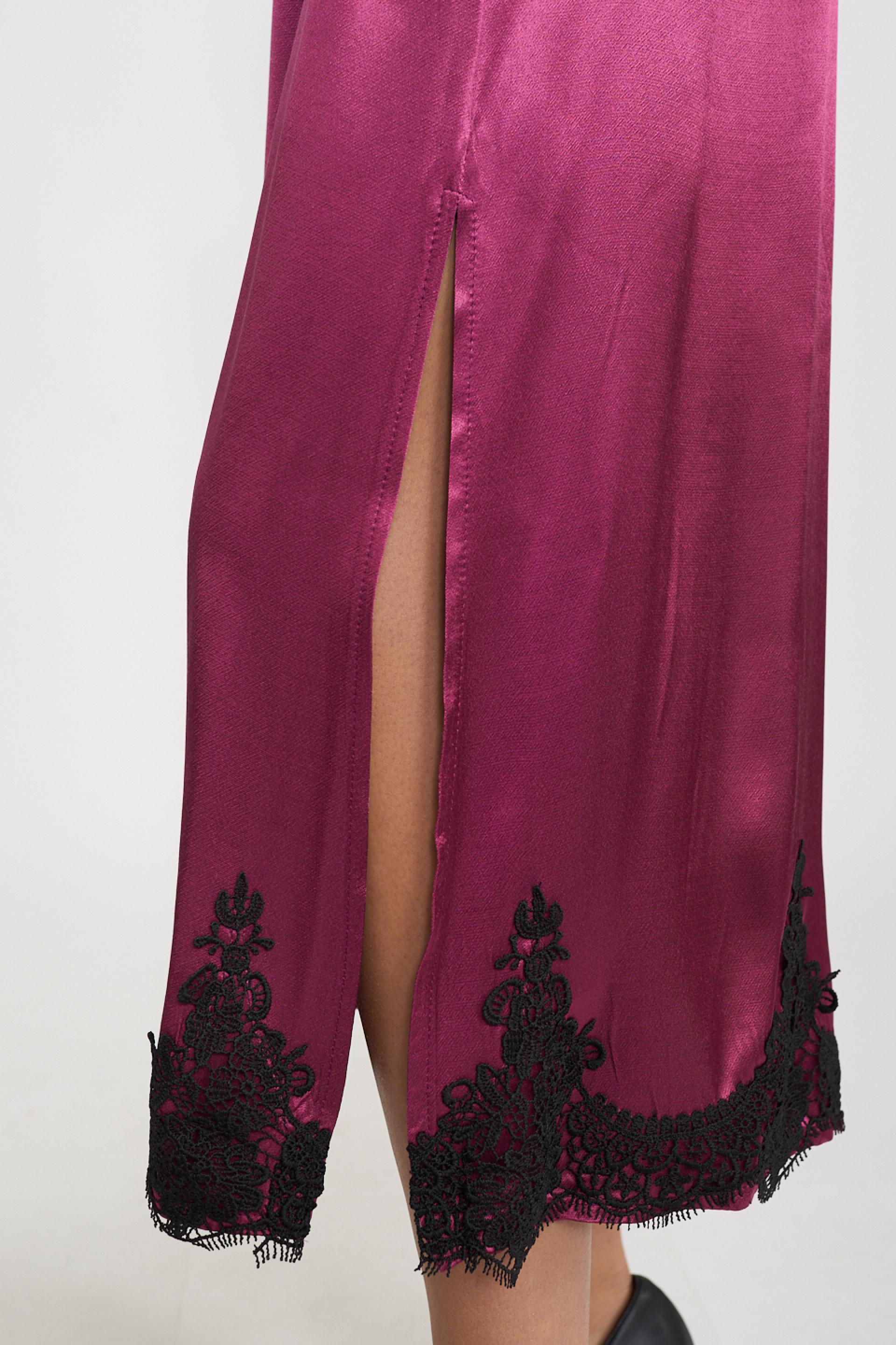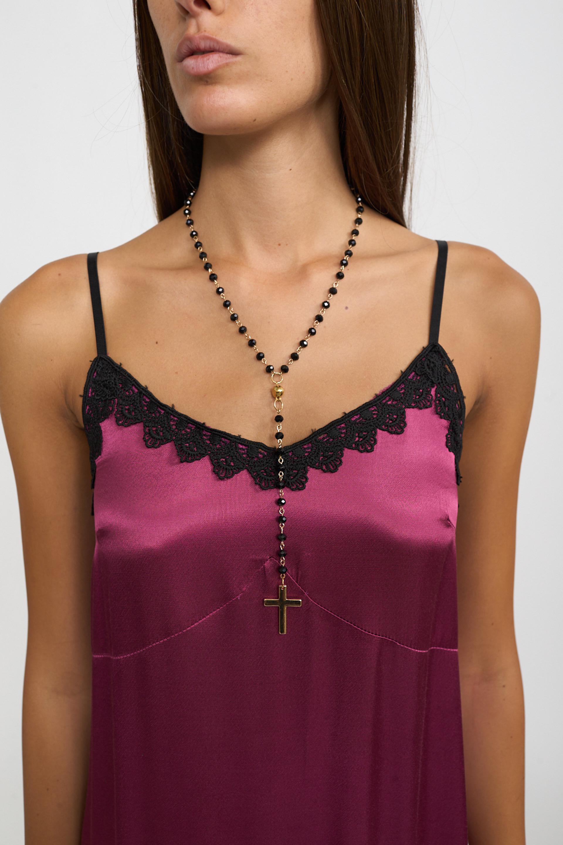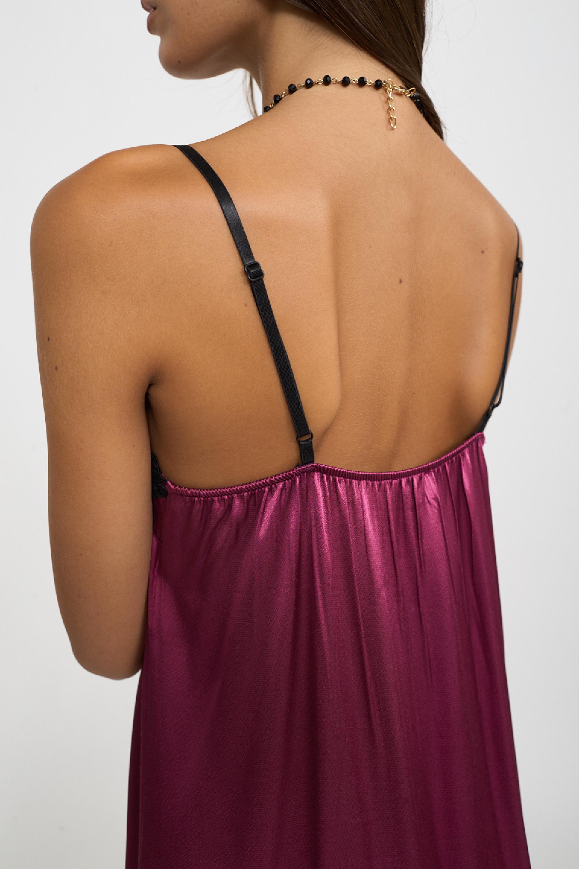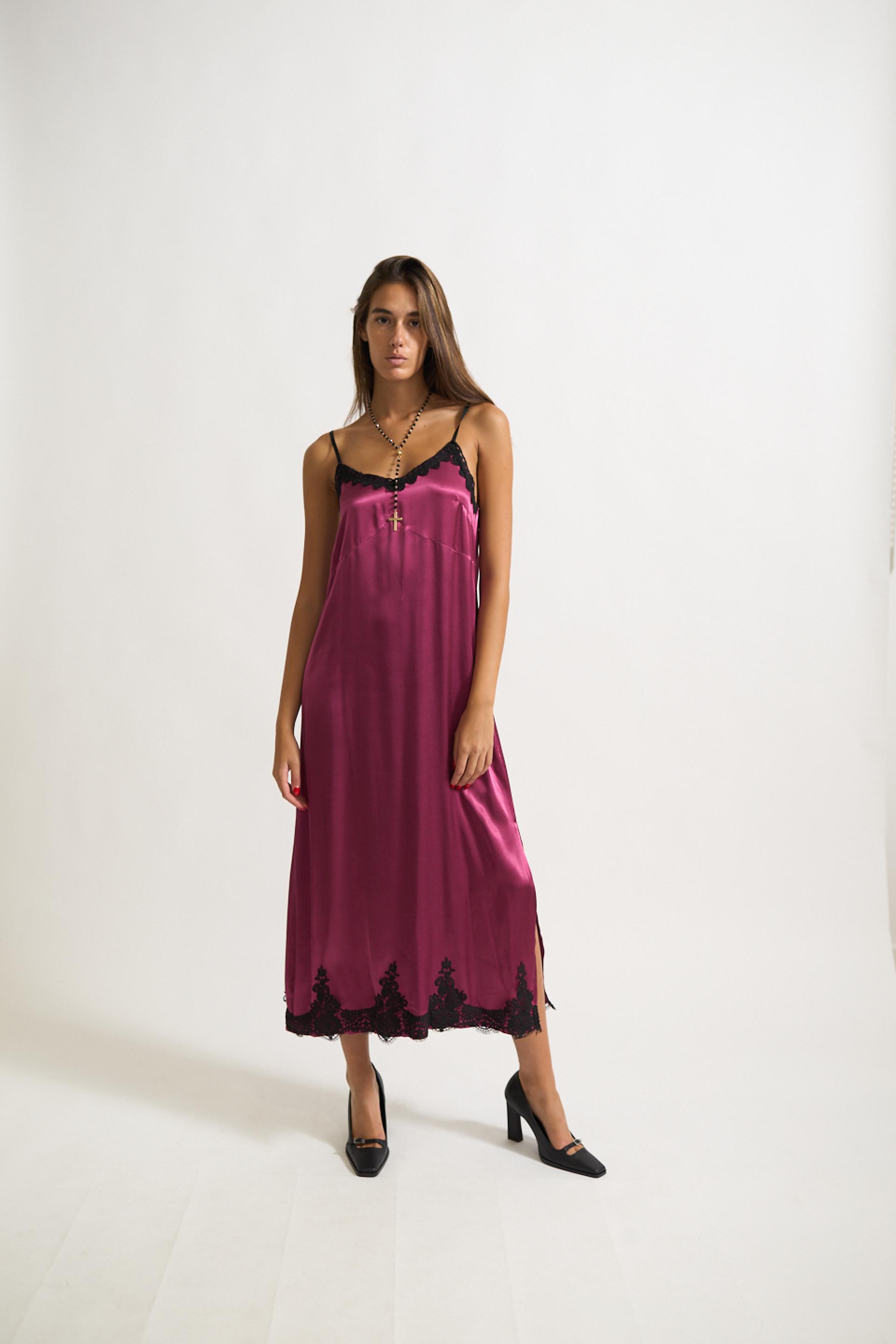 | Abito lungo in raso di viscosa con spacco laterale e dettaglio di inserti in pizzo su scollo e orlo. Bretelline regolabili ed elastico posteriore. | ||