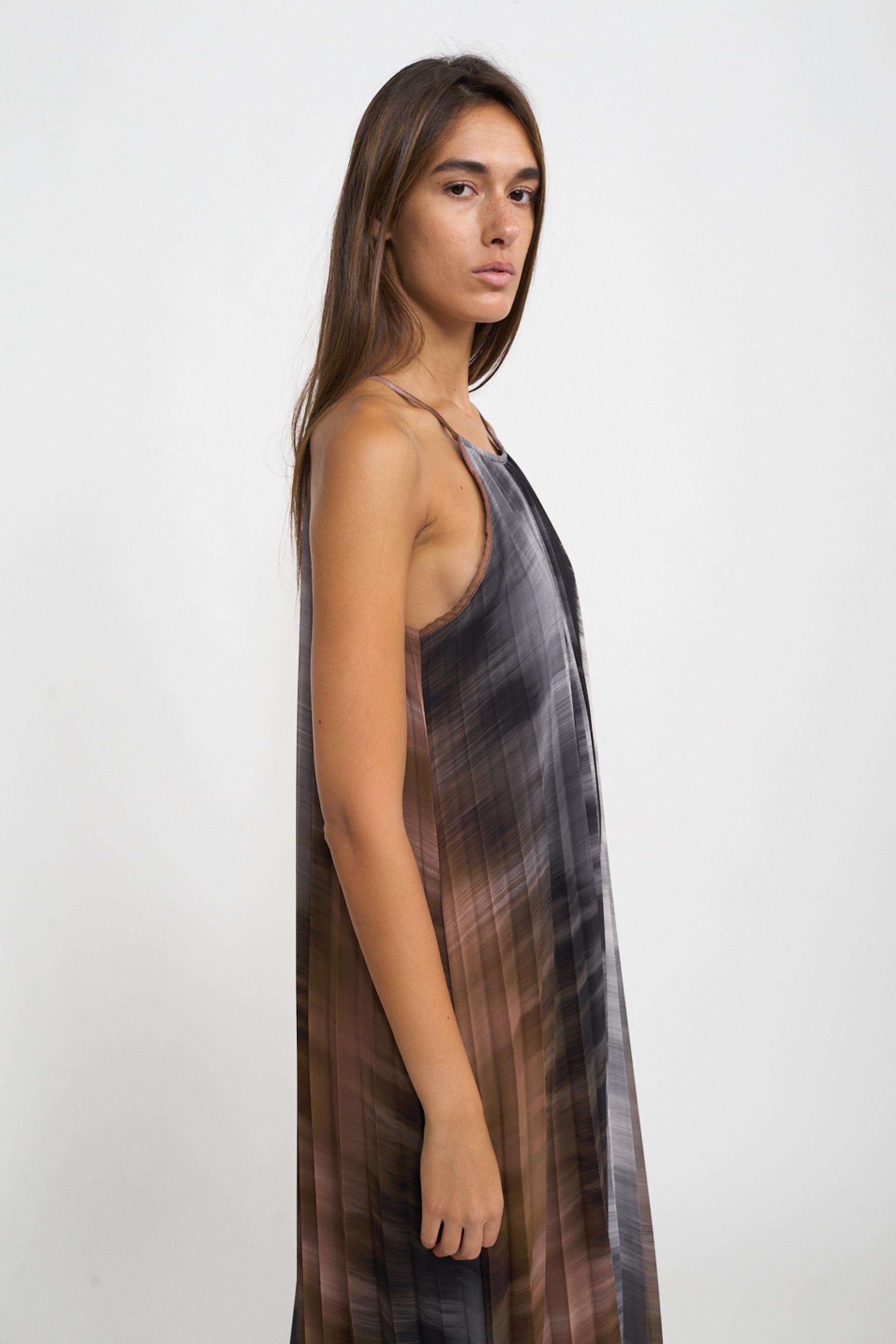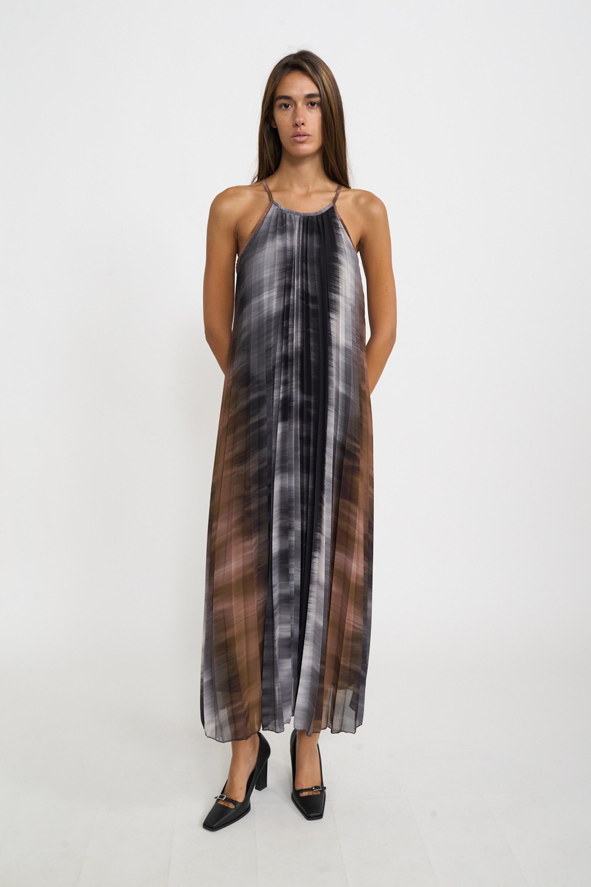 | Abito lungo in viscosa fantasia con lavorazione plissè. Fodera interna tono su tono. | ||