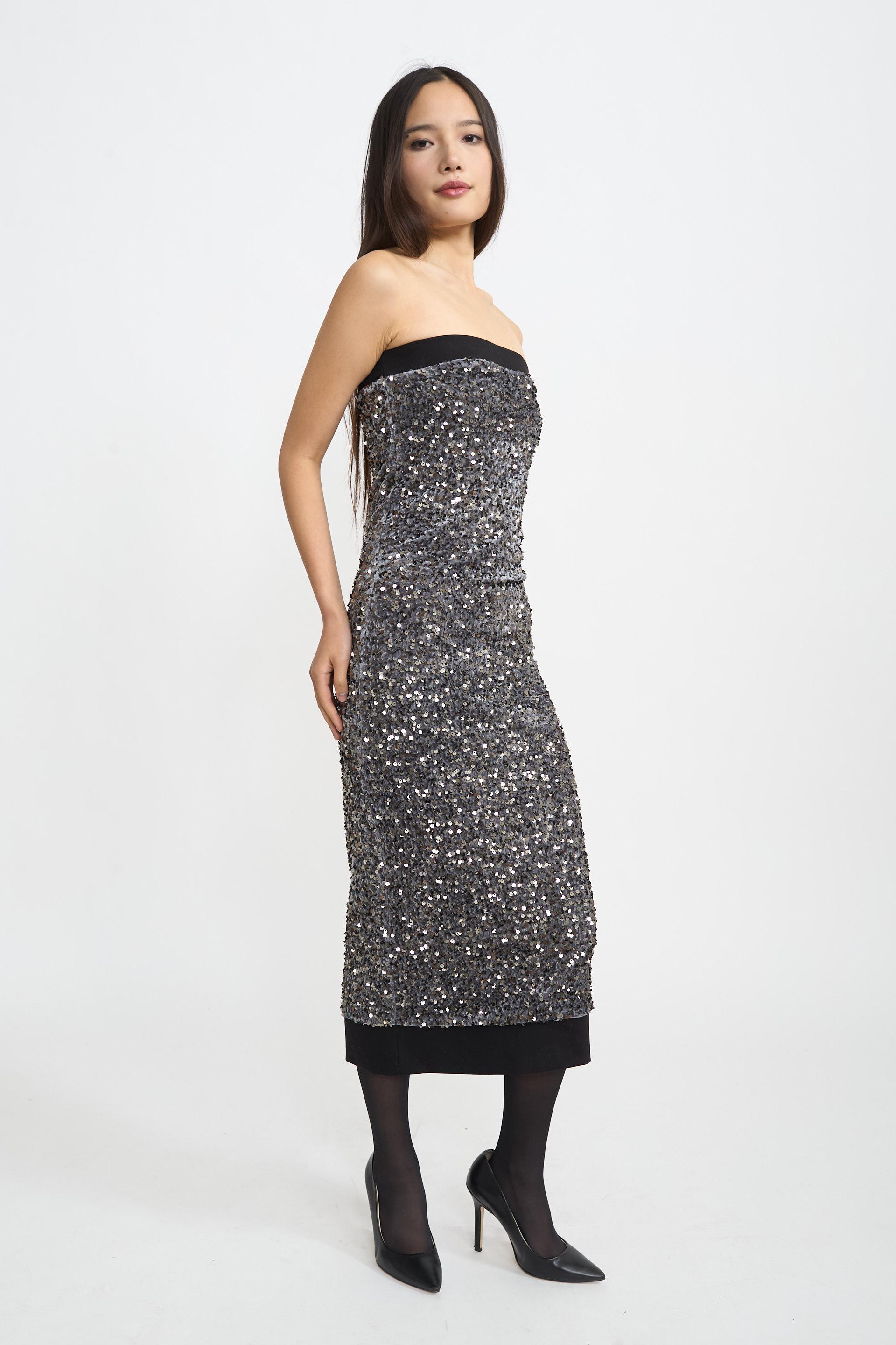 | Abito a fascia in paillettes con elastico su scollo e orlo. Fodera interna. | ||