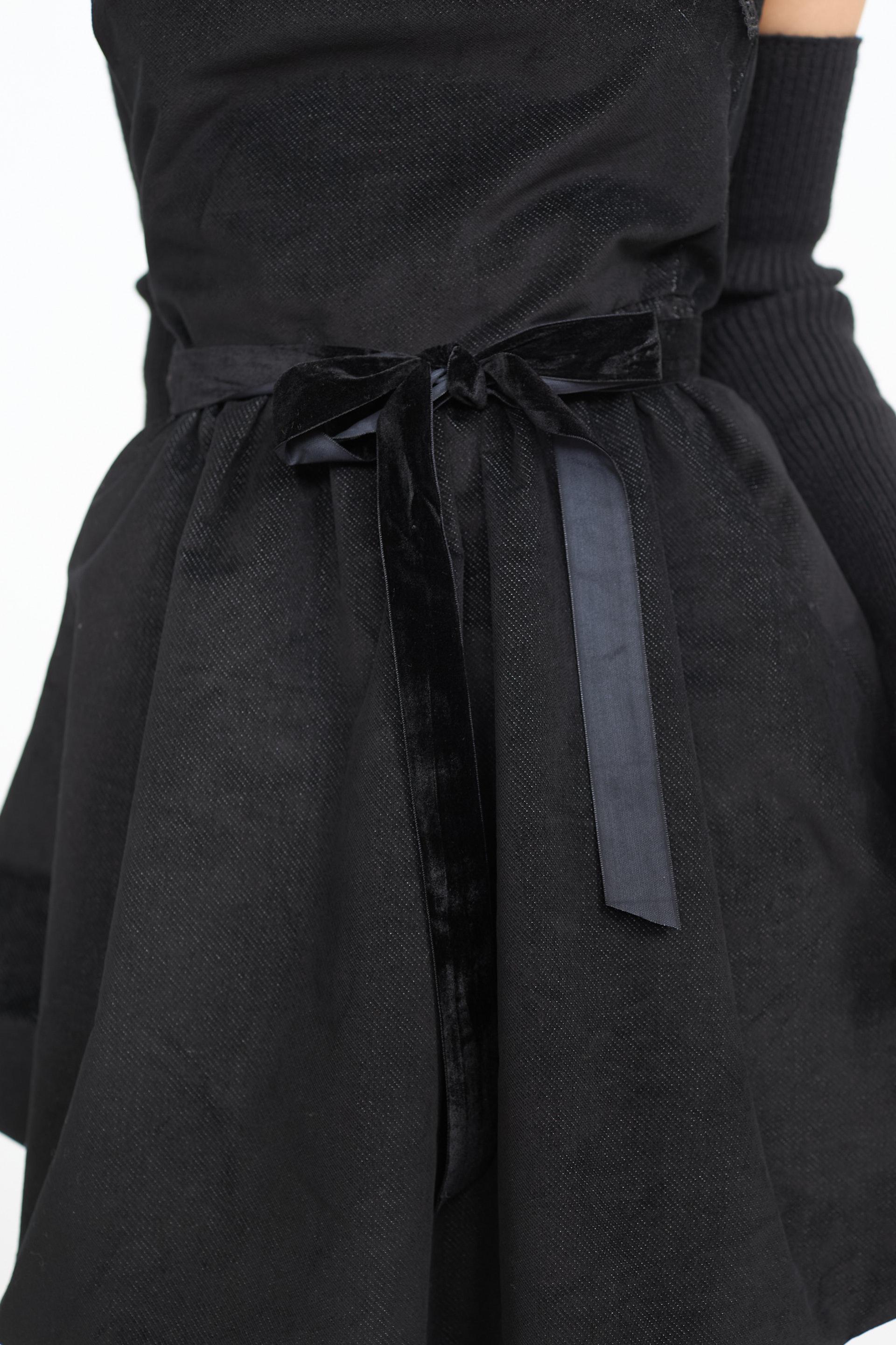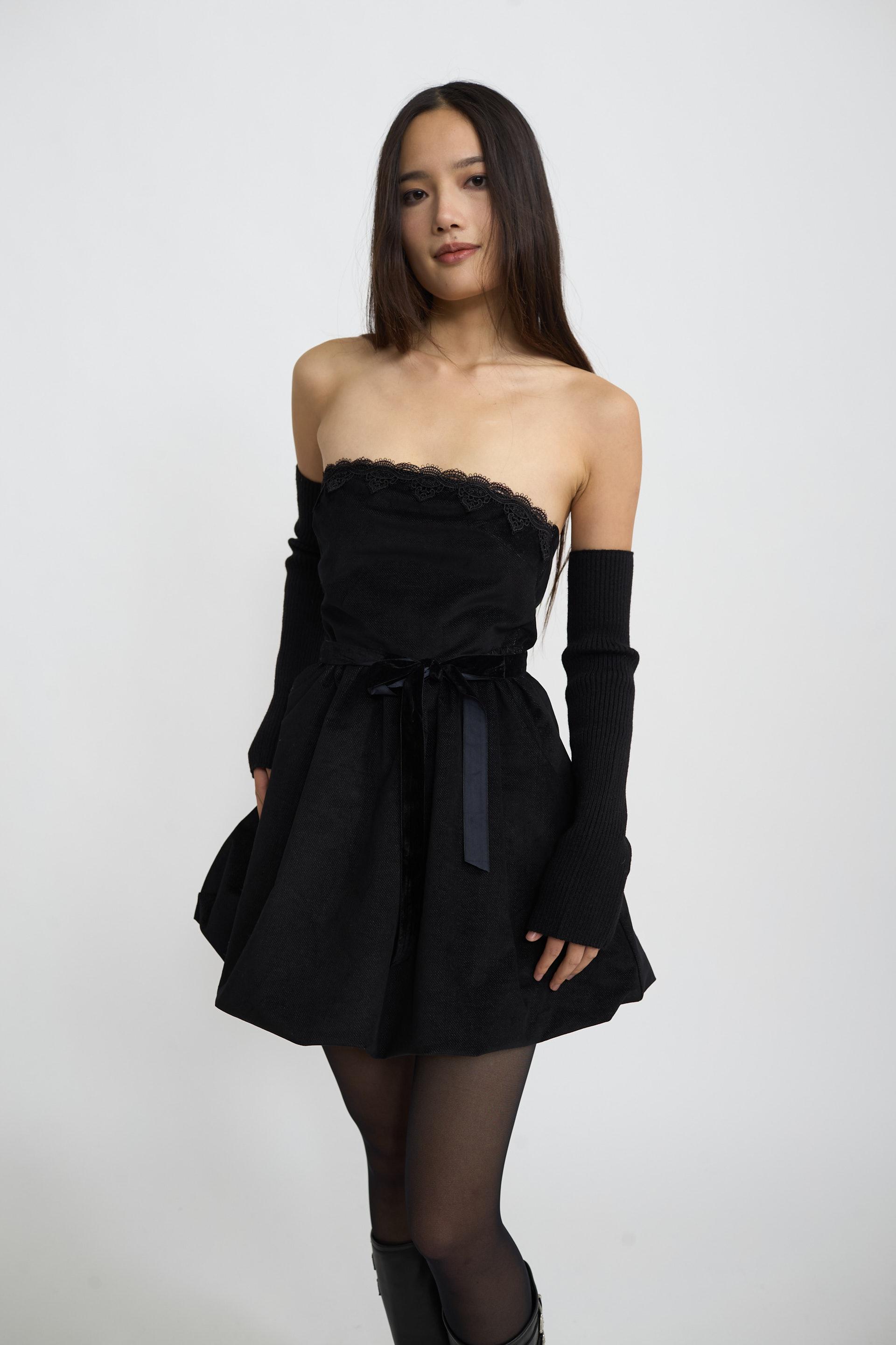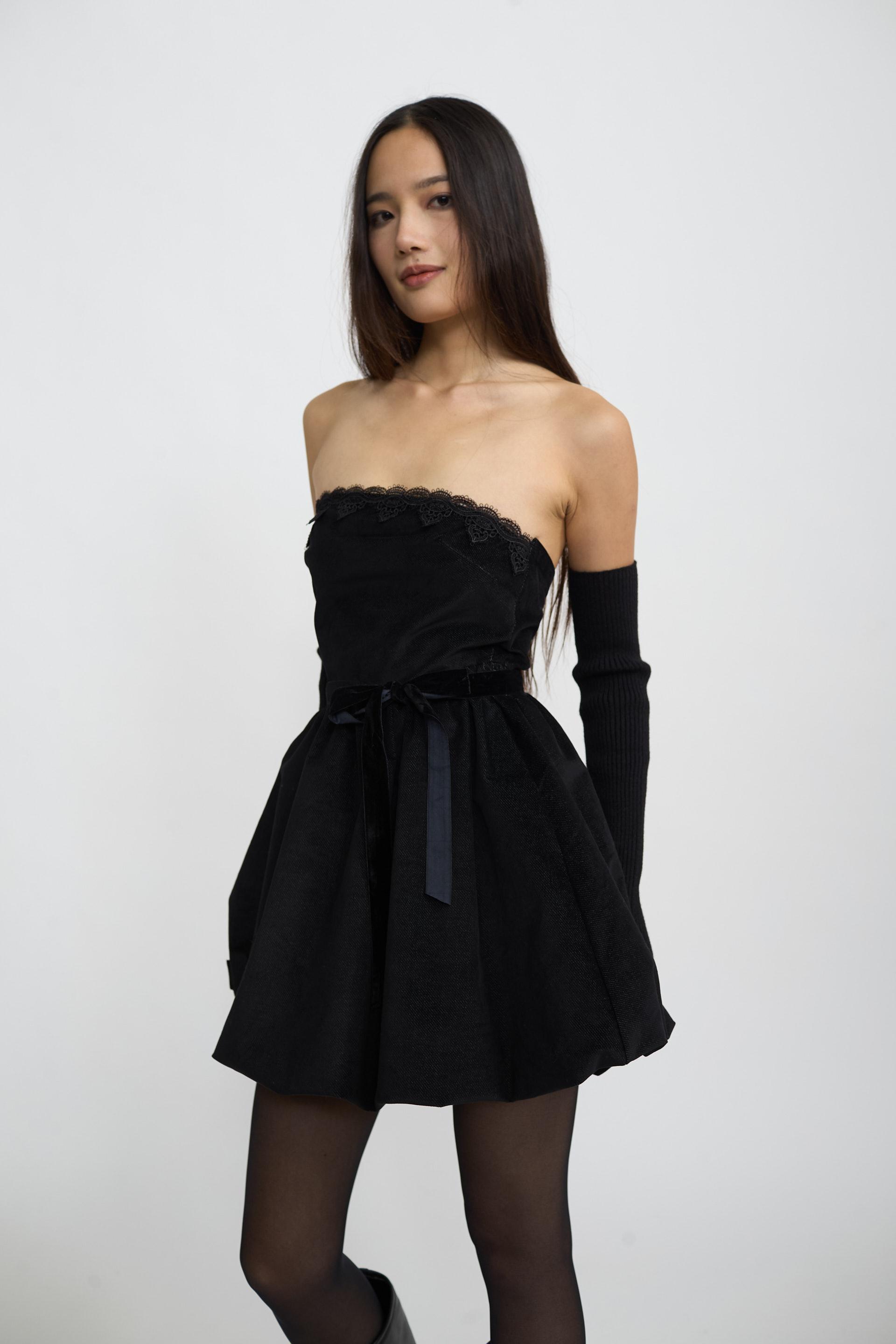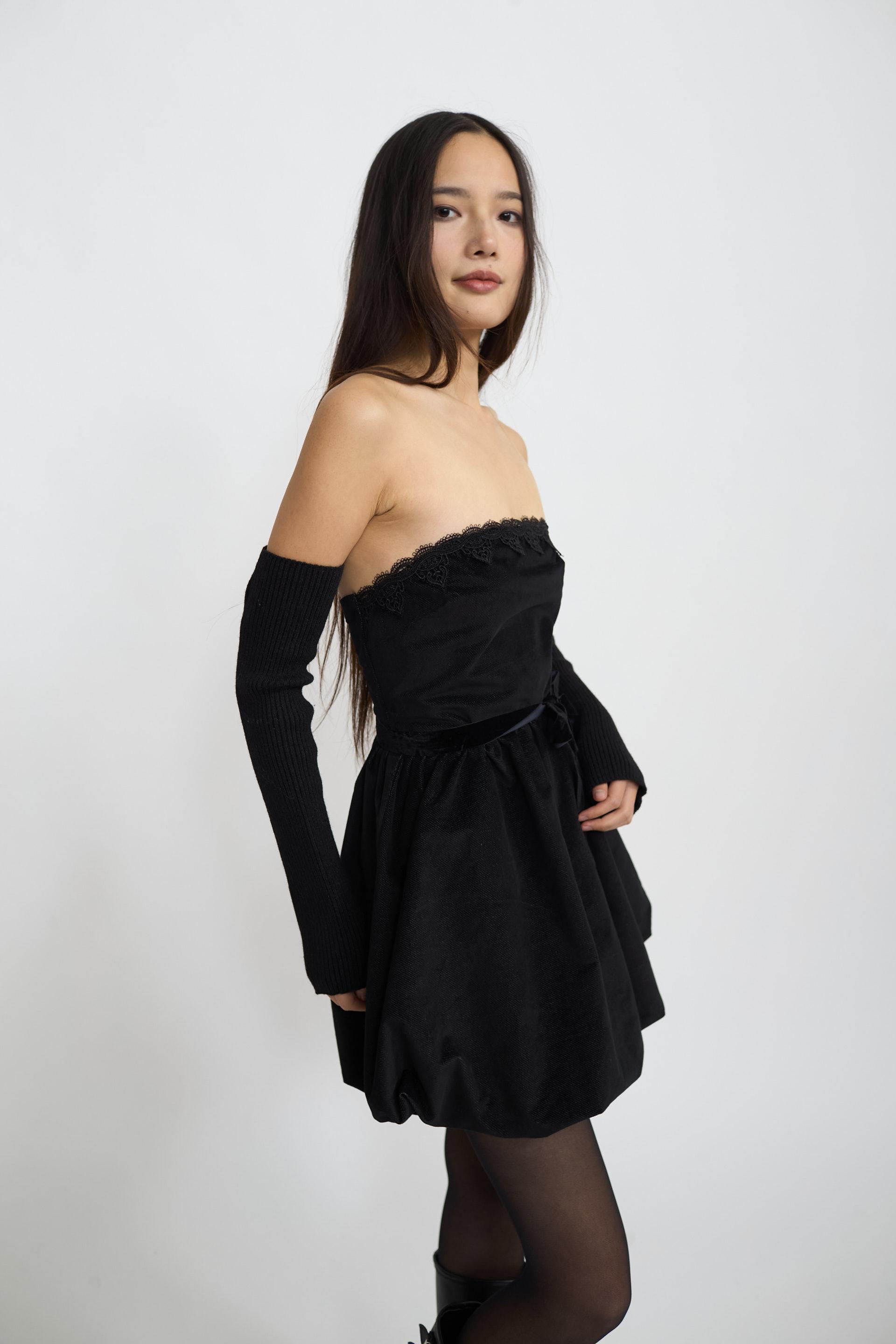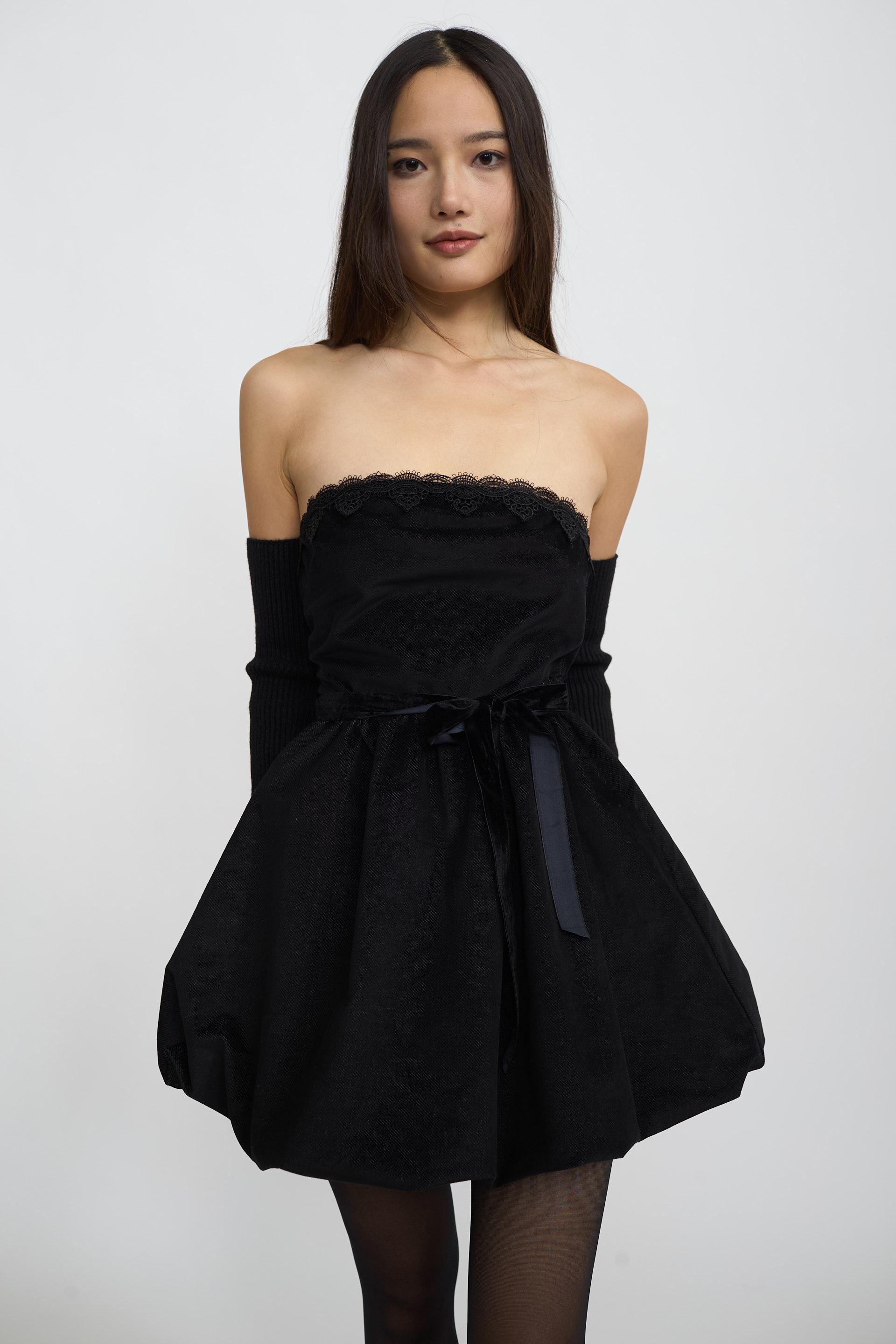 | Abito-mini palloncino mano velluto con dettaglio in pizzo su scollo. Cinta in ciniglia e fodera interna. Chiusura posteriore tramite cerniera. | ||