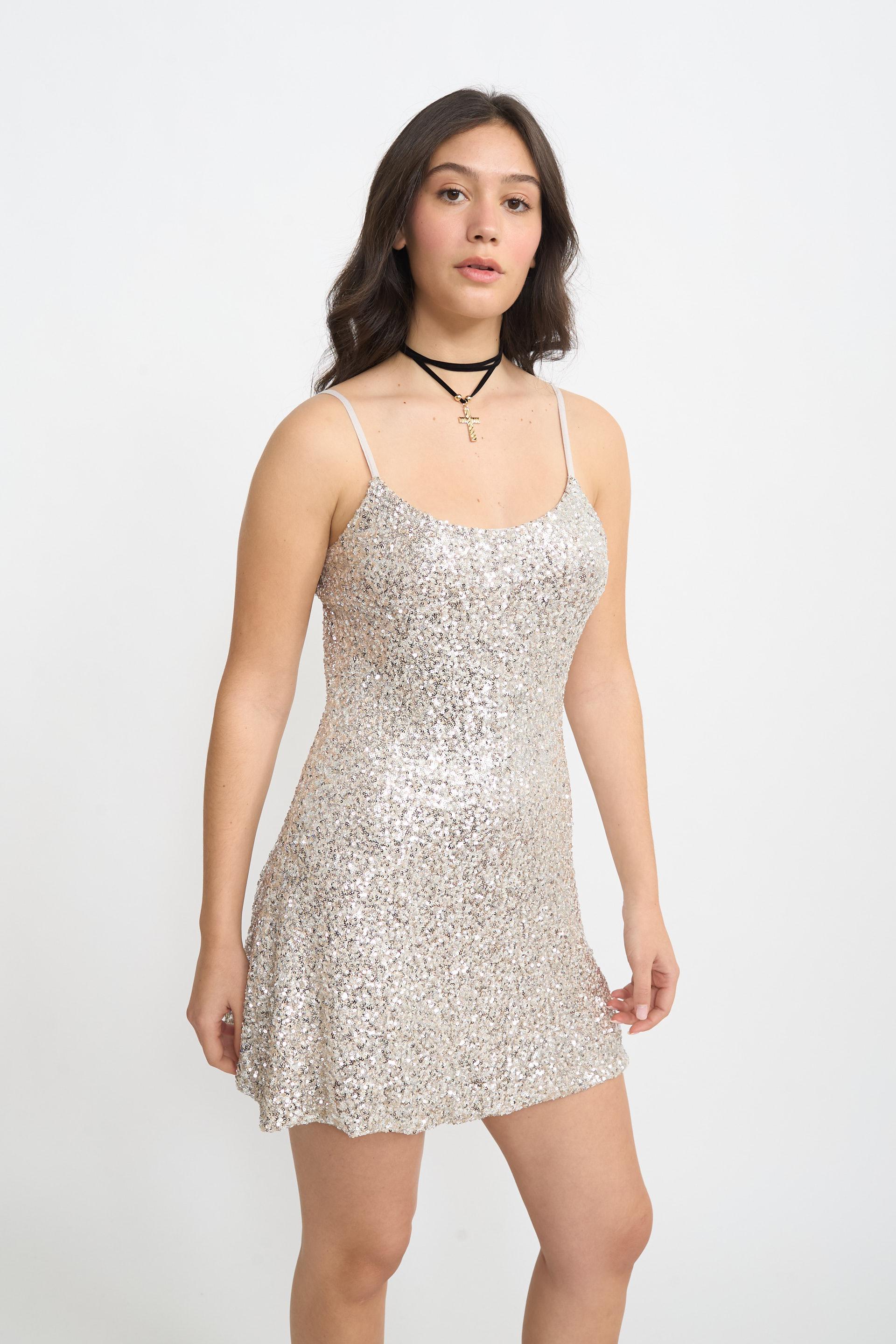 | Abito-mini con bretelline in paillettes. Fodera interna. | ||