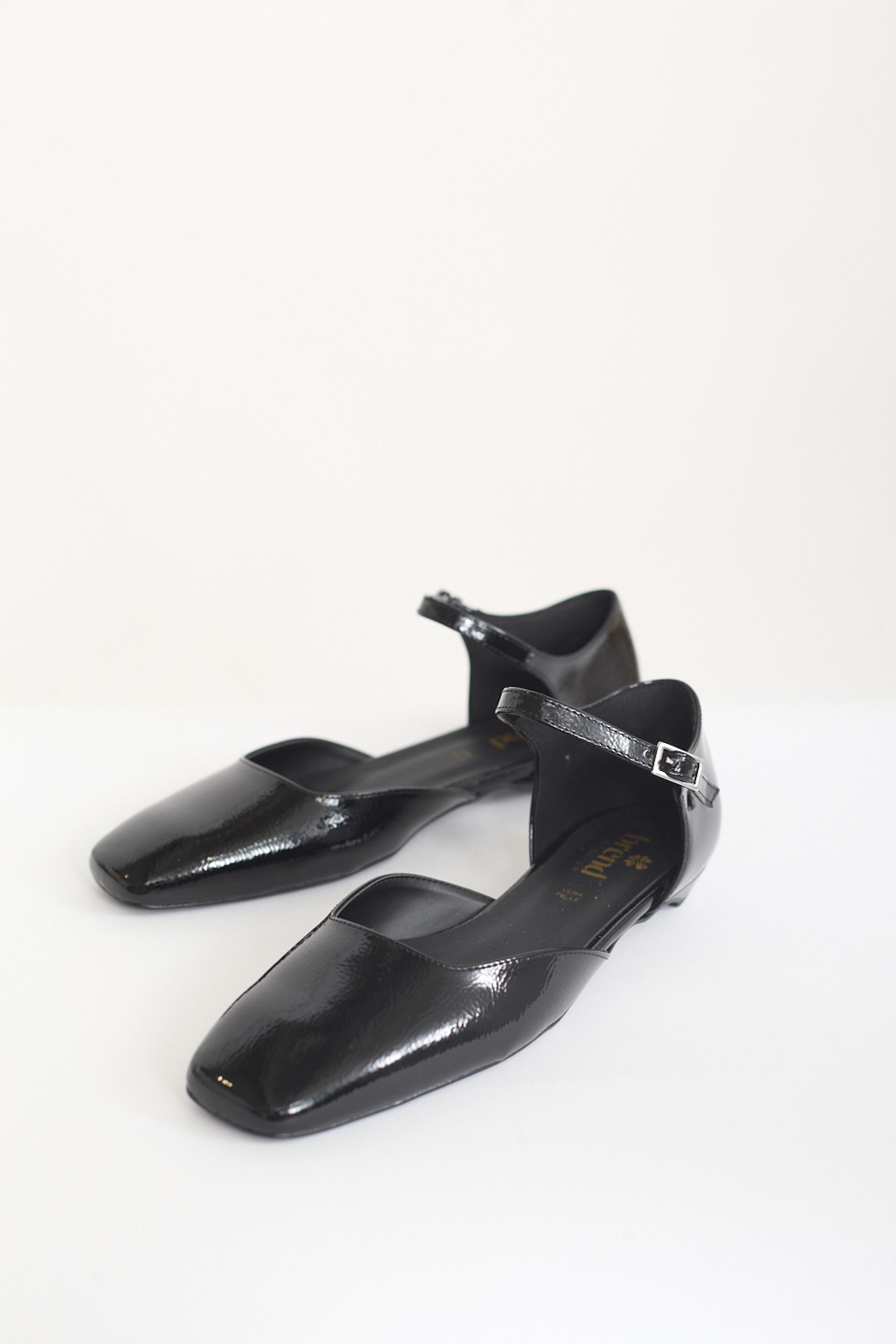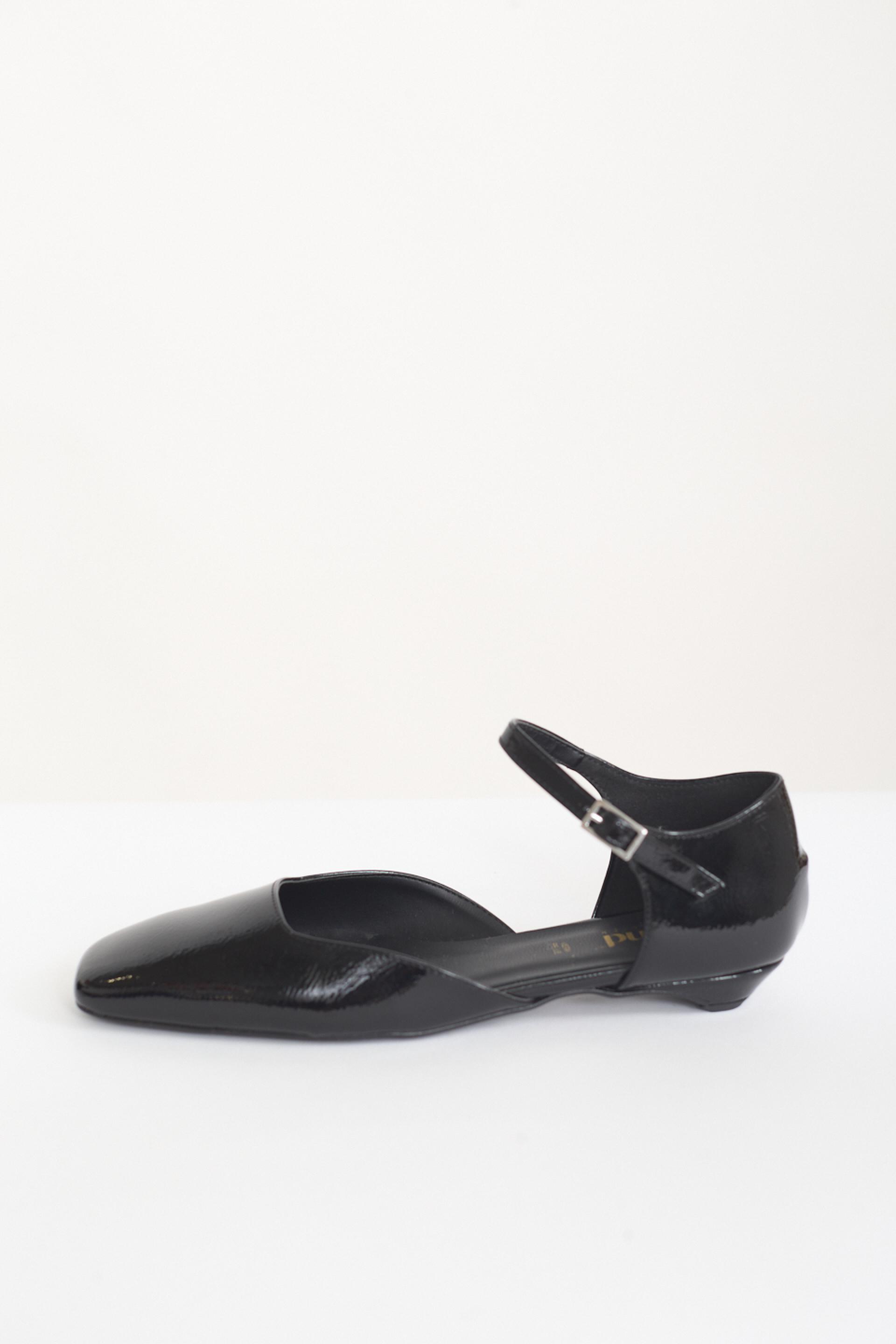 | Ballerina aperta con punta squadrata. Chiusura tramite cinturino con fibbia. Tacco altezza 2 cm. | ||