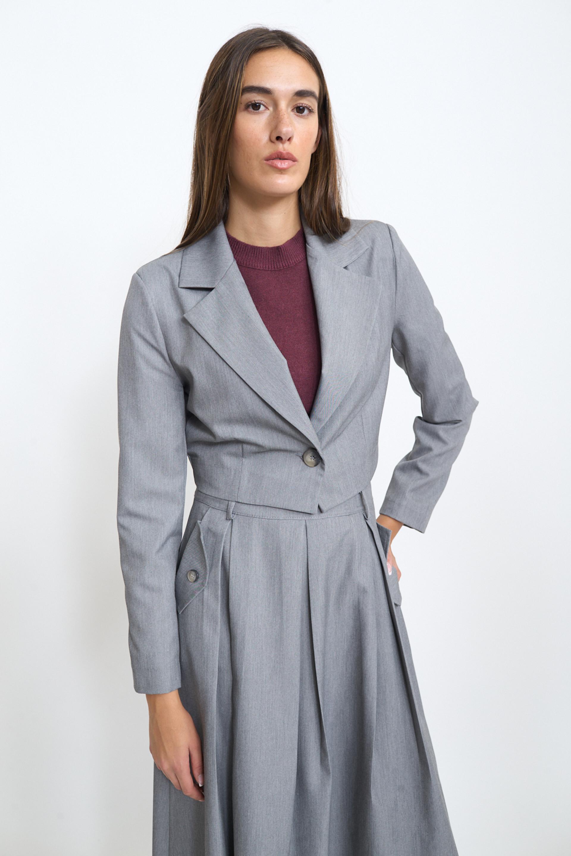 | Blazer corto collo revers avvitato con spalline imbottite. Fodera interna tono su tono e chiusura tramite 1 bottone. | ||
