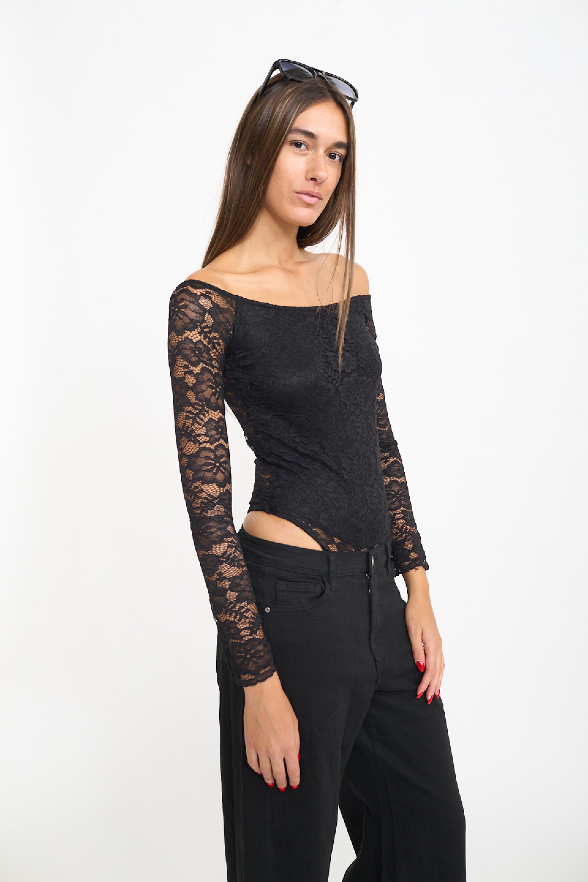 | Body scollo barca a manica lunga in pizzo fantasia floreale. Fodera interna in viscosa tono su tono. Chiusura tramite bottoni automatici. | ||