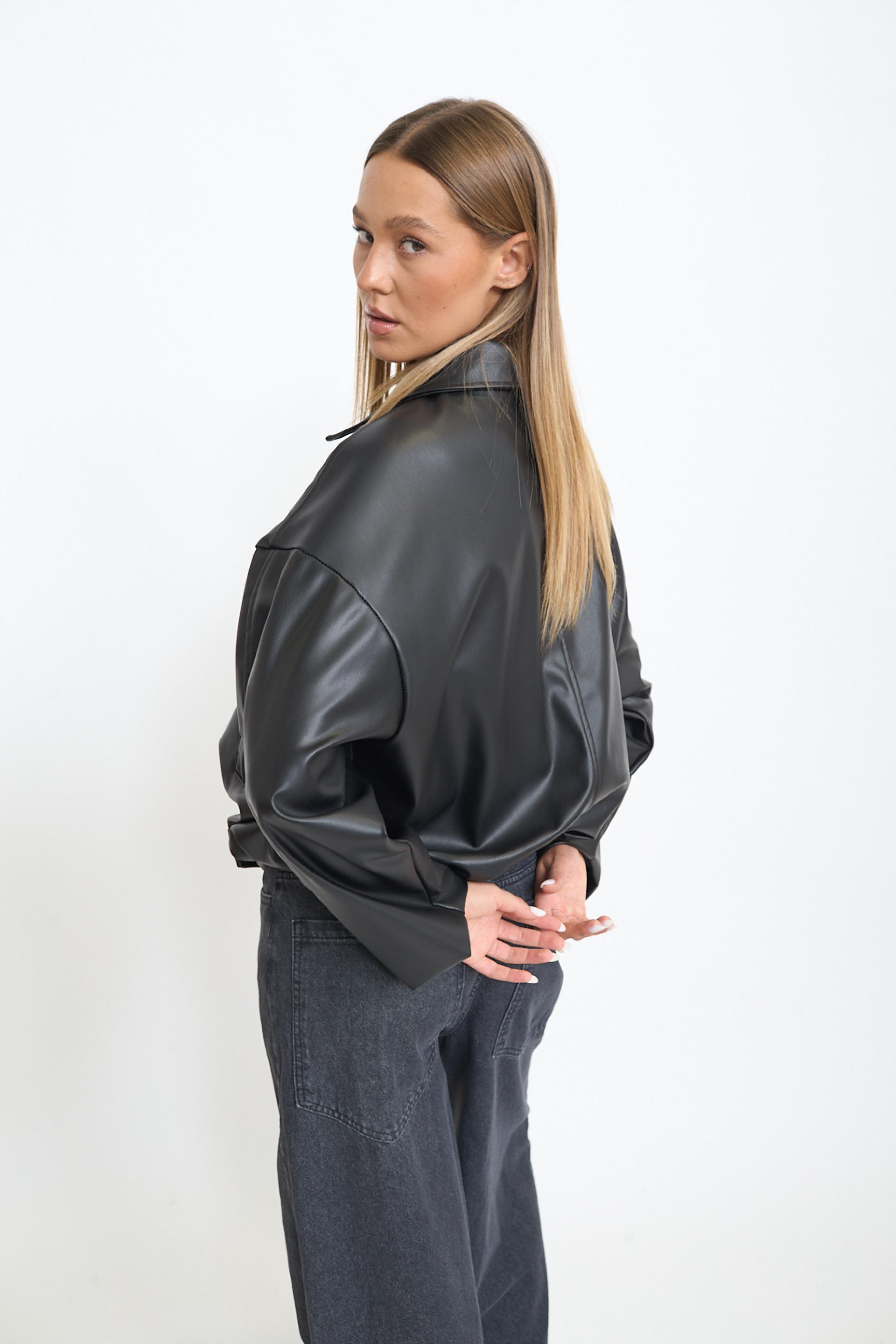 | Bomber effetto pelle con tasche laterali e arricciature in vita. Chiusura tramite zip frontale e porzione di cinta con fibbia. Fodera interna. | ||