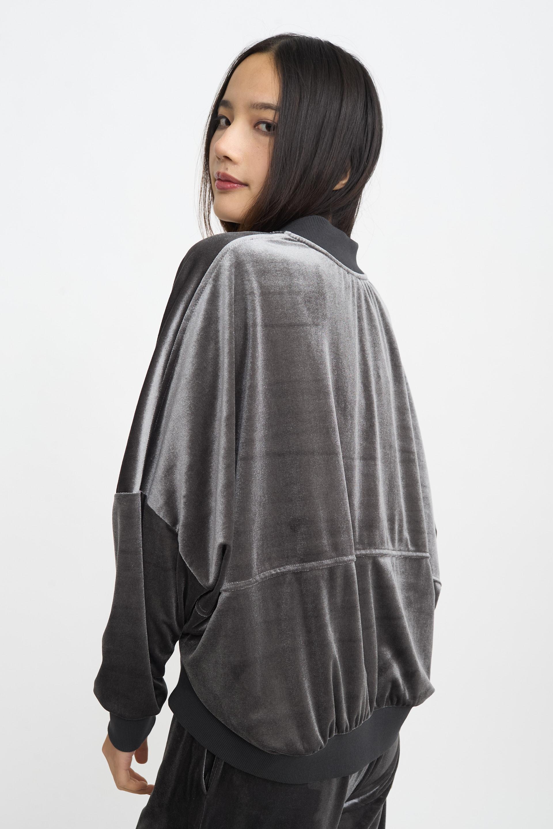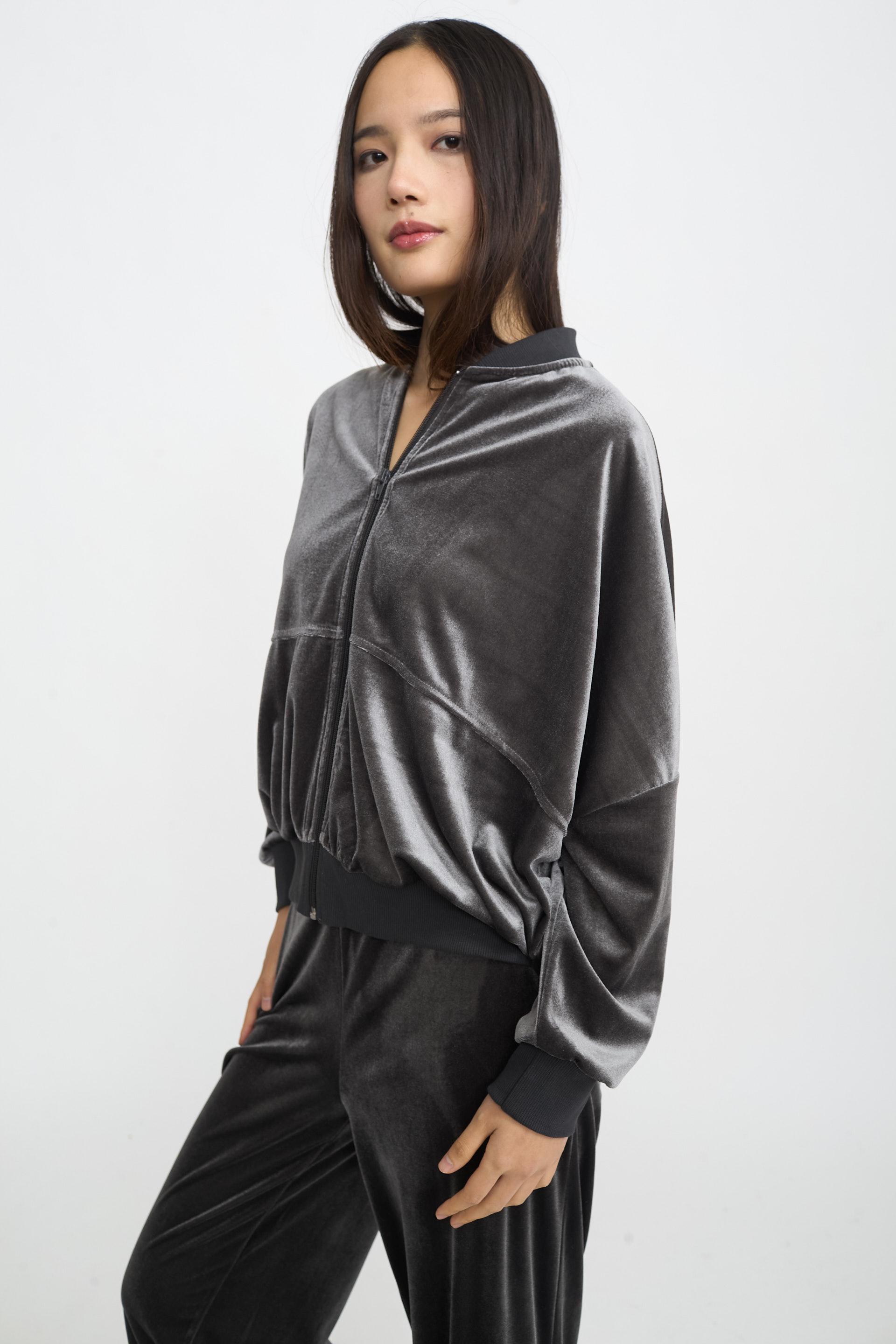 | Bomber con zip in ciniglia. Dettaglio di lavorazione in felpa a costine su scollo, polsini e orlo. | ||