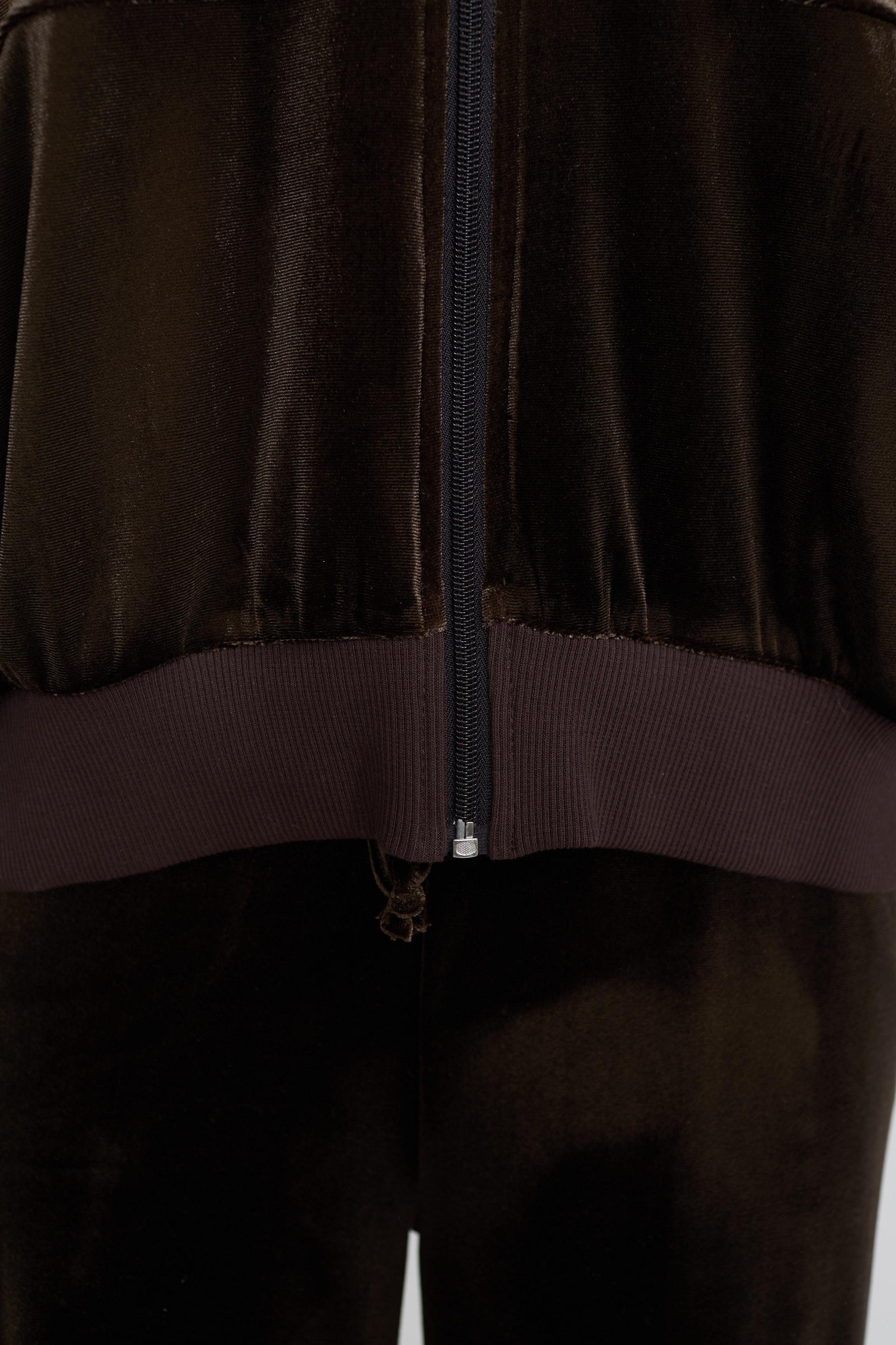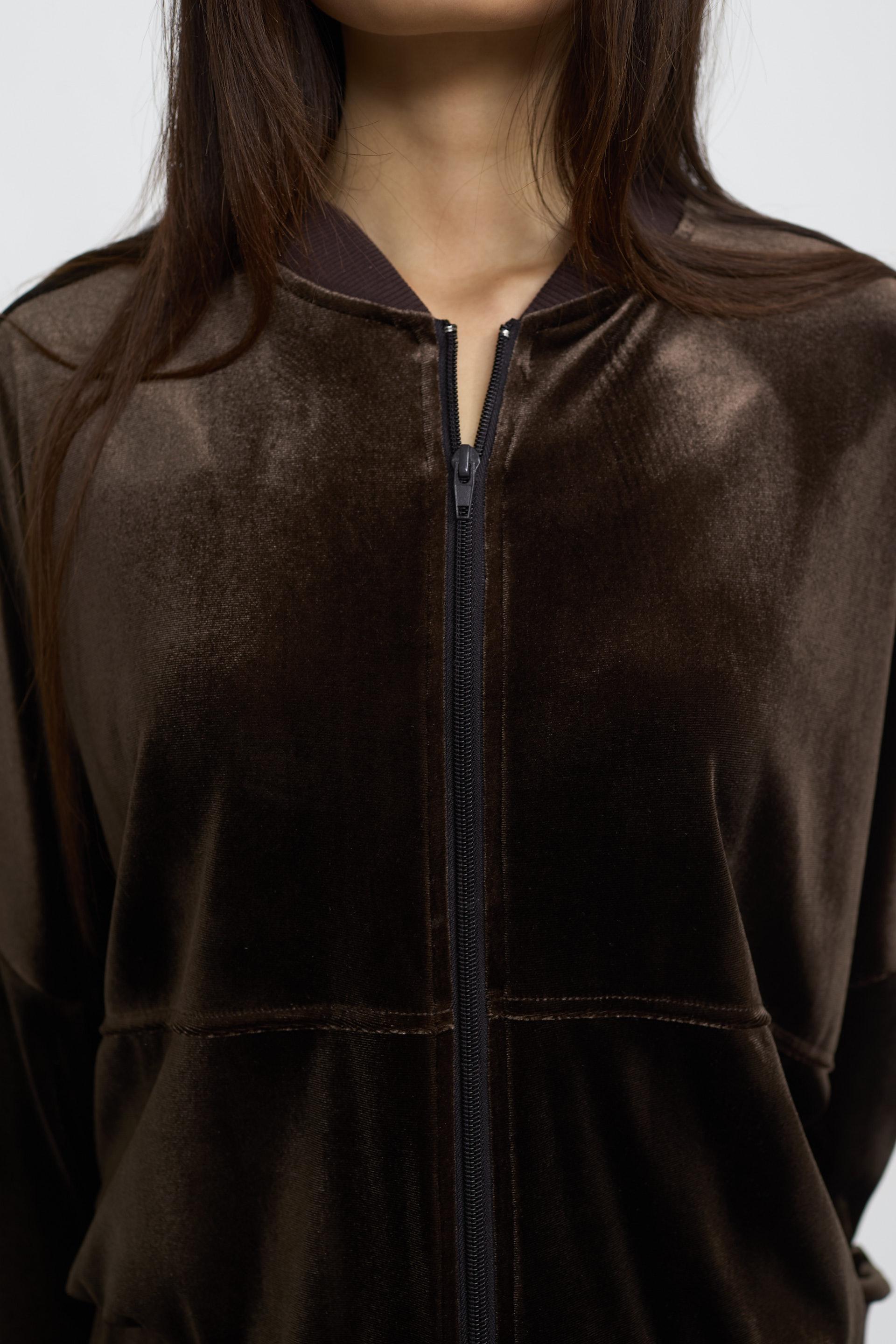 | Bomber con zip in ciniglia. Dettaglio di lavorazione in felpa a costine su scollo, polsini e orlo. | ||