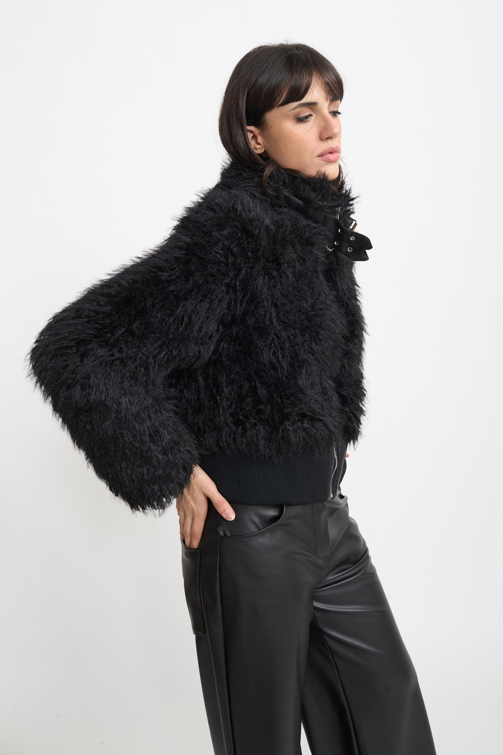 | Bomber crop in ecofur con fascia in vita elastica a costine. Dettaglio di doppia fibbia al collo. Fodera interna e chiusura tramite zip. | ||