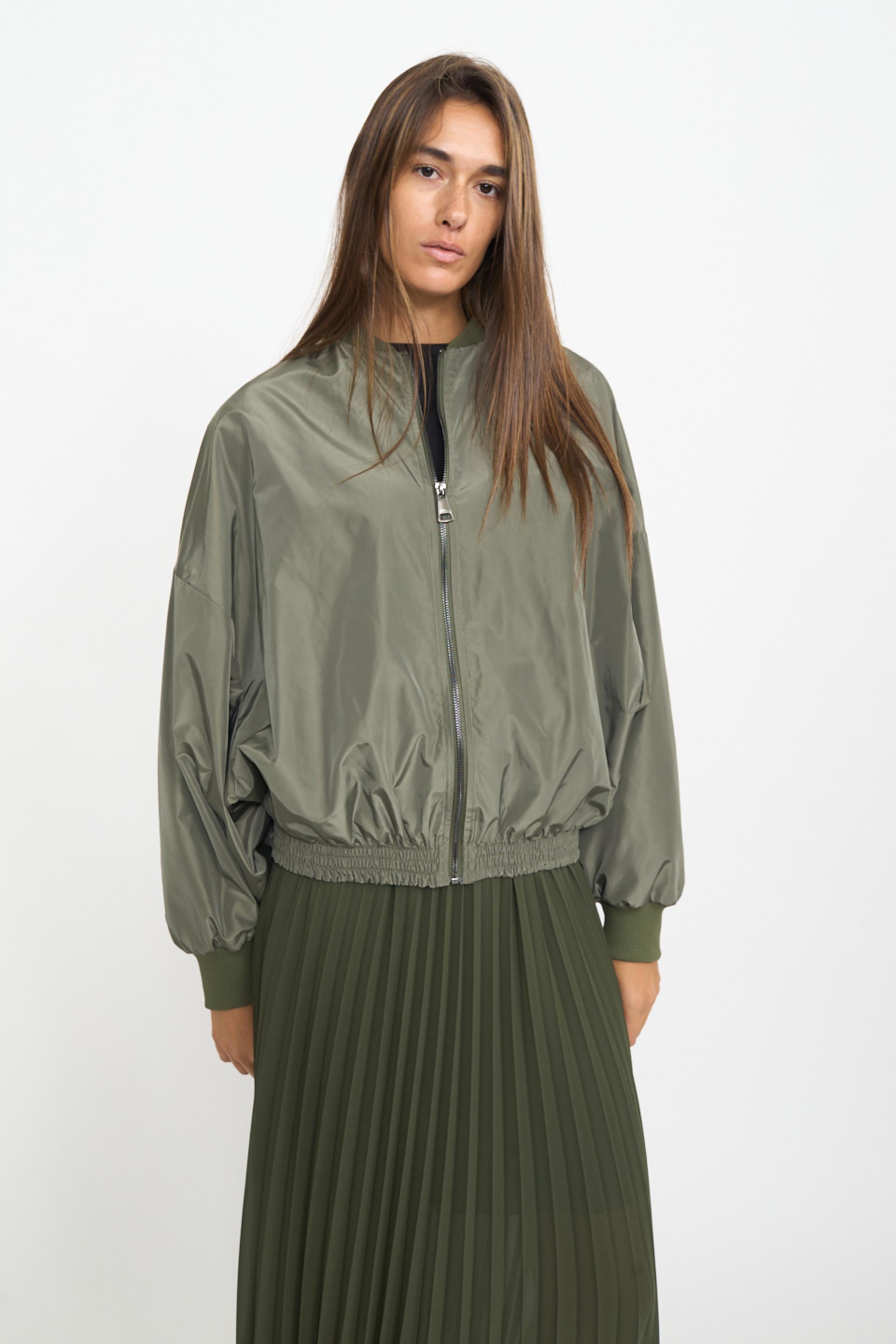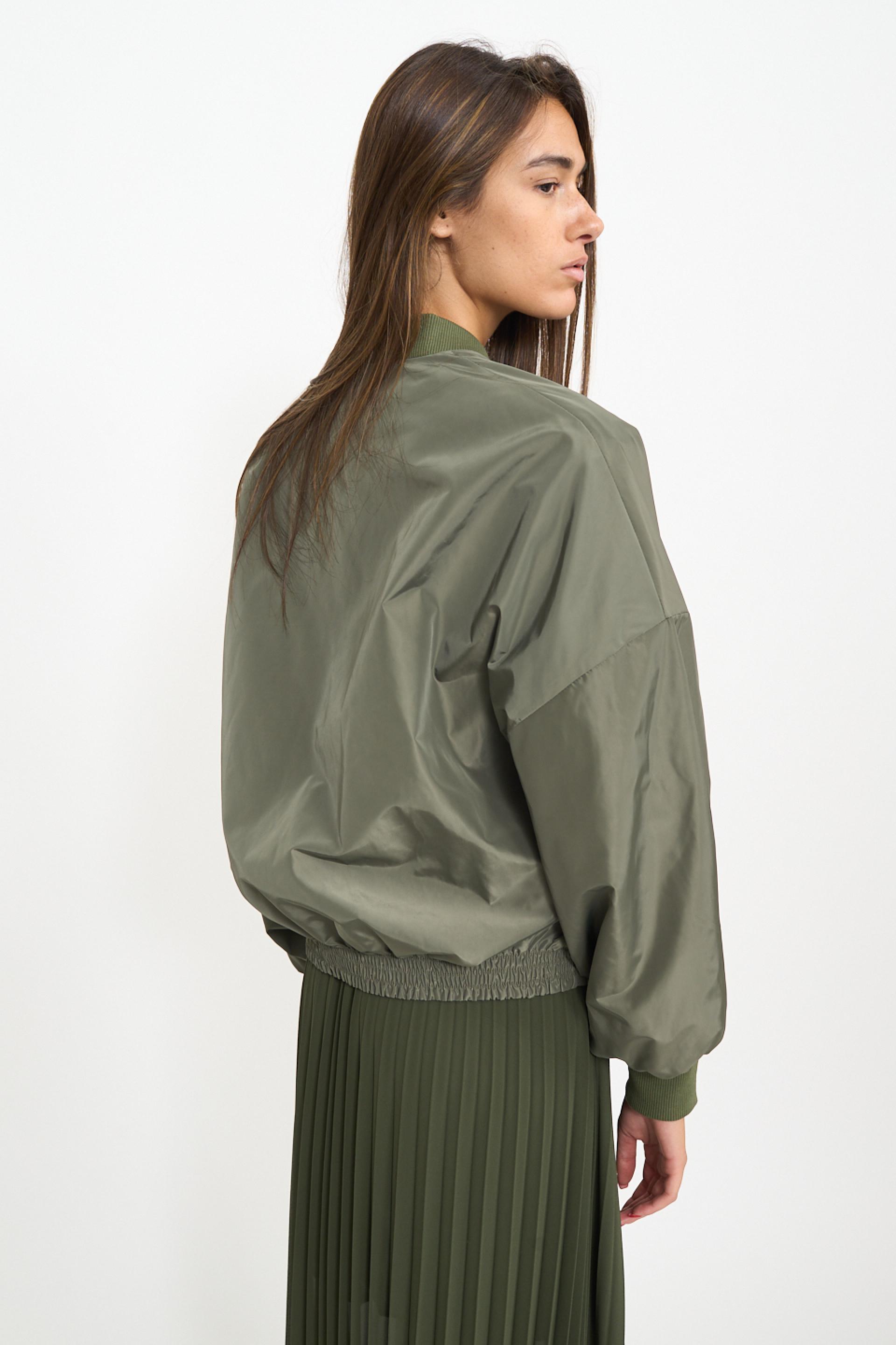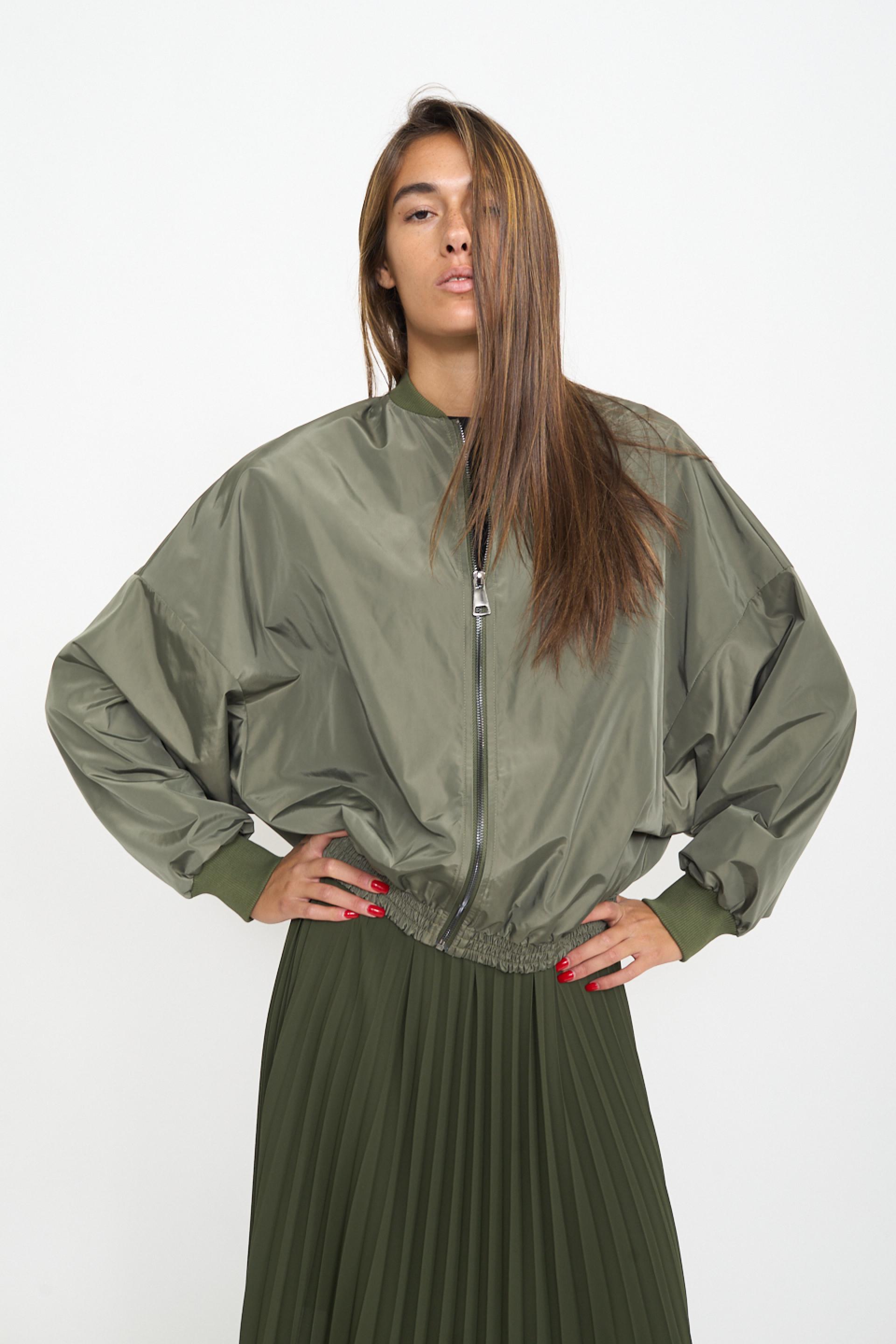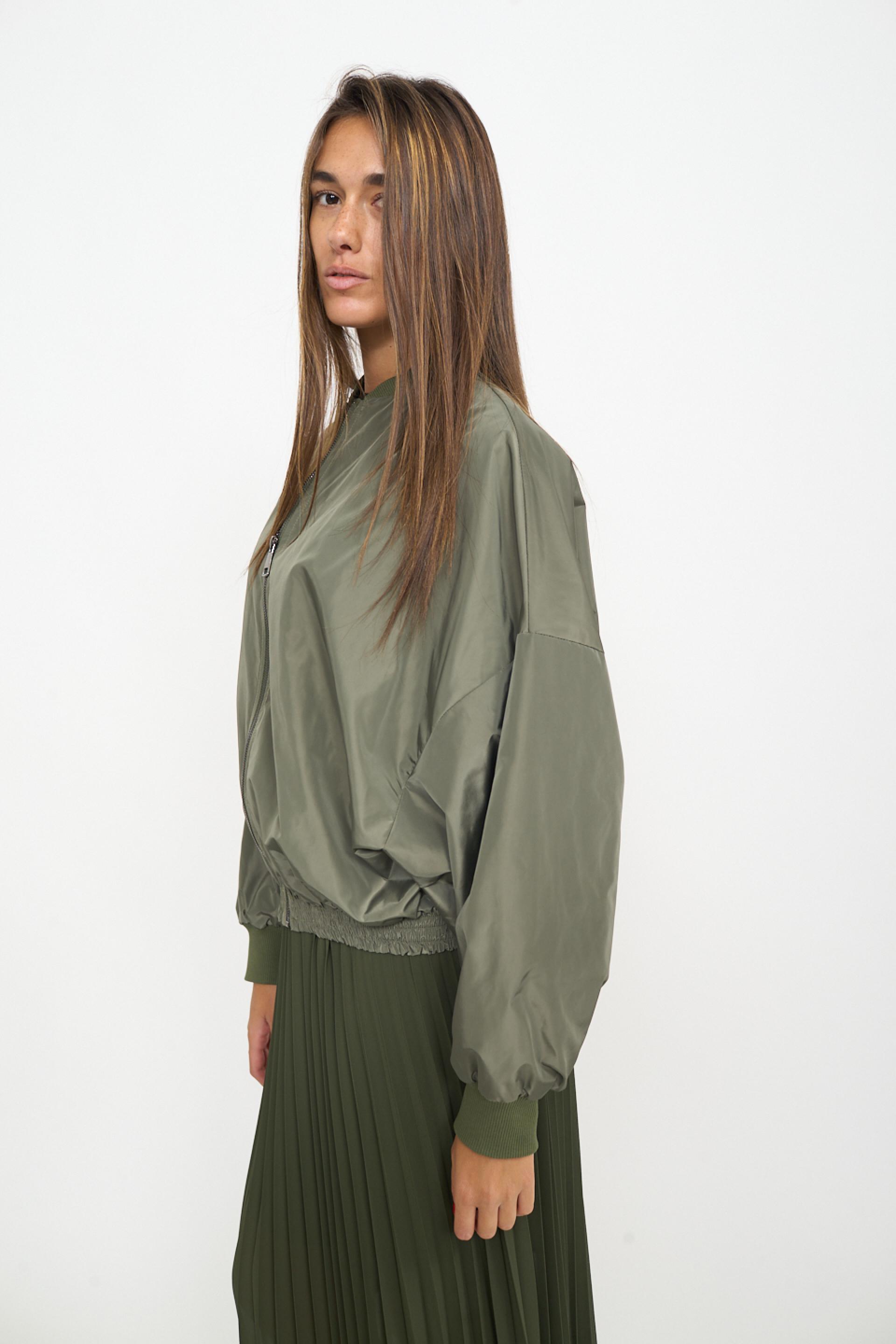 | Bomber over con manica scesa ed elastico in vita. Elastico lavorato a costine su collo e polsini. Fodera interna tono su tono. Chiusura frontale tramite zip. | ||