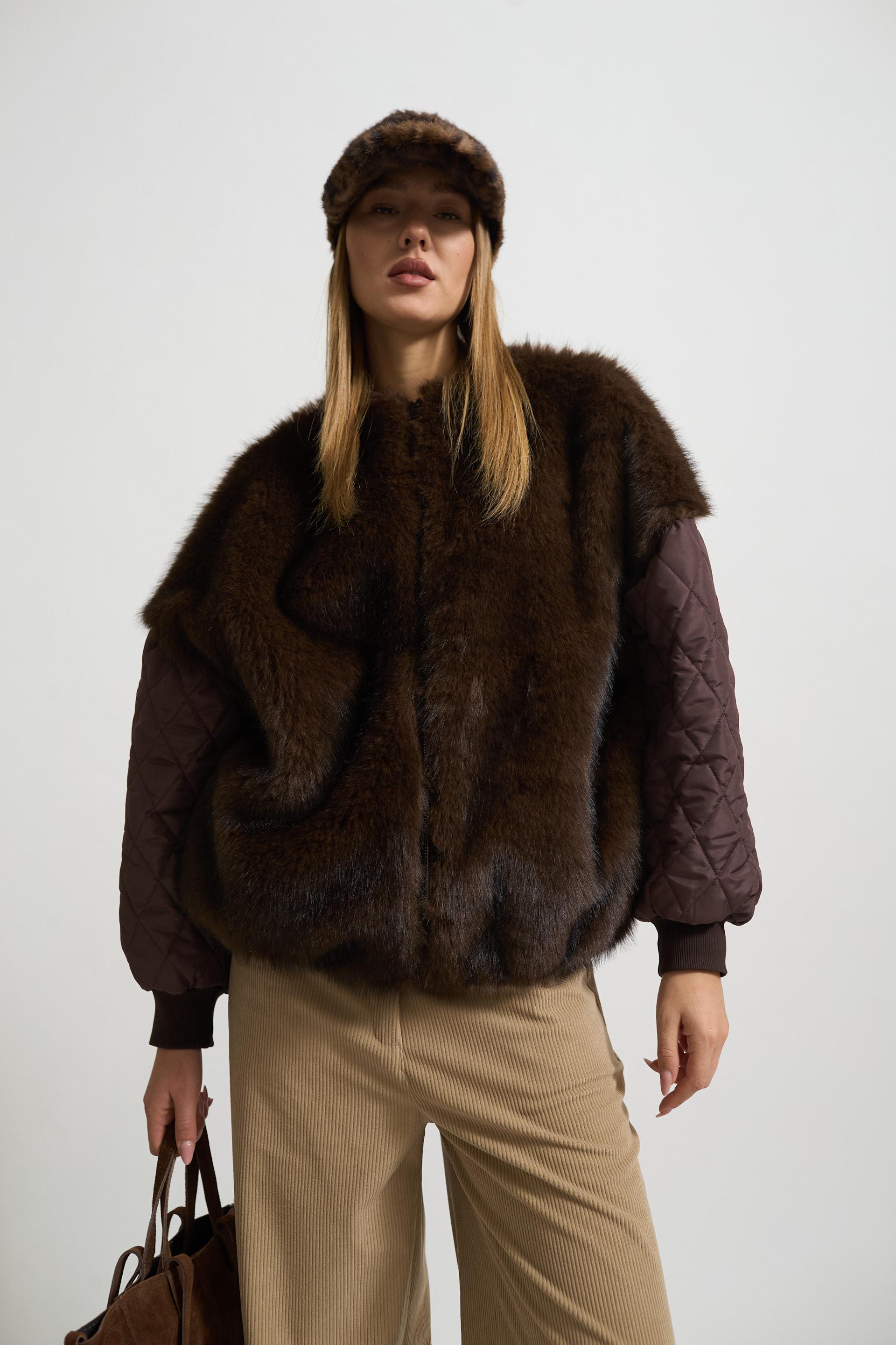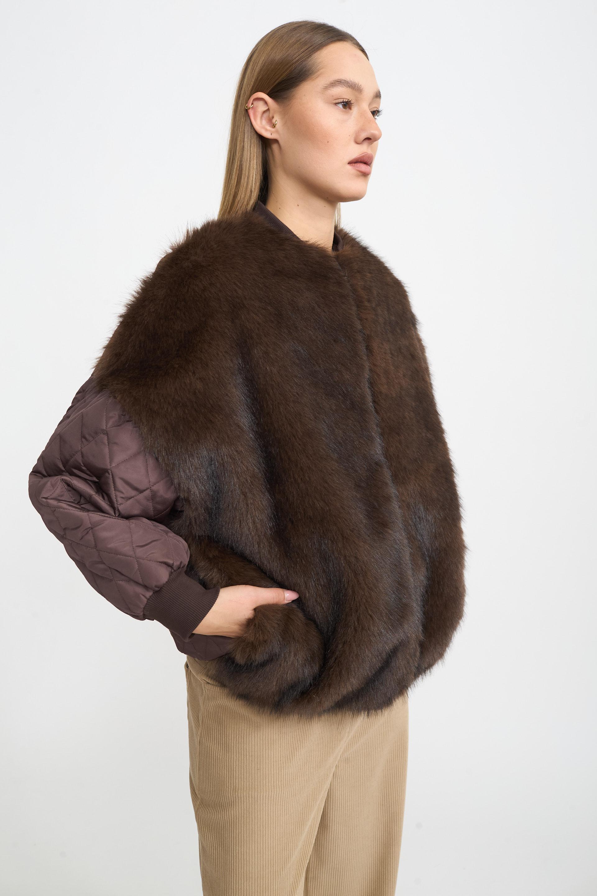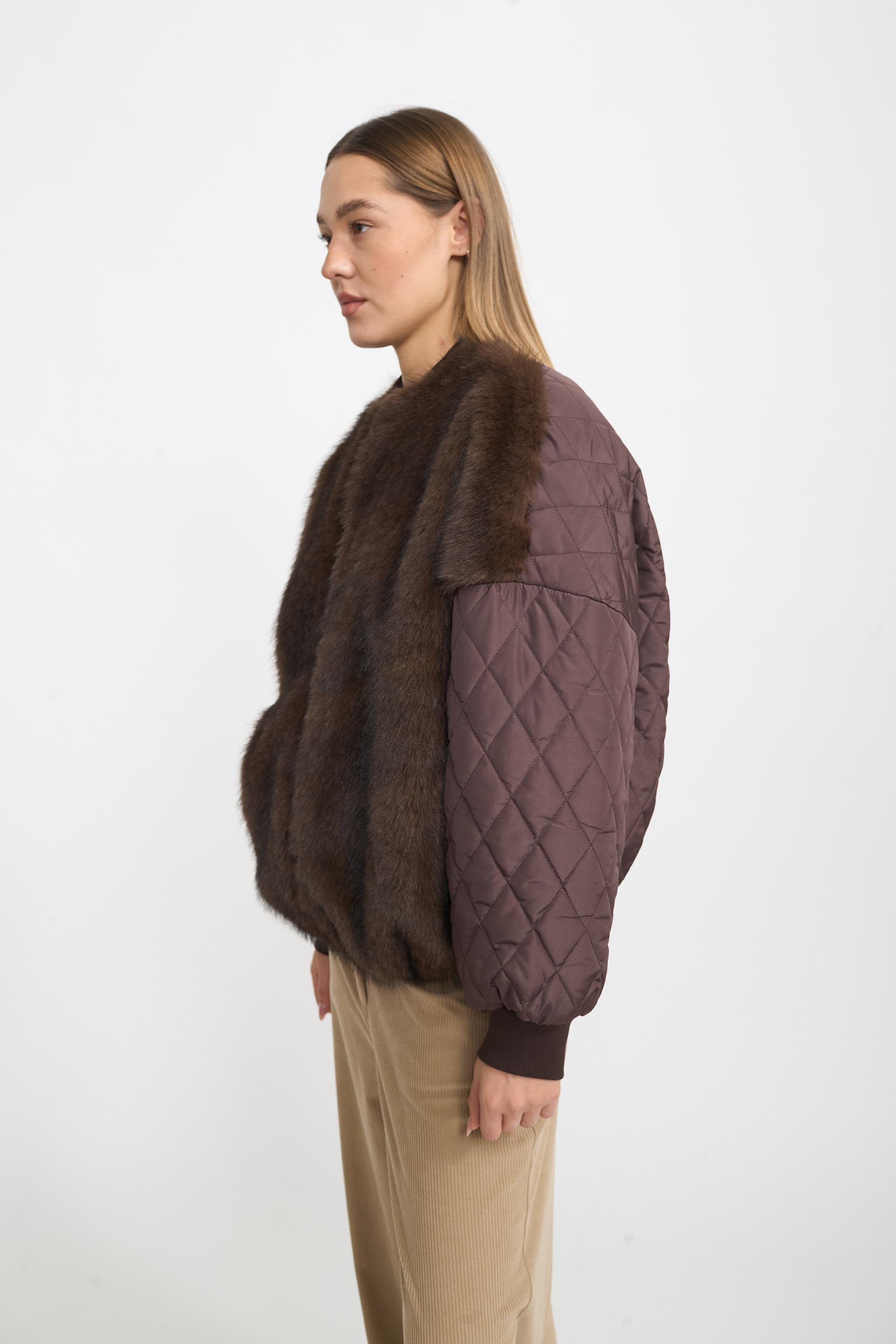 | Bomber trapuntato con frontale in ecofur. Tasche laterali e fodera interna. Chiusura tramite zip. | ||
