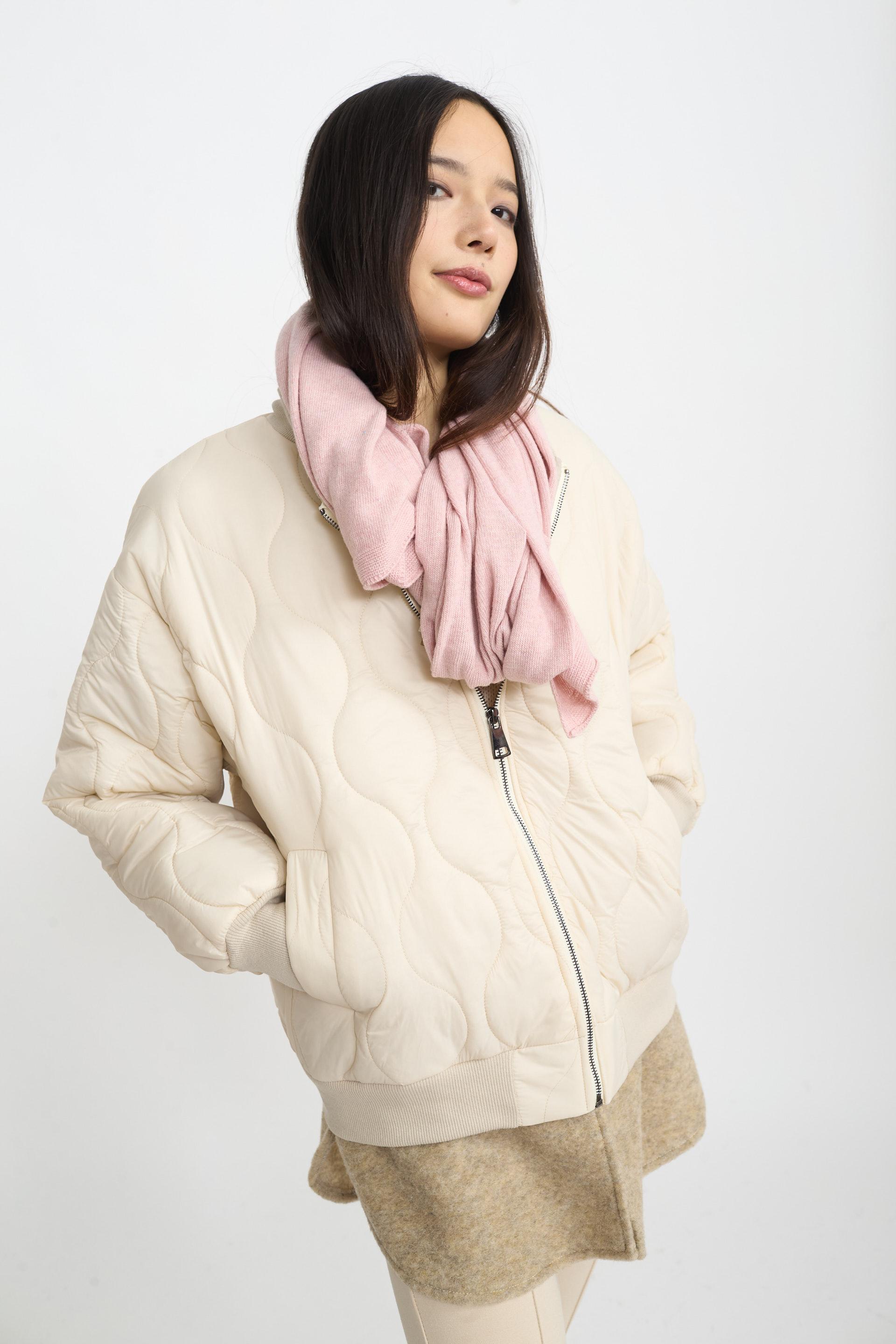 | Bomber trapuntato con dettaglio di porzione in panno. Lavorazione in felpa a costine su collo, polsini e orlo. Chiusura tramite zip centrale. | ||