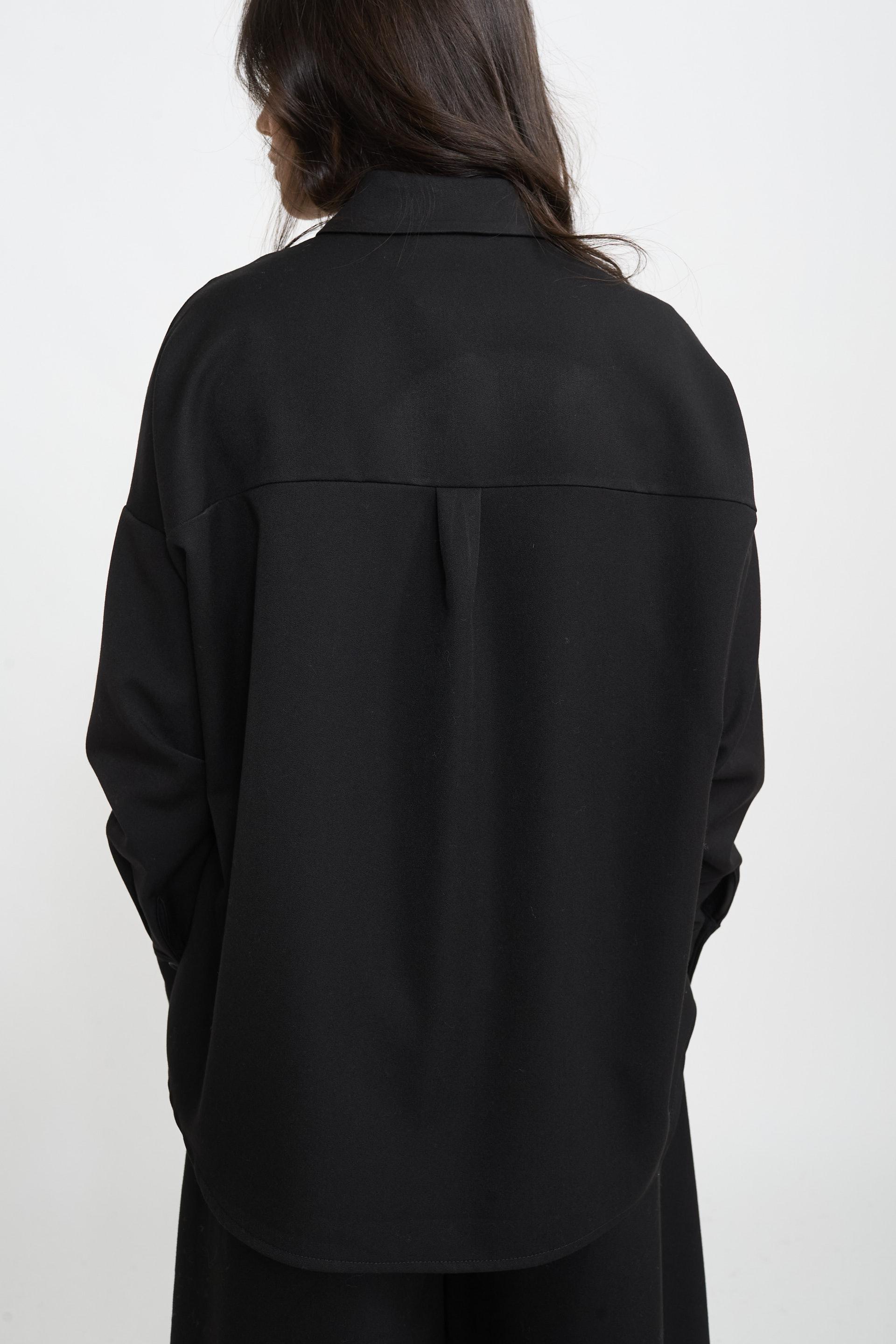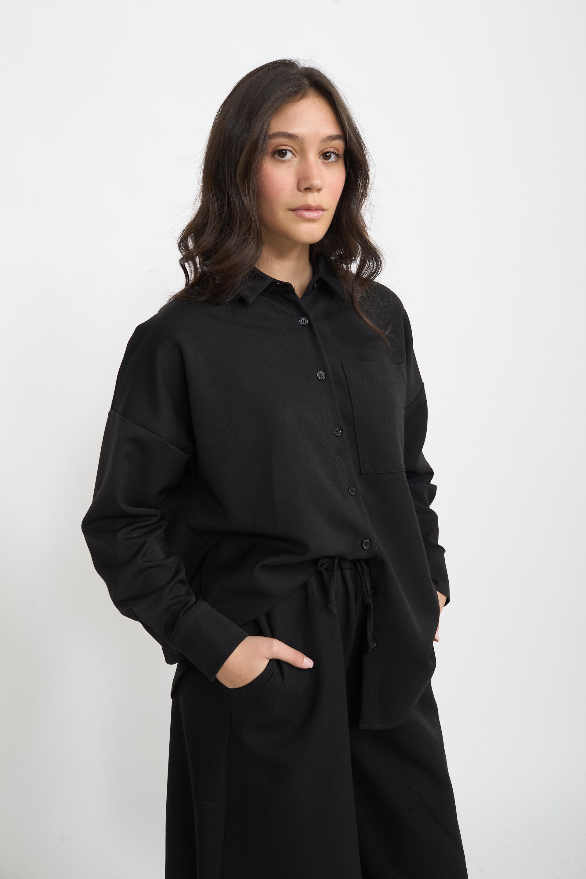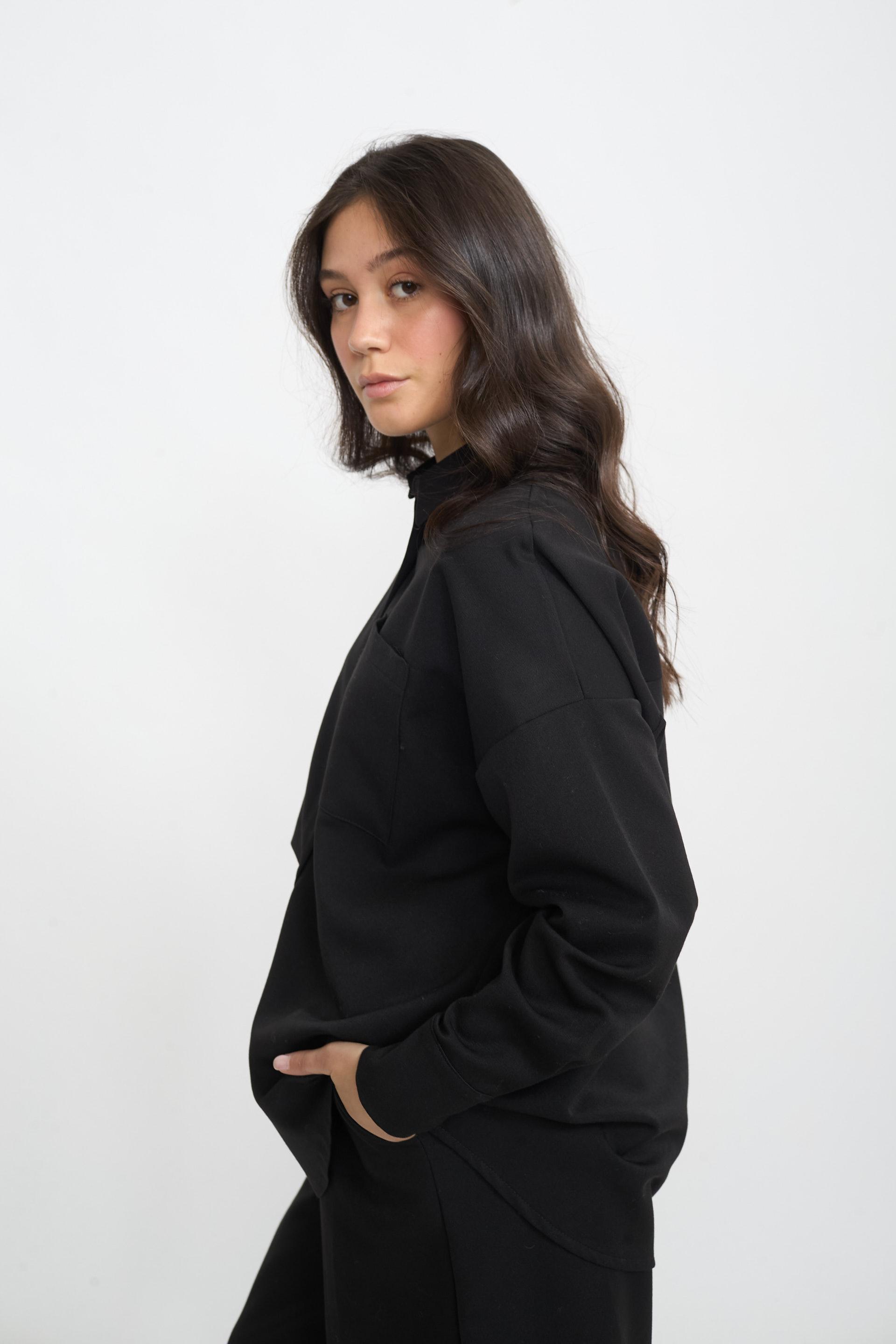 | Camicia over con taschino applicato in mano lana. Chiusura frontale tramite bottoni tono su tono. | ||