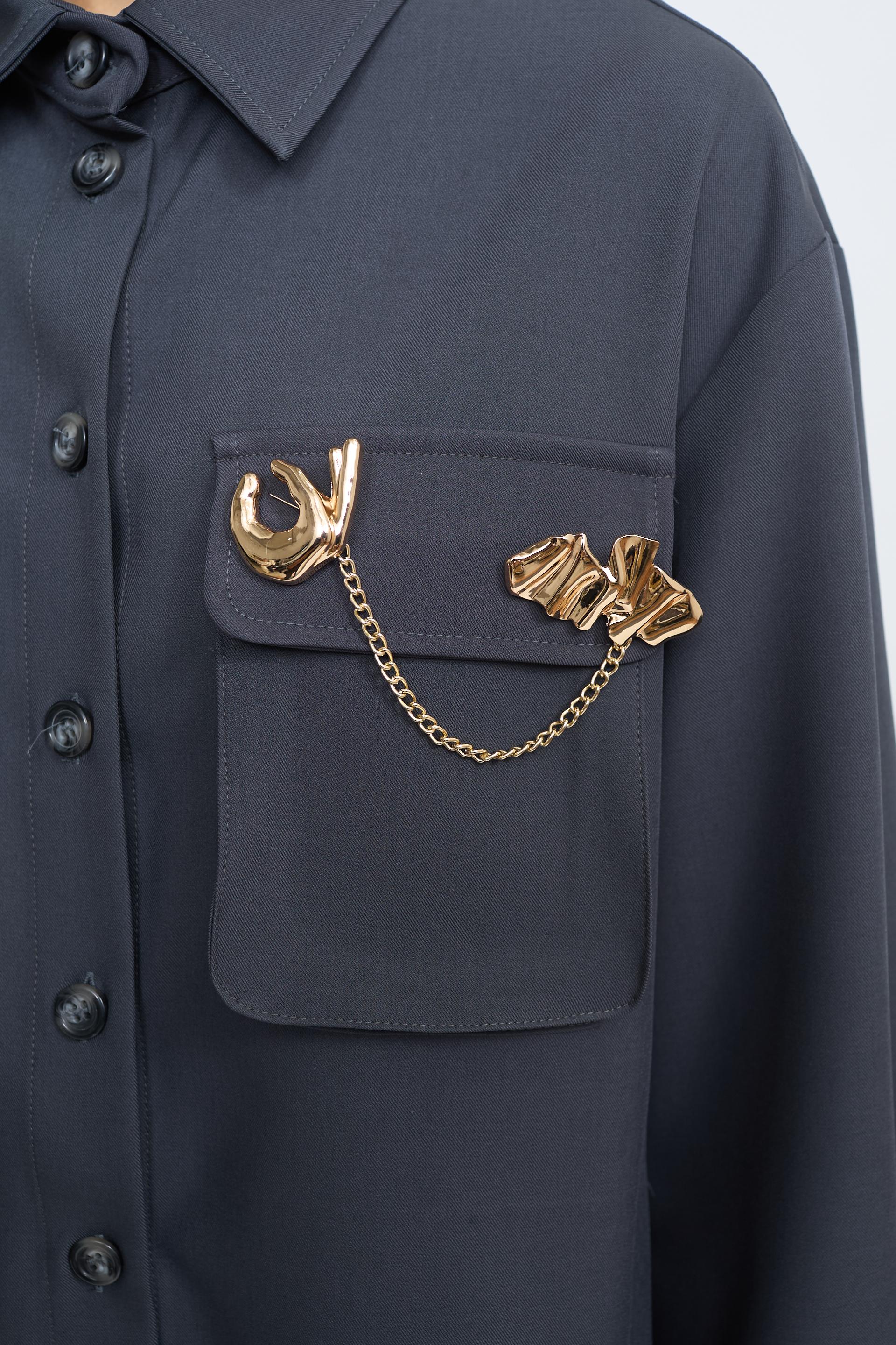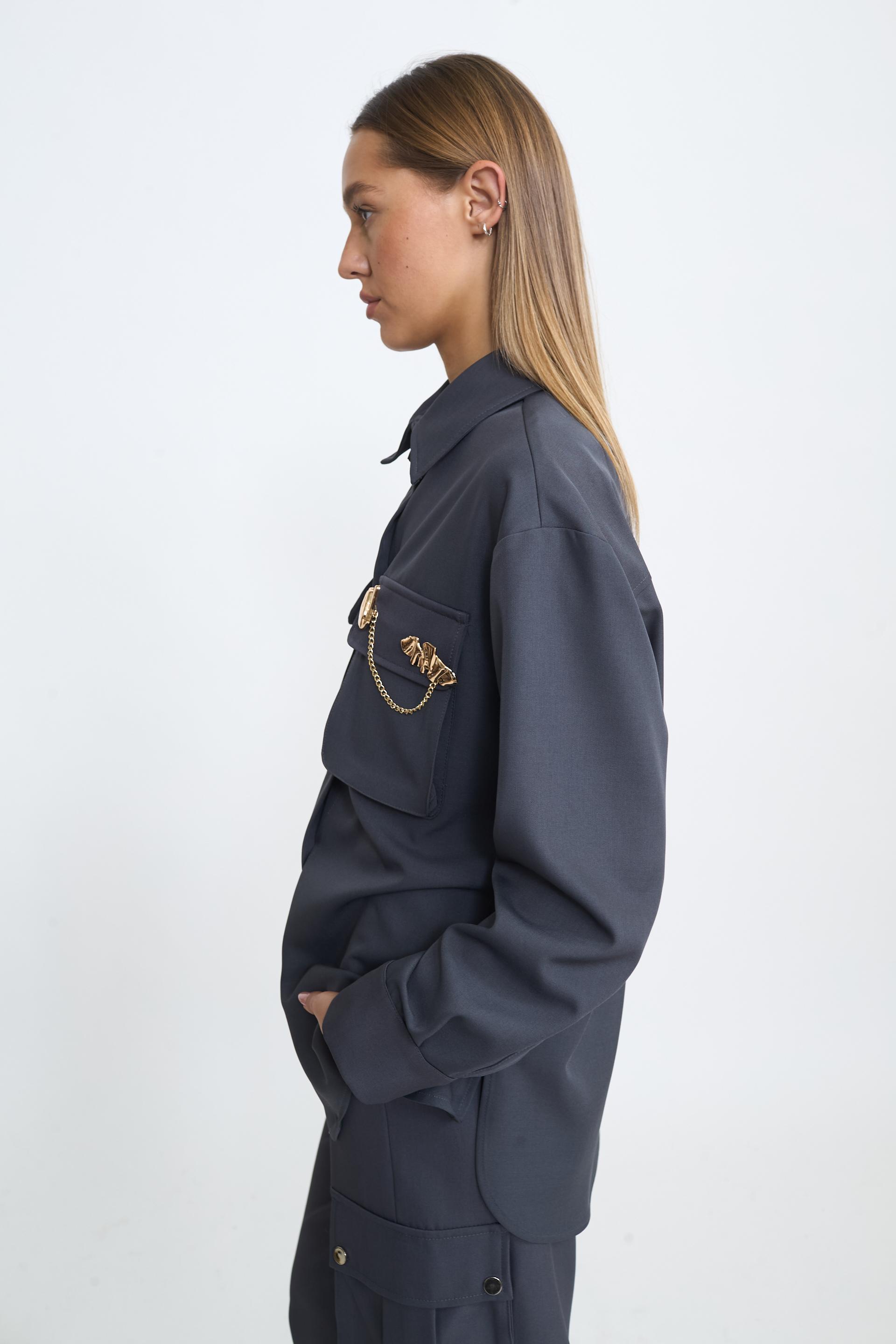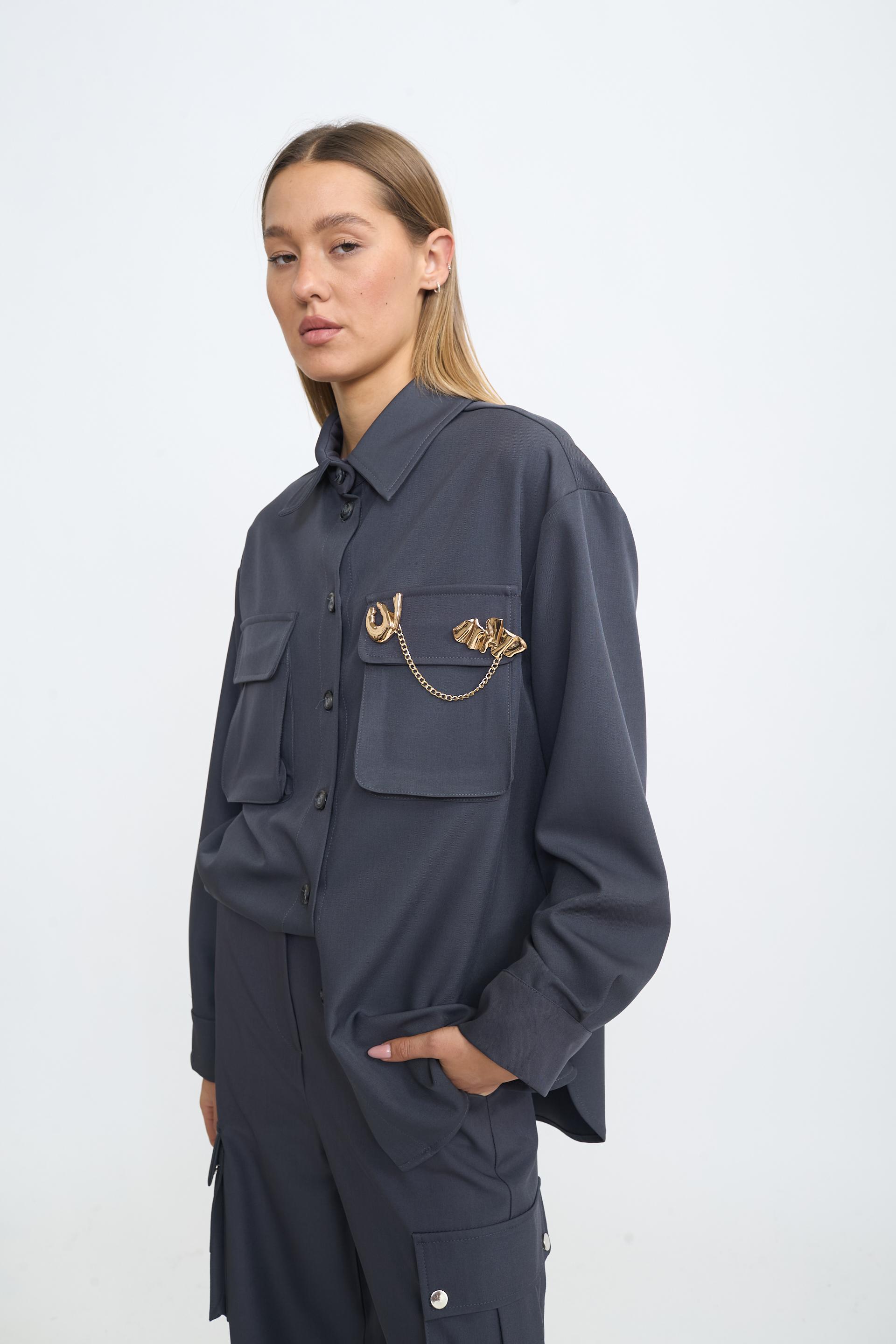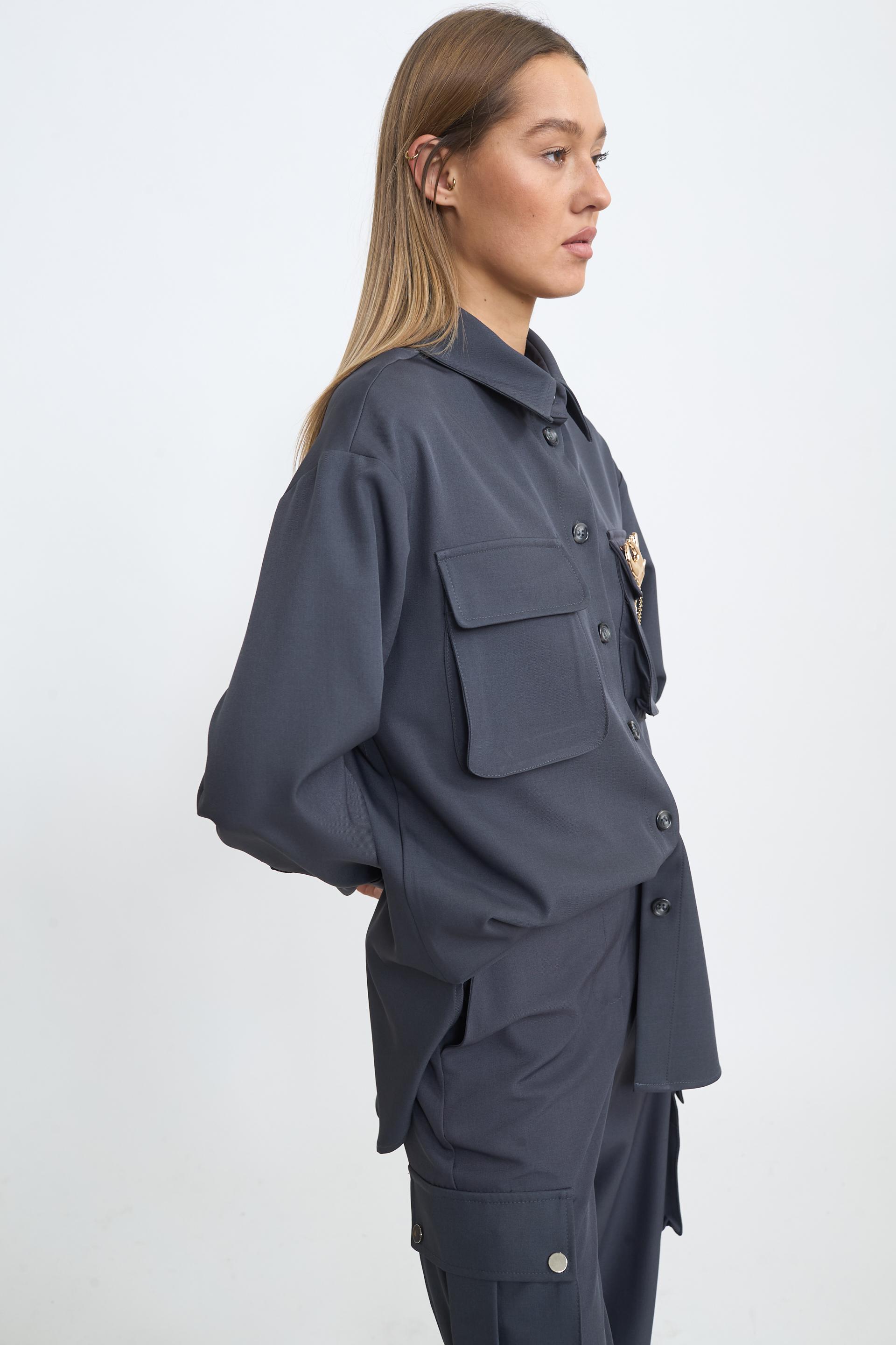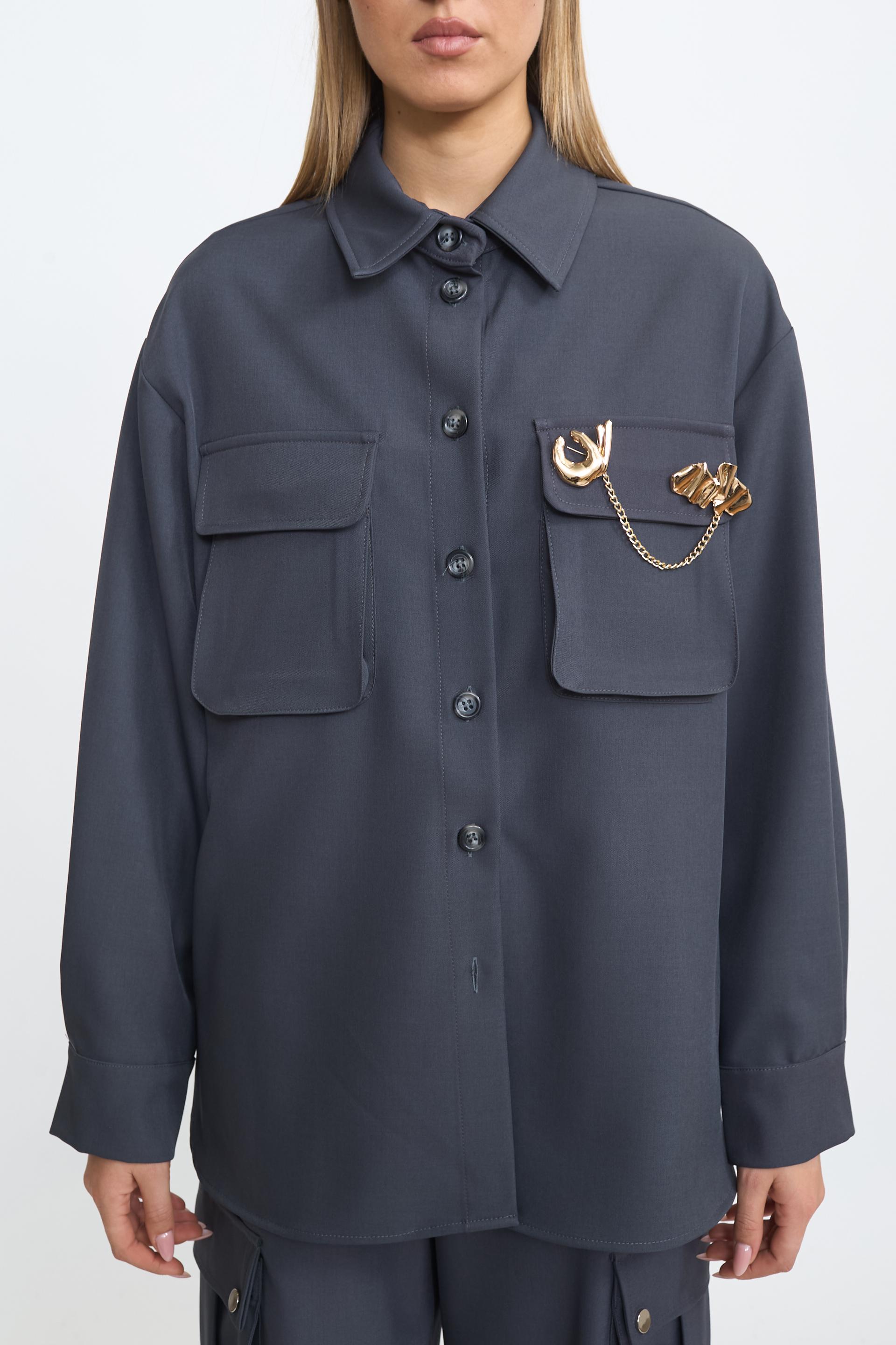 Giacca camicia over con tasche applicate con pattina. Dettaglio di spille e spacchi laterali. | ||