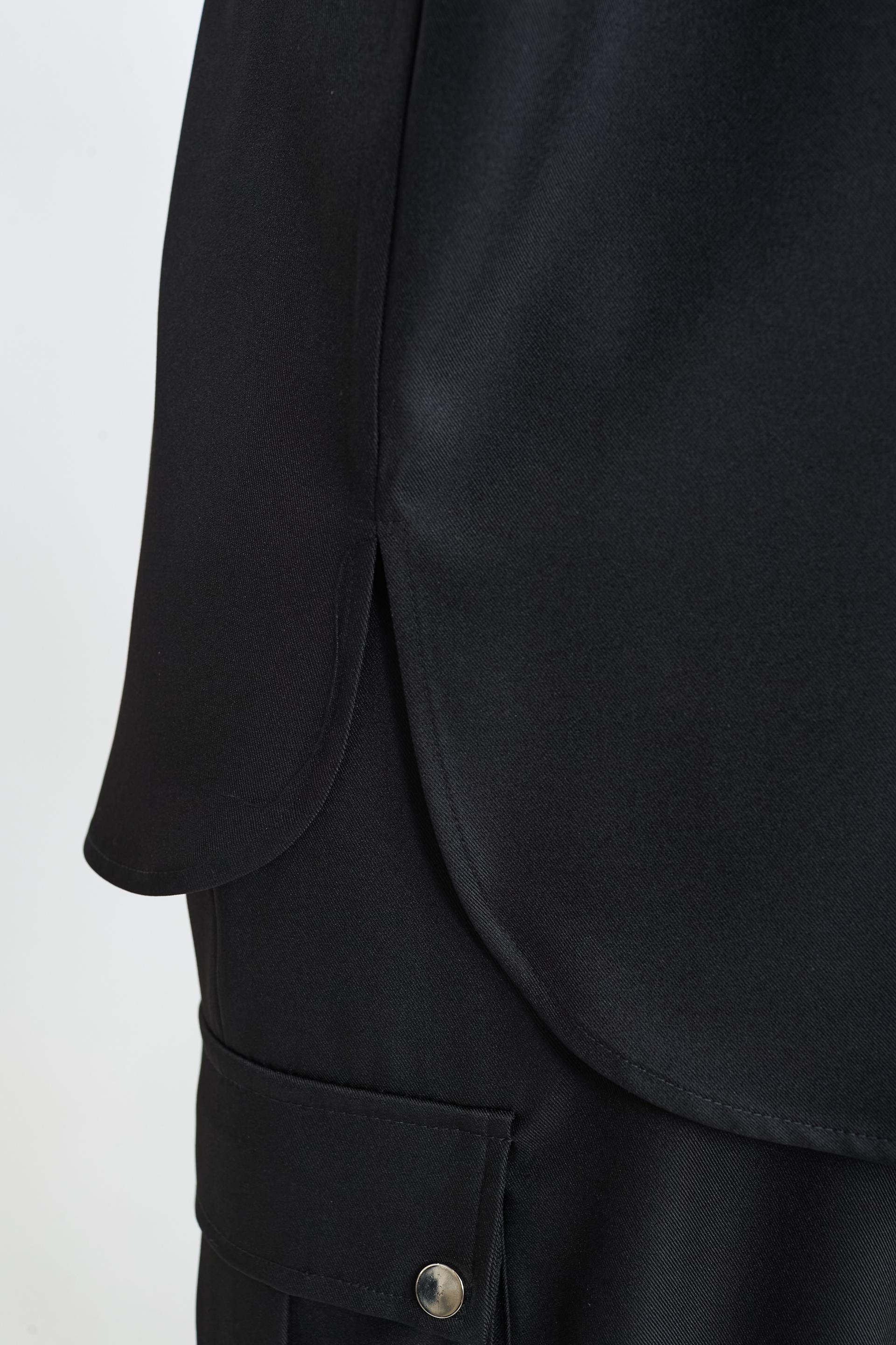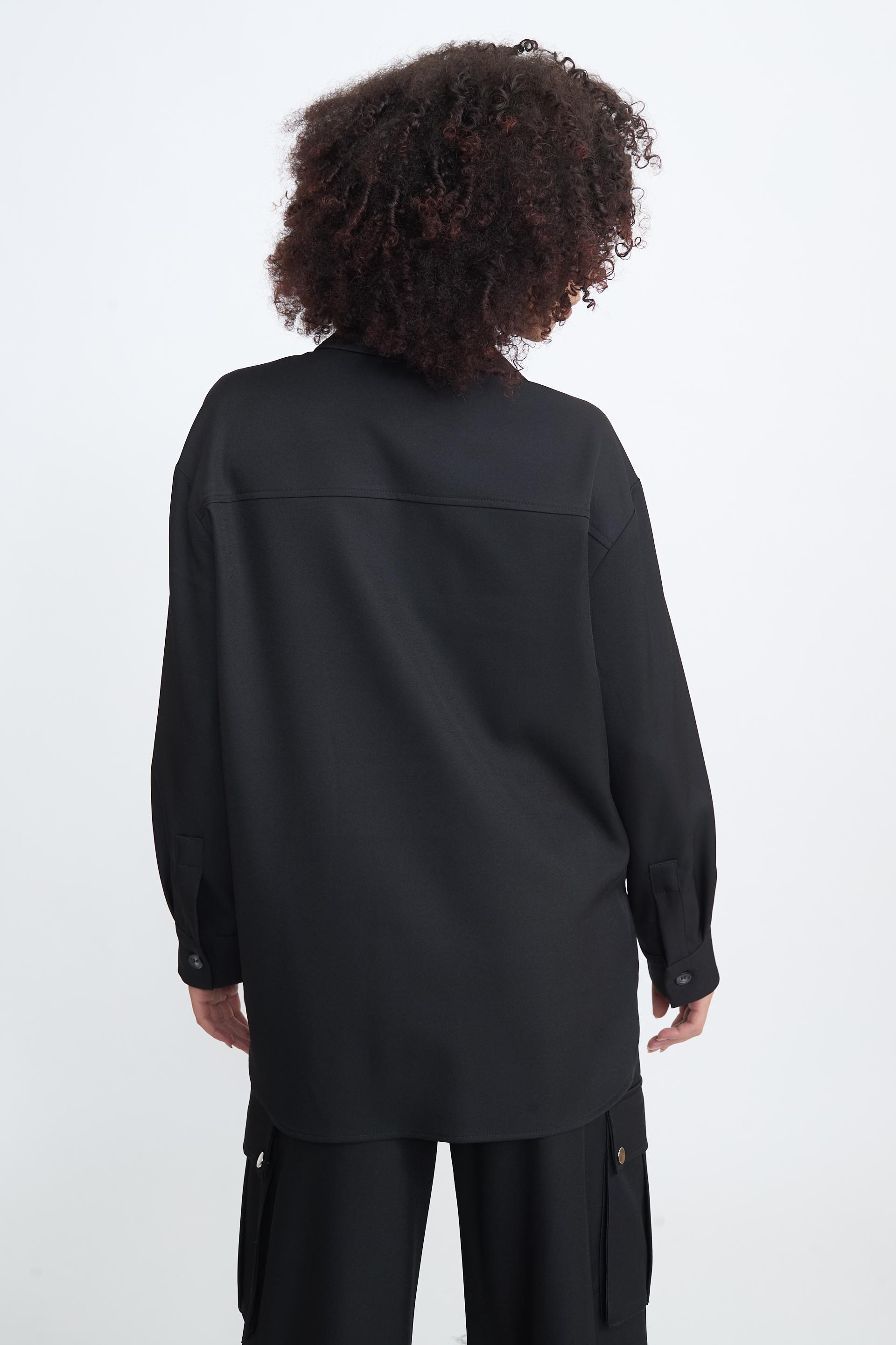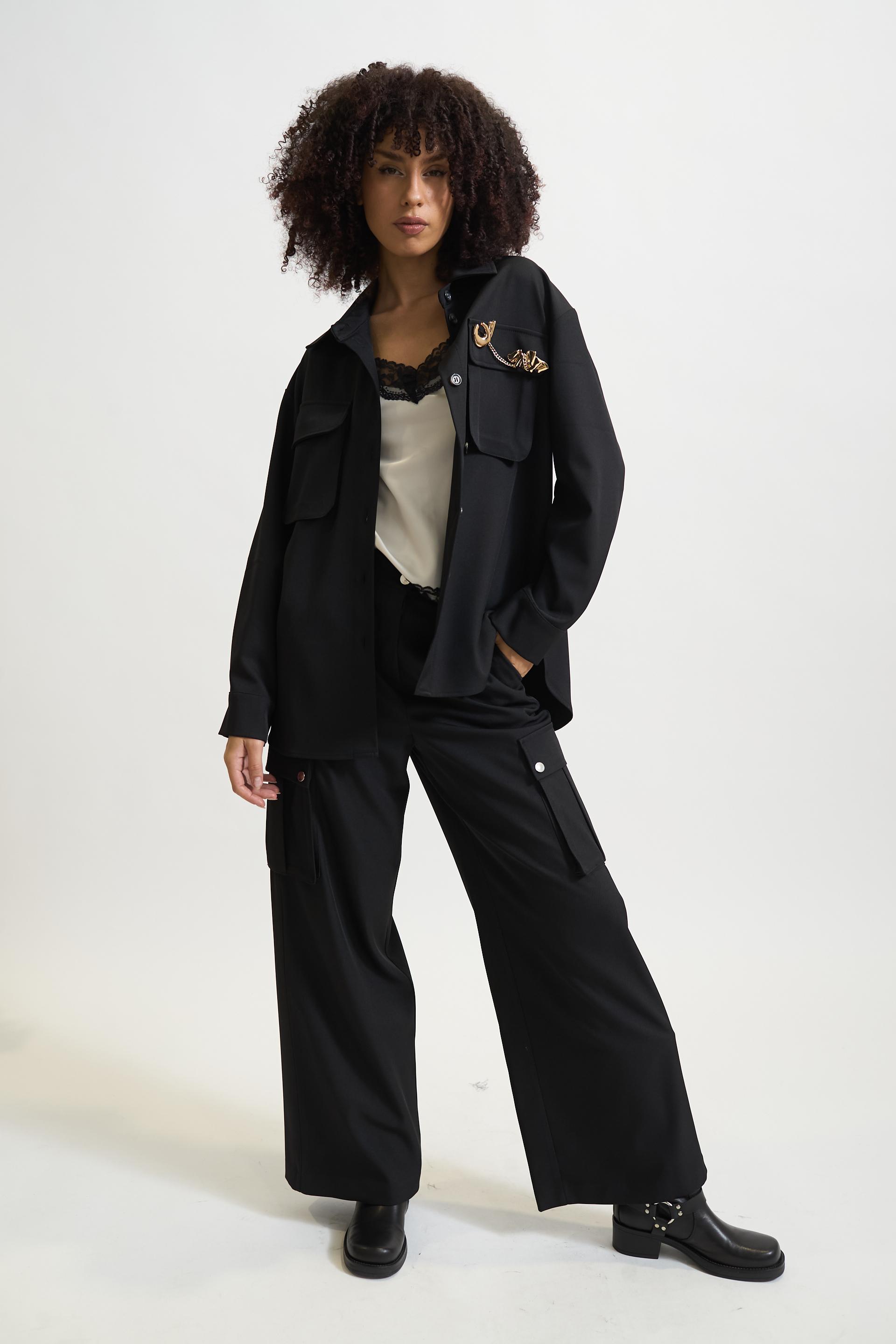 Giacca camicia over con tasche applicate con pattina. Dettaglio di spille e spacchi laterali. | ||