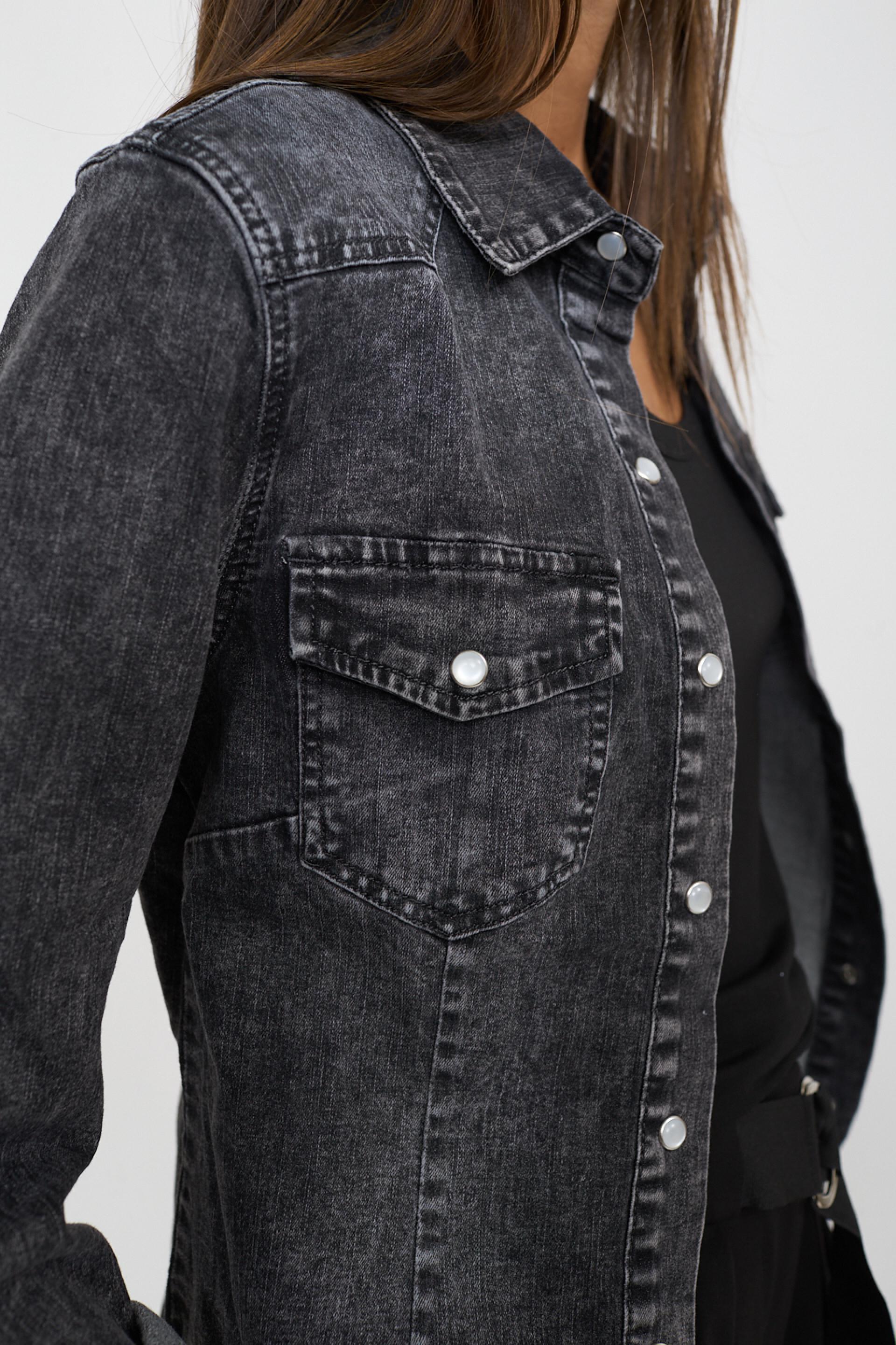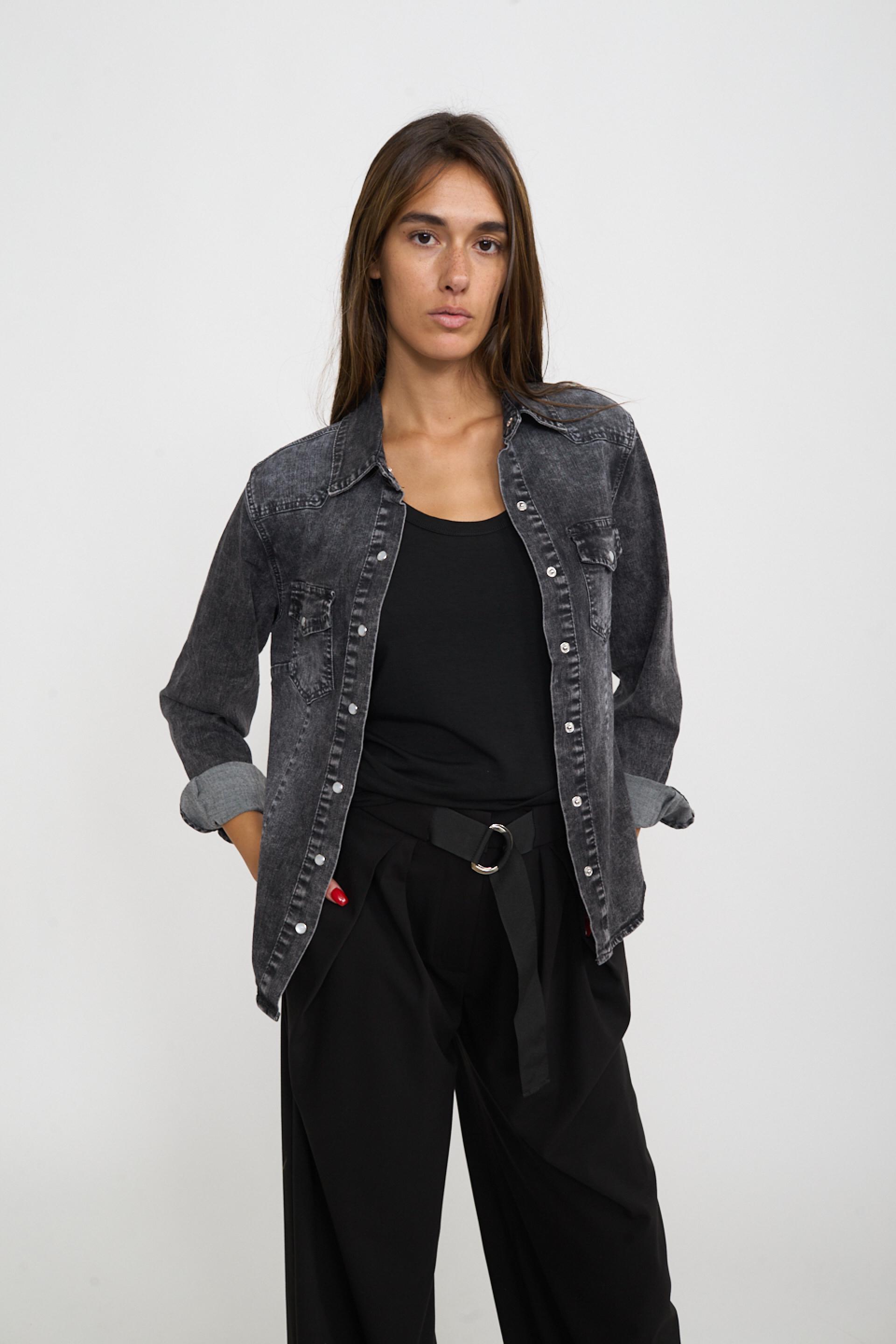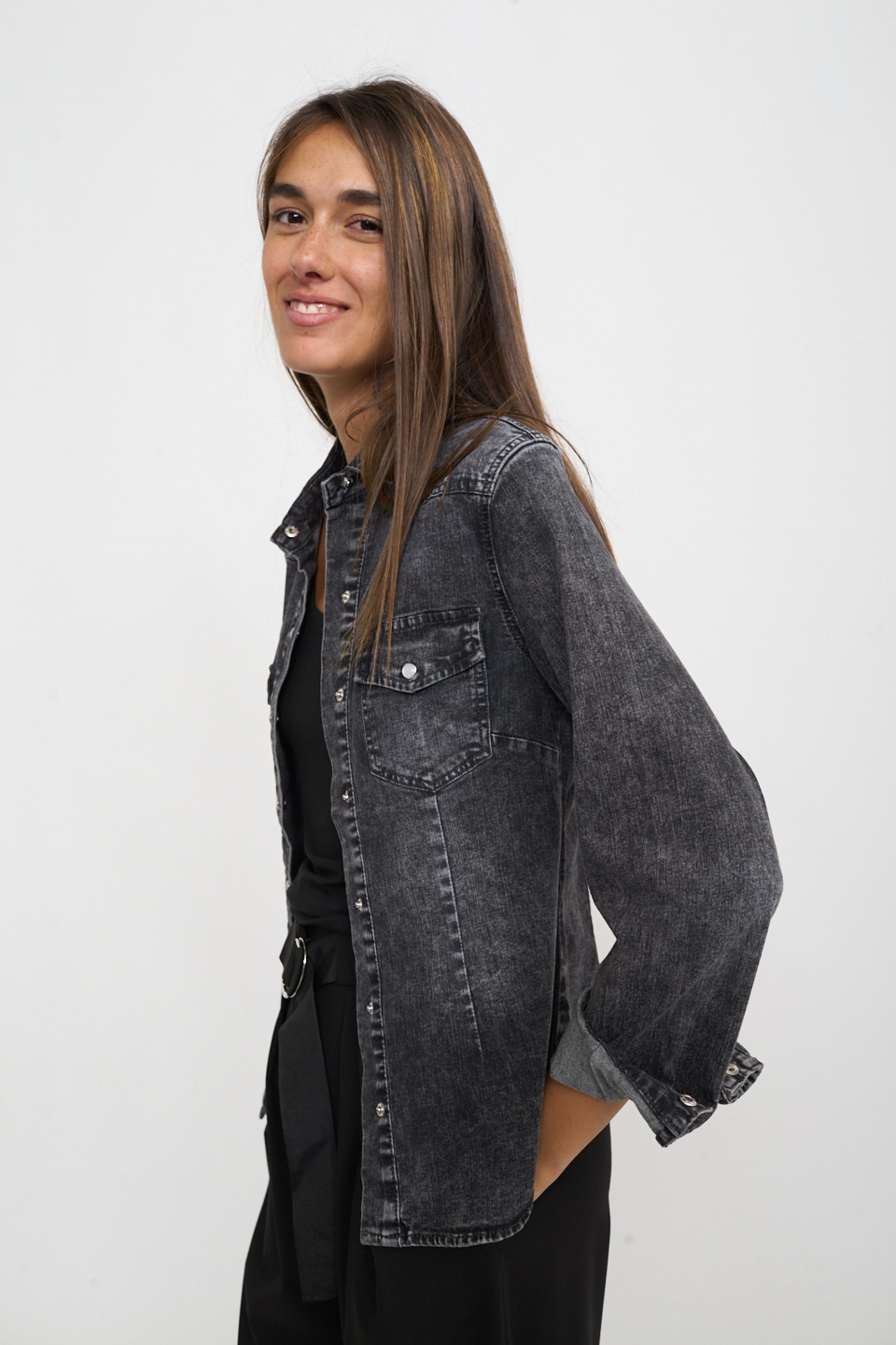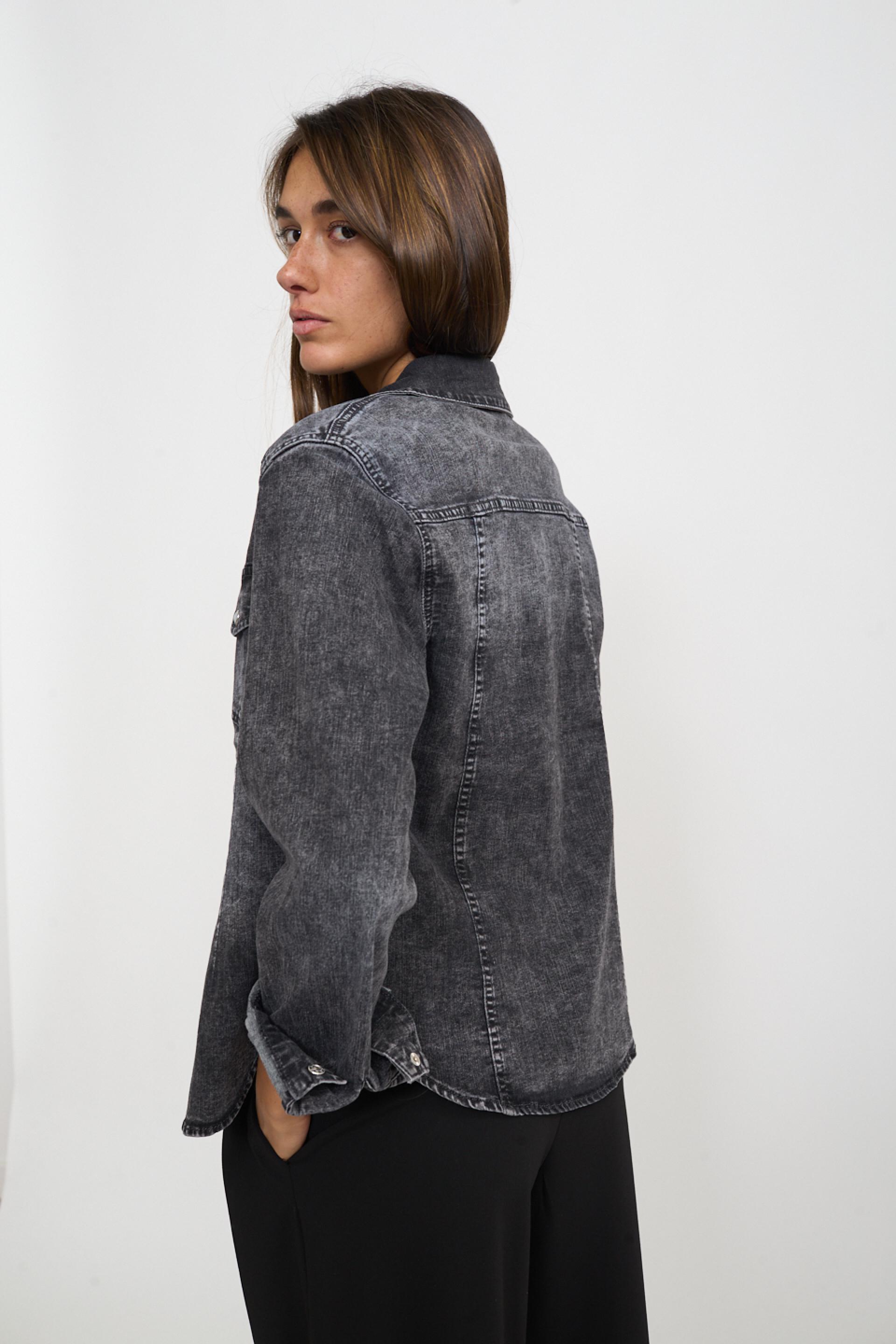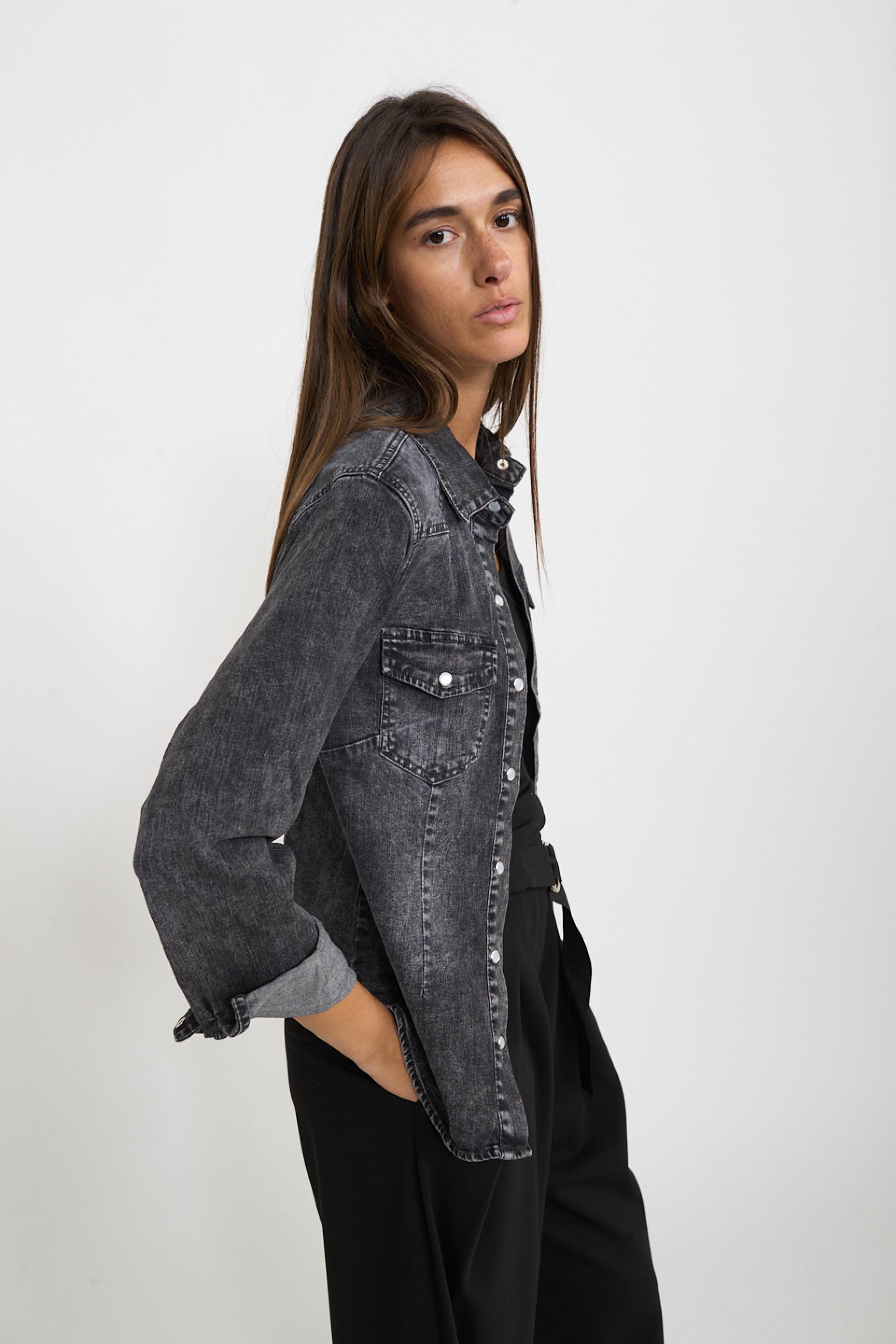 | Camicia denim effetto delavato. Taschini con pattina sul petto. Chiusura tramite bottoni automatici effetto perlato. | ||