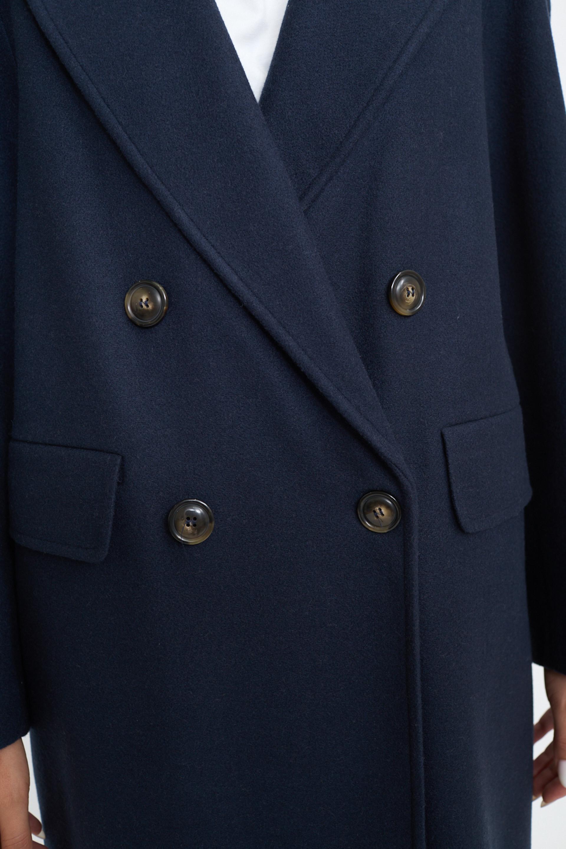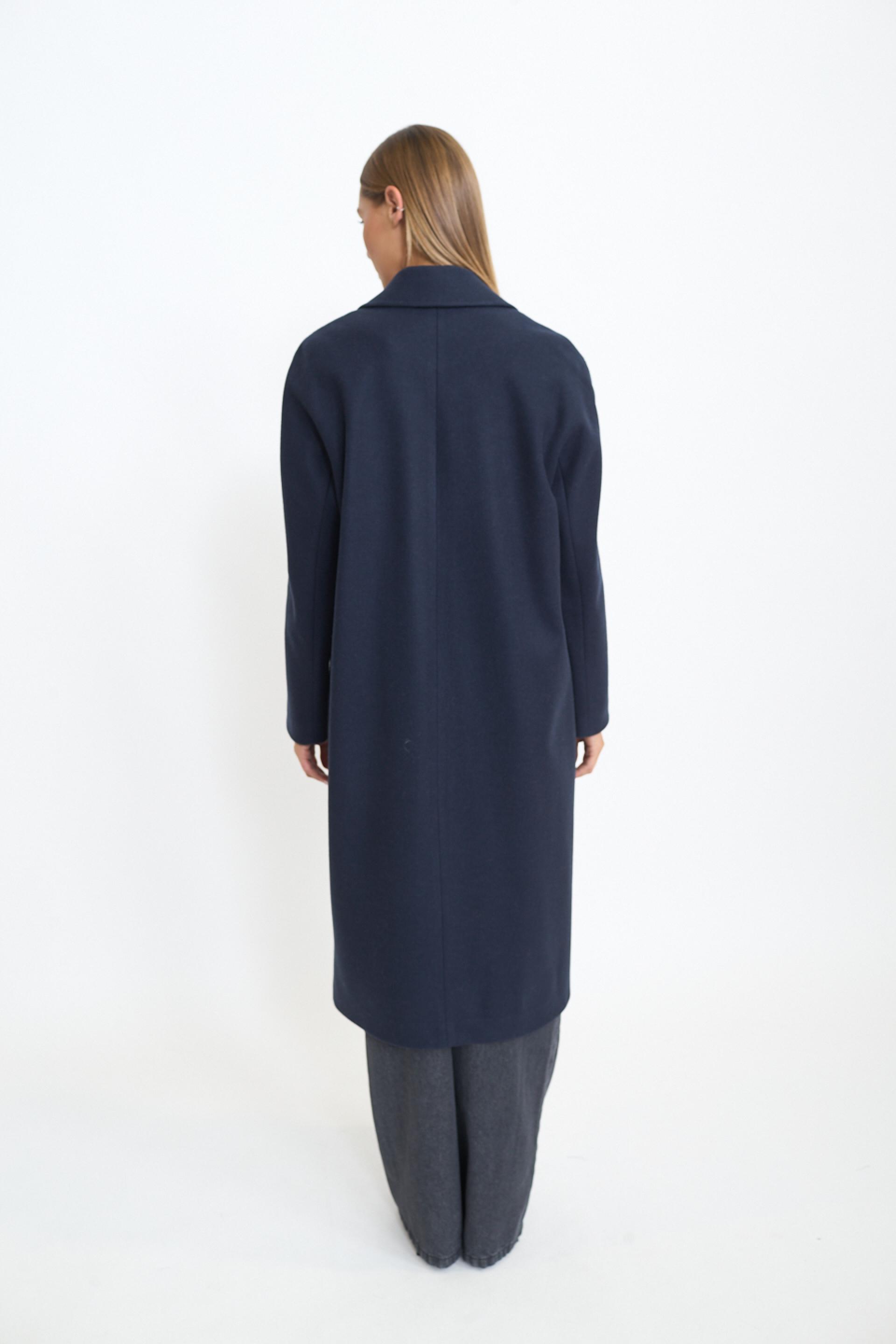 | Cappotto collo revers doppio petto over con tasche finte tasche con pattina. | ||