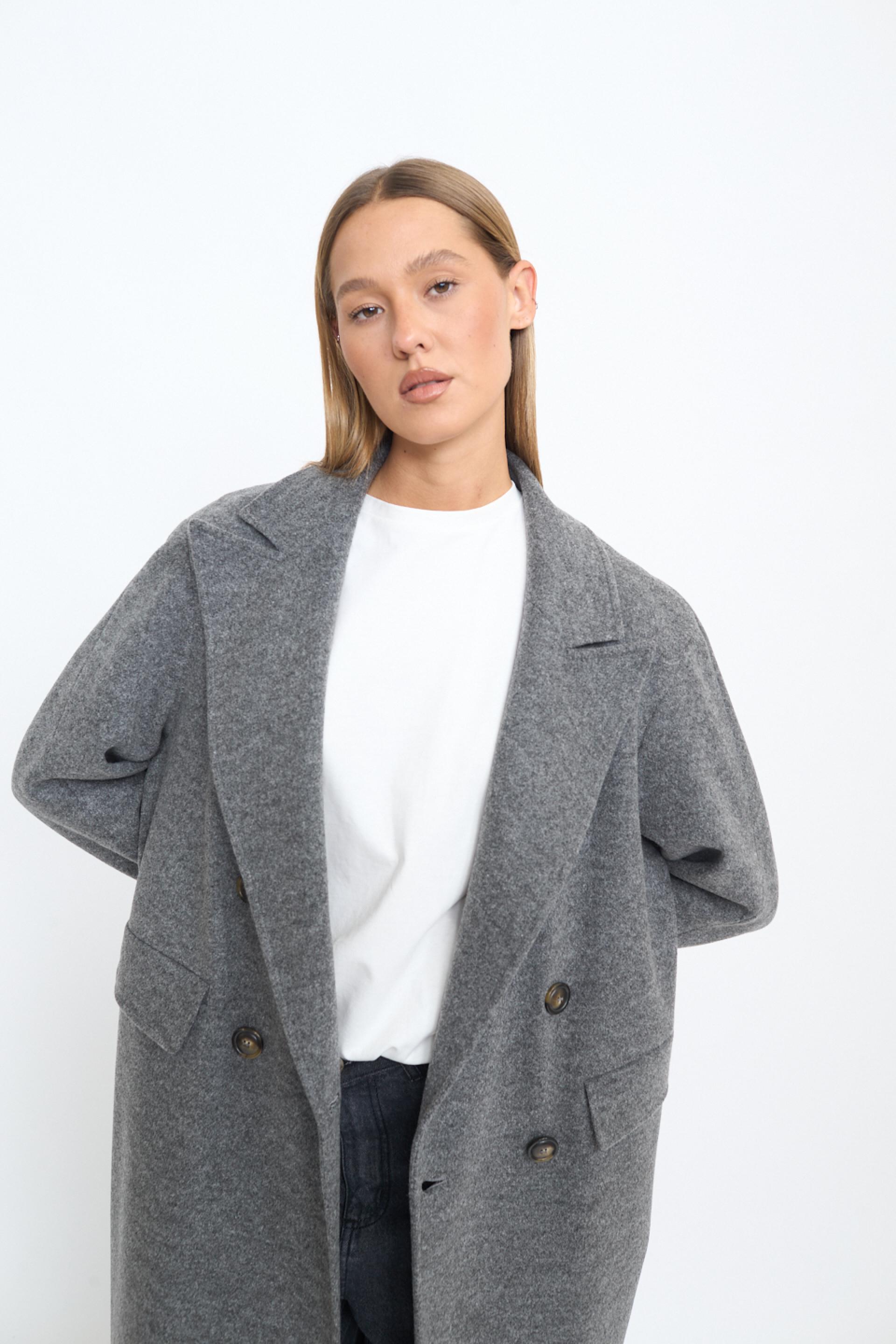 | Cappotto collo revers doppio petto over con tasche finte tasche con pattina. | ||