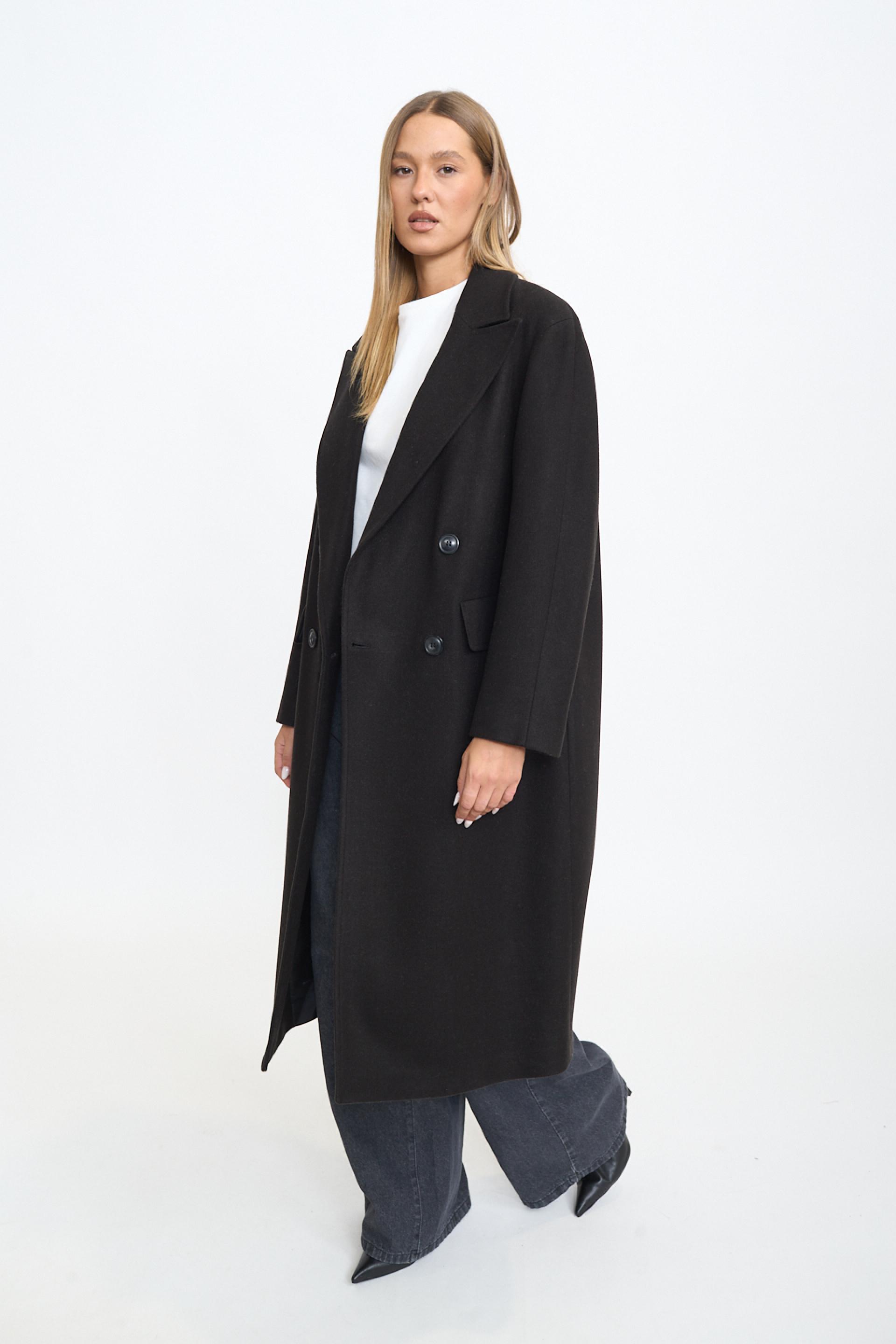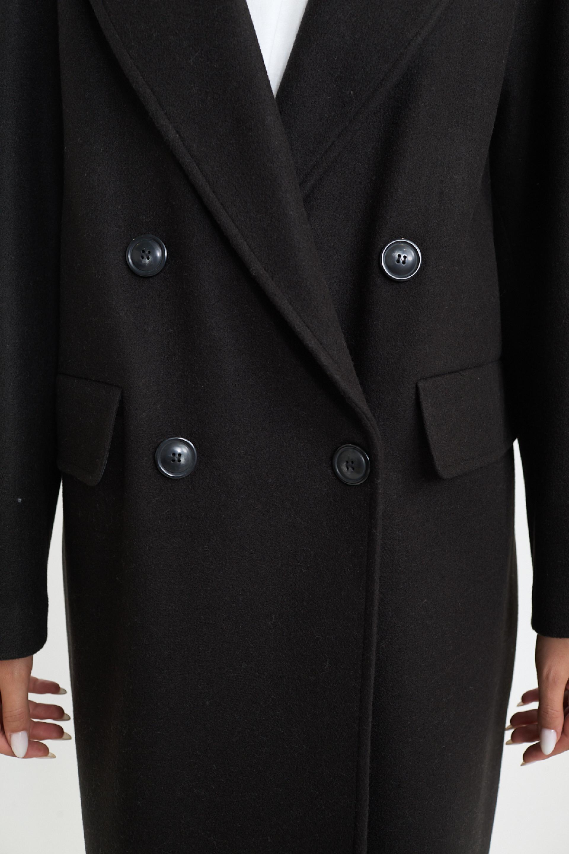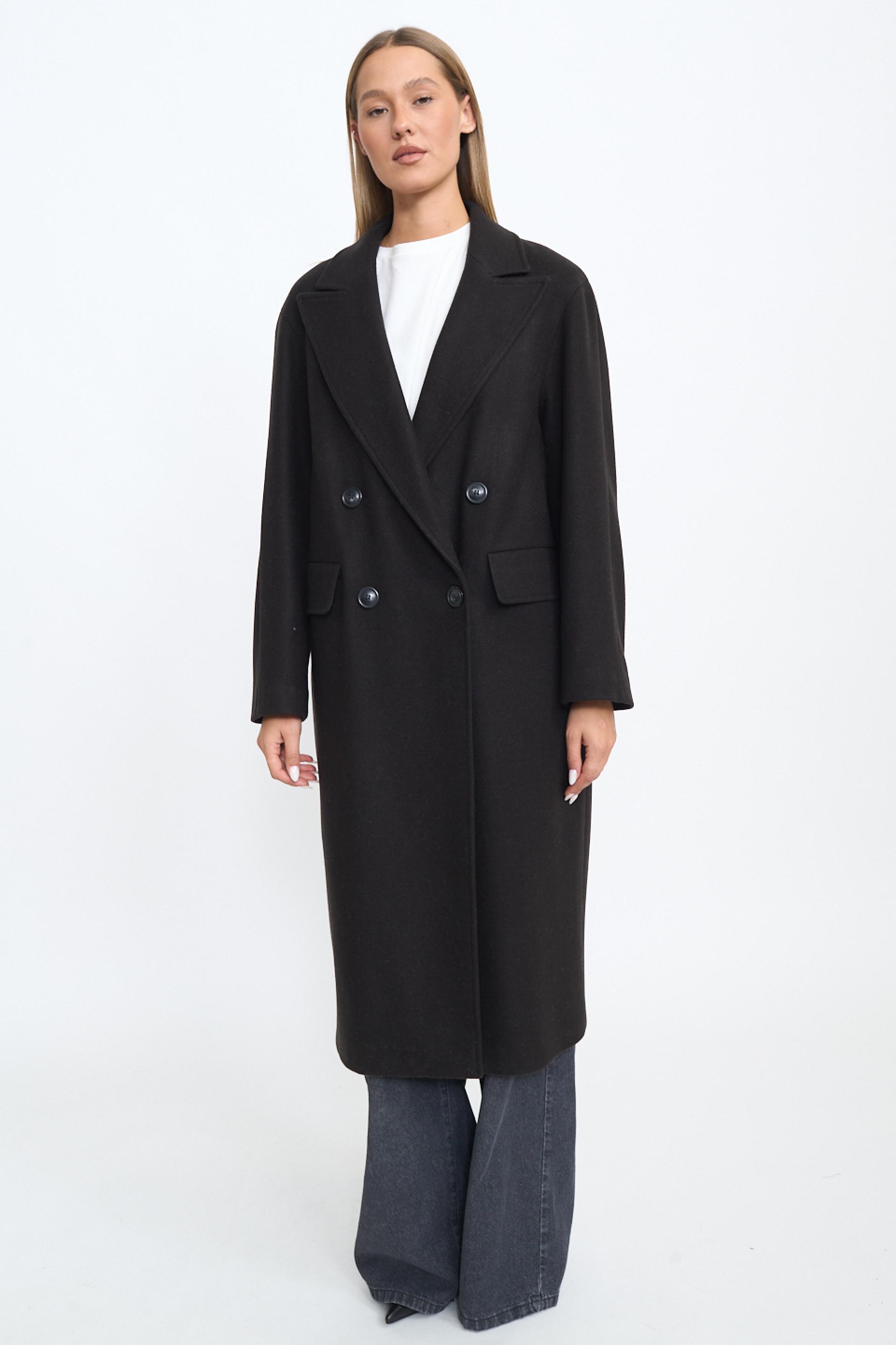 | Cappotto collo revers doppio petto over con tasche finte tasche con pattina. | ||