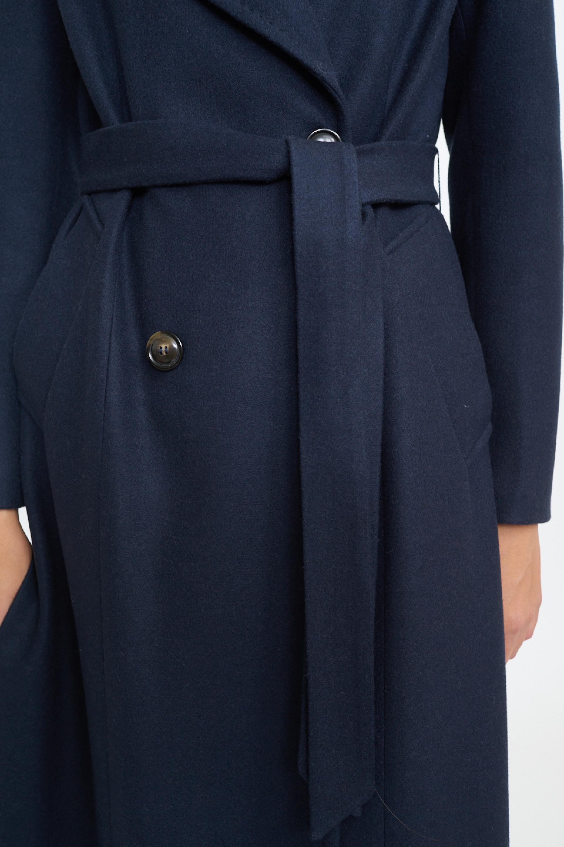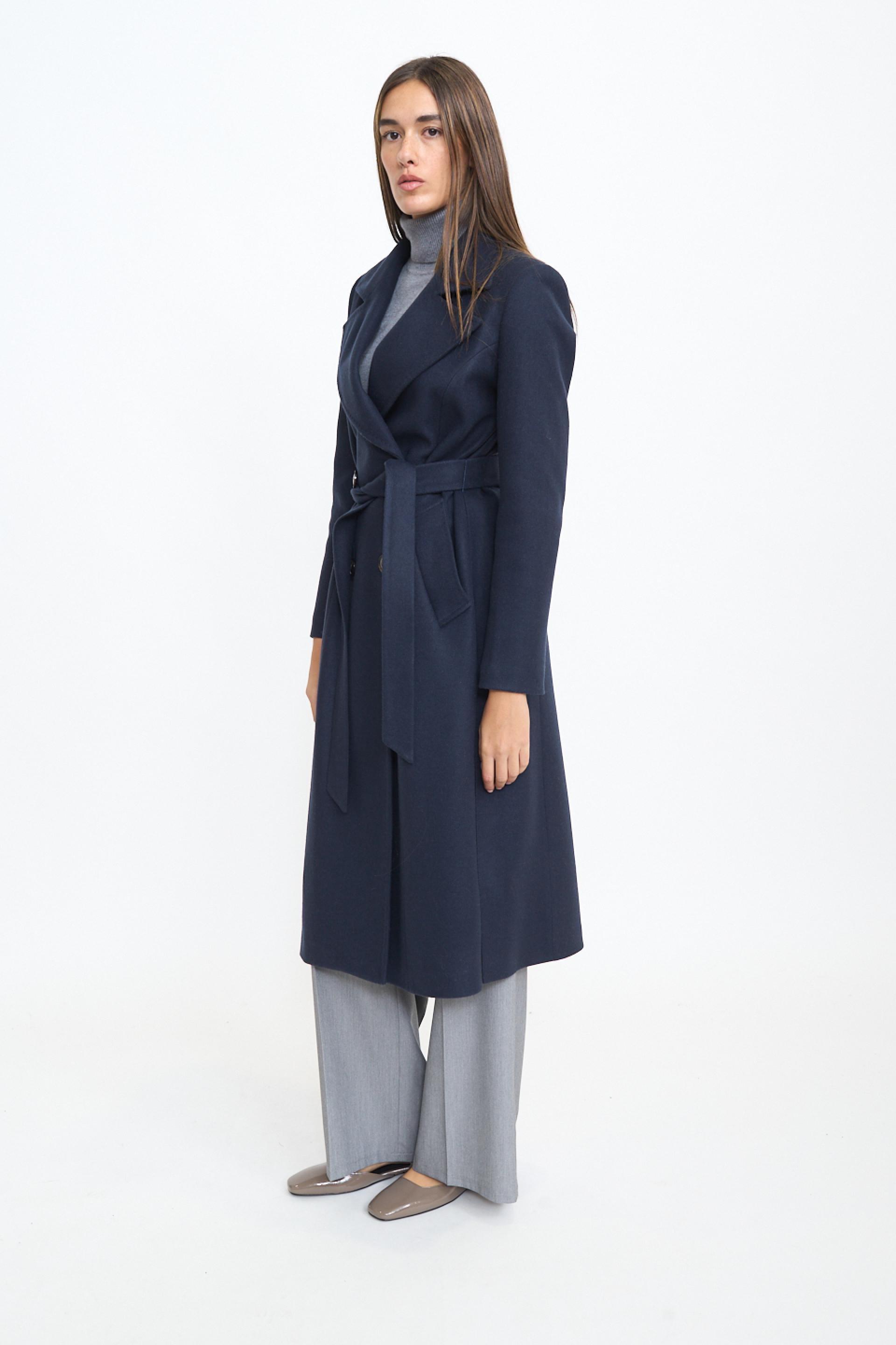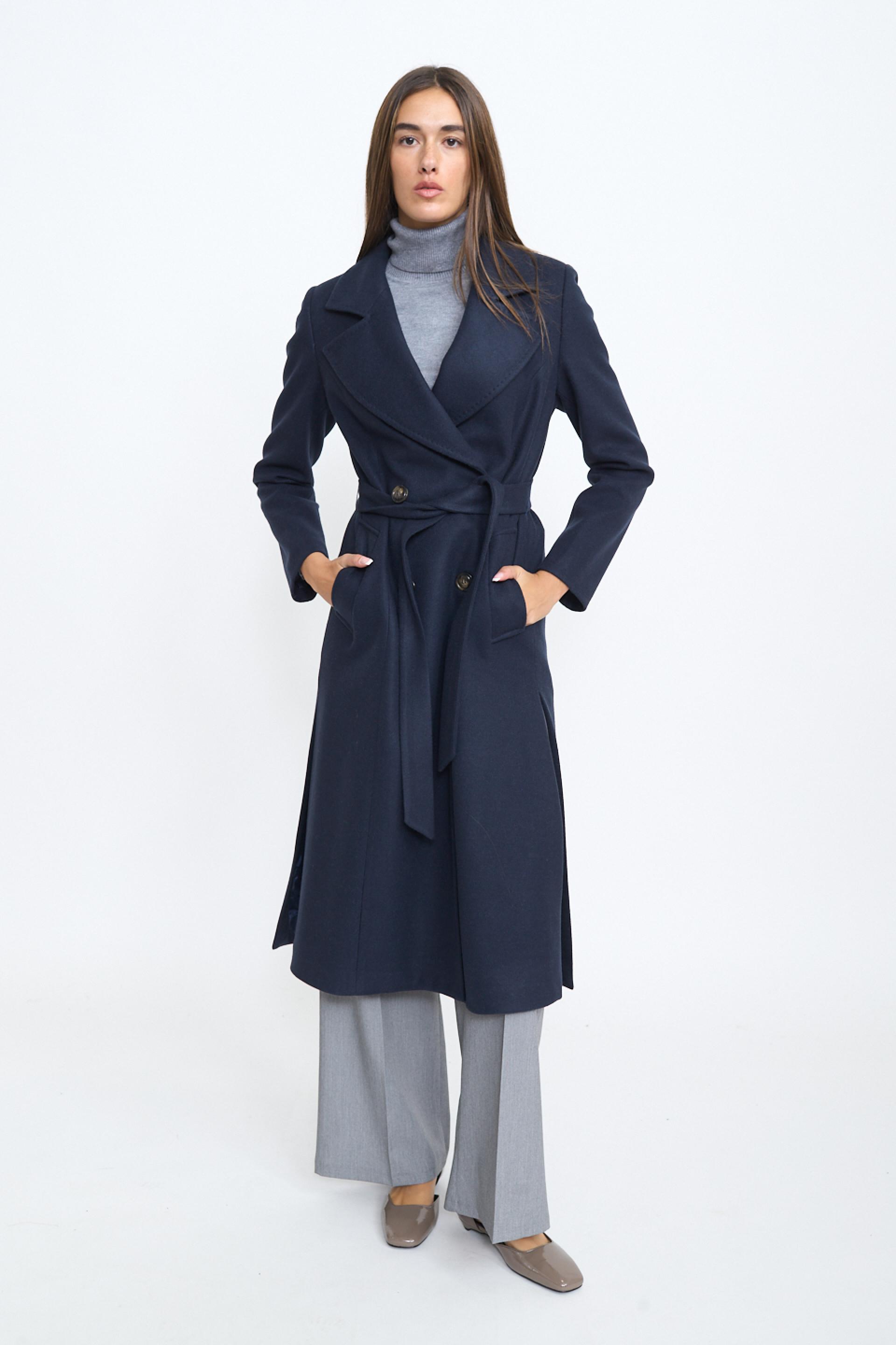 | Cappotto lungo collo revers a doppio petto con cinta. Spacchi e tasche laterali. Fodera interna tono su tono. | ||