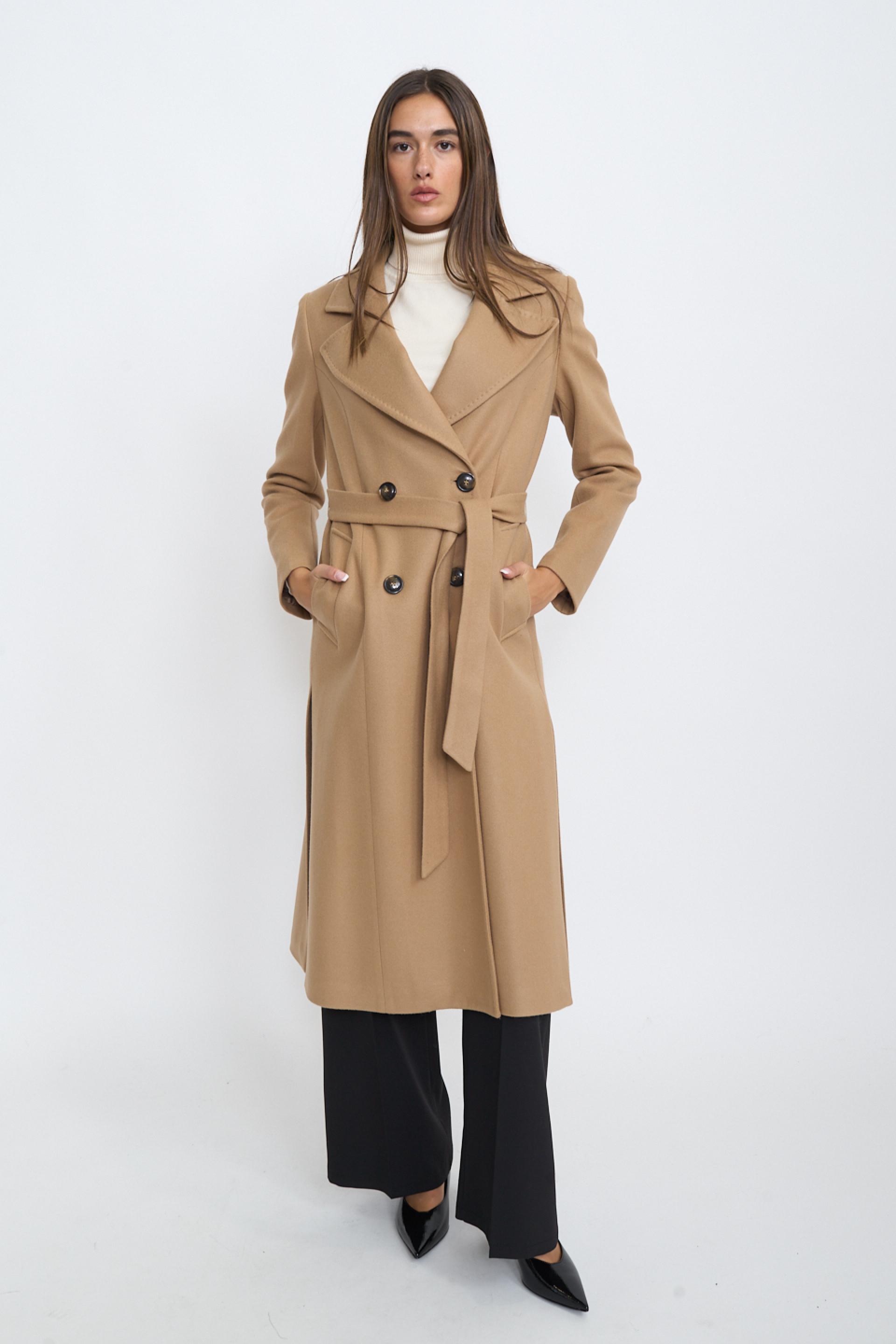 | Cappotto lungo collo revers a doppio petto con cinta. Spacchi e tasche laterali. Fodera interna tono su tono. | ||