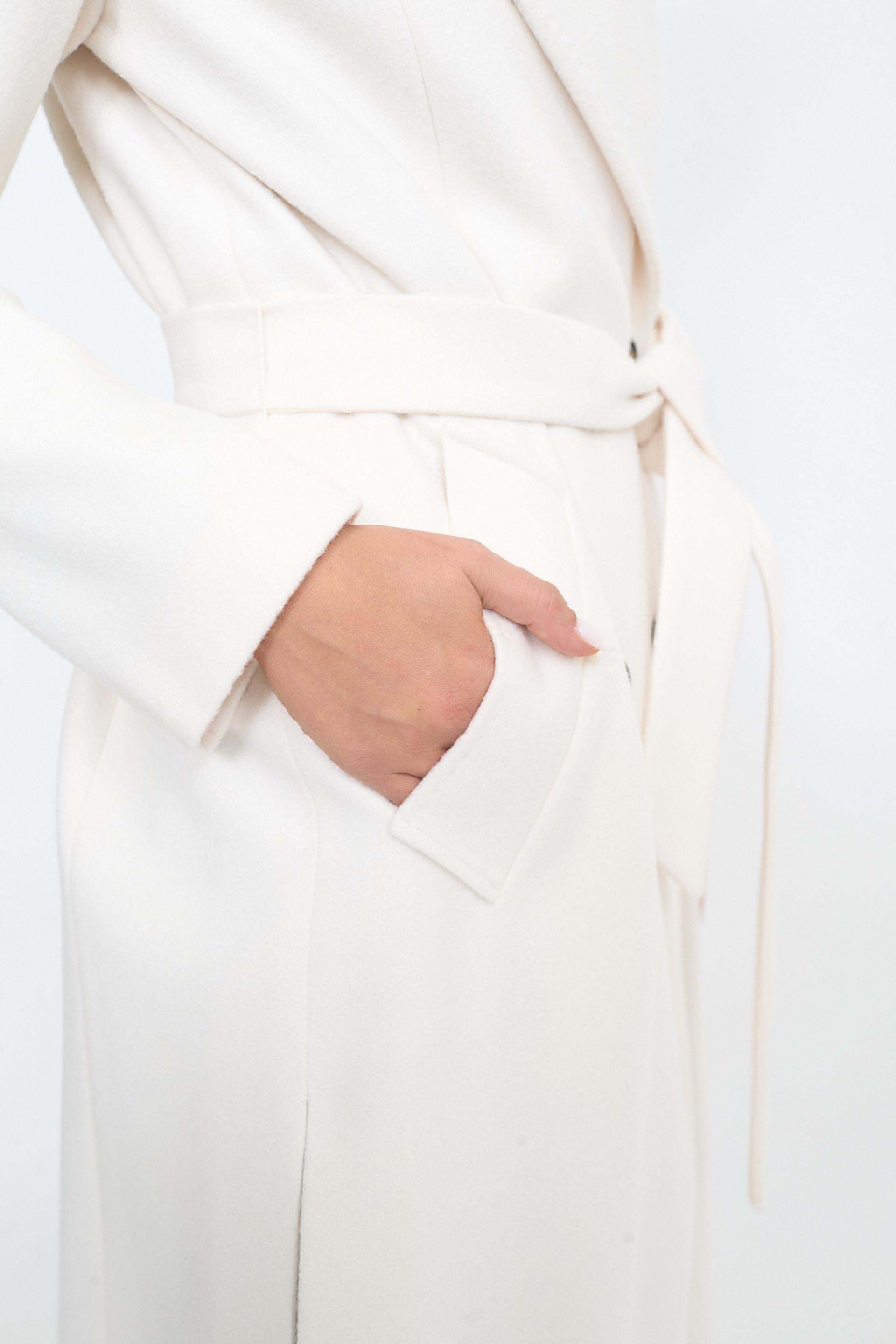 | Cappotto lungo collo revers a doppio petto con cinta. Spacchi e tasche laterali. Fodera interna tono su tono. | ||