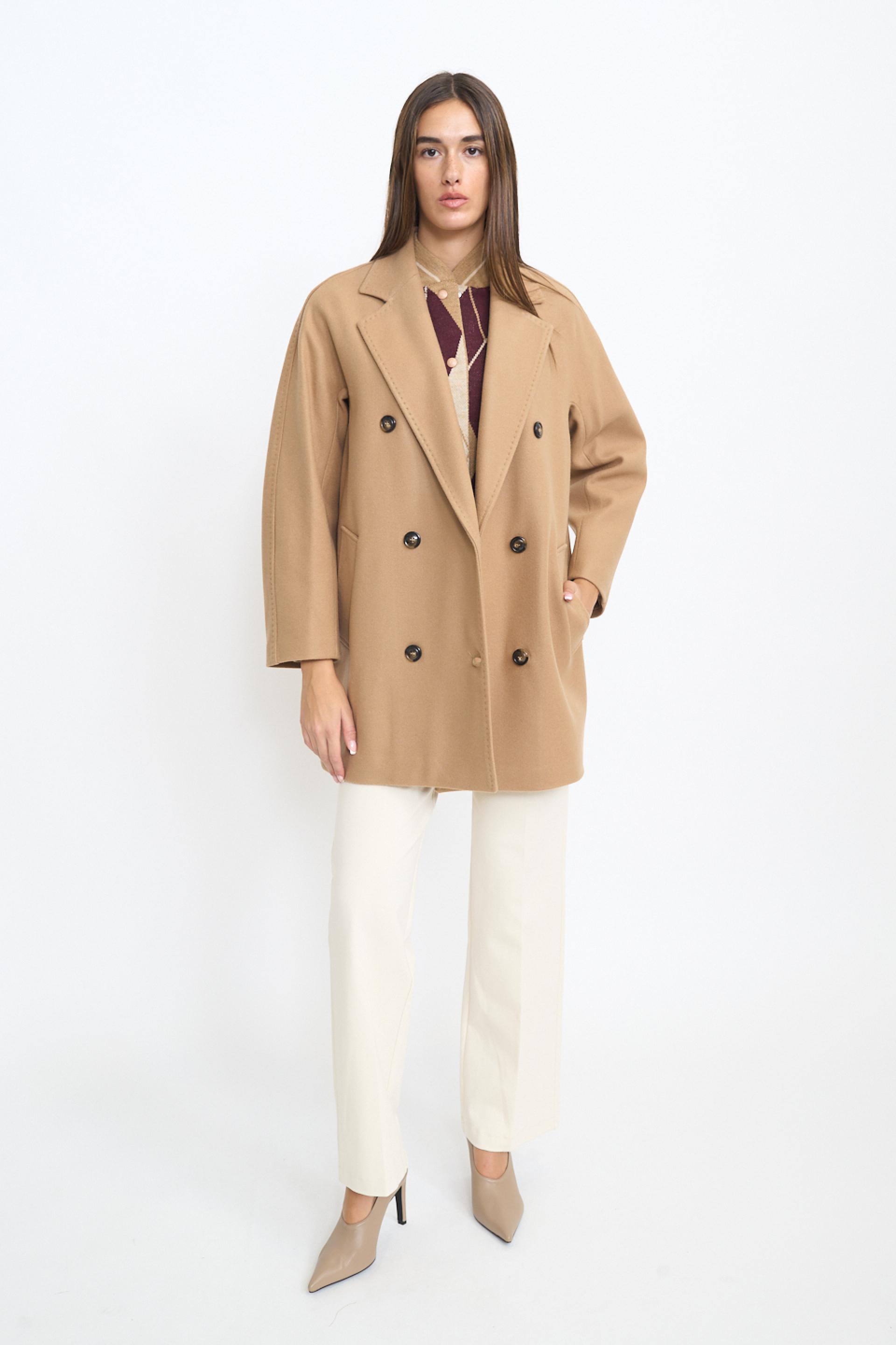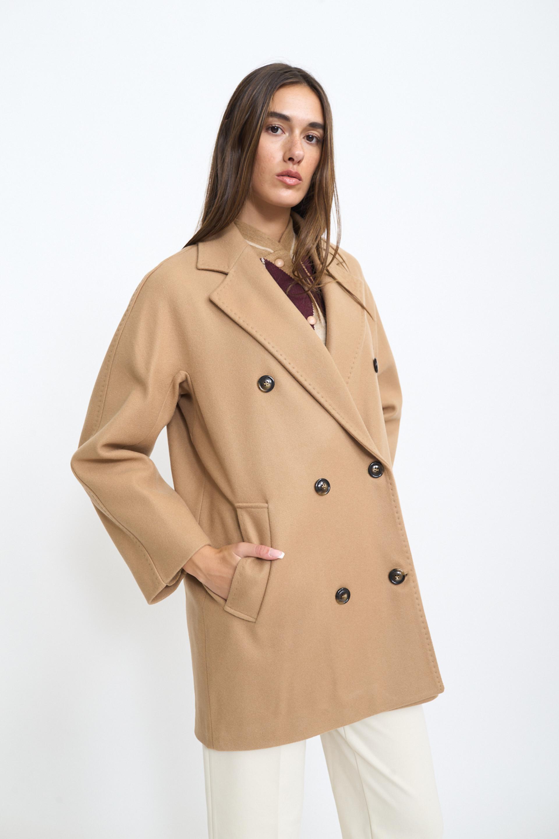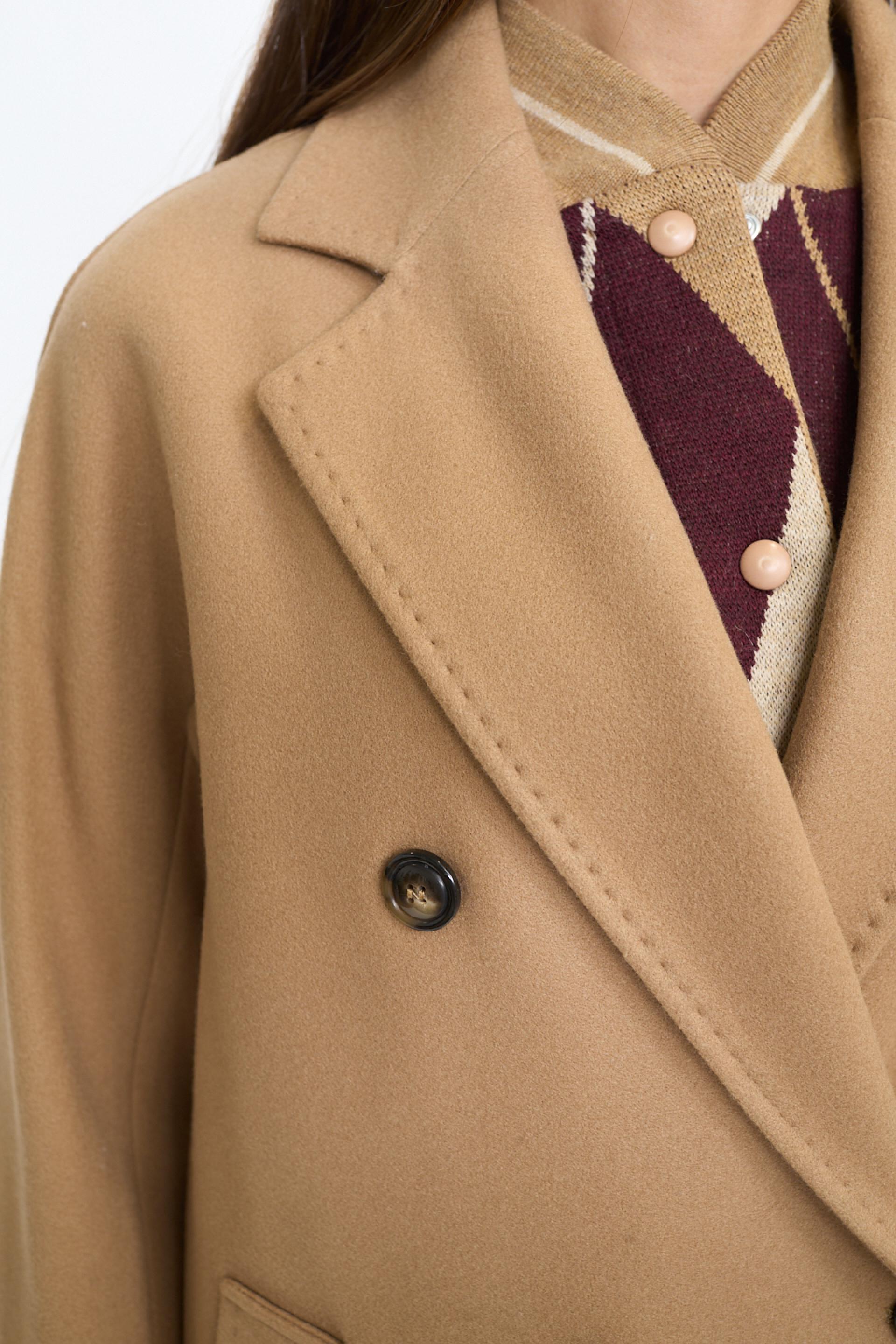 | Cappotto 3/4 doppio petto con collo revers e tasche laterali. Fodera interna. | ||