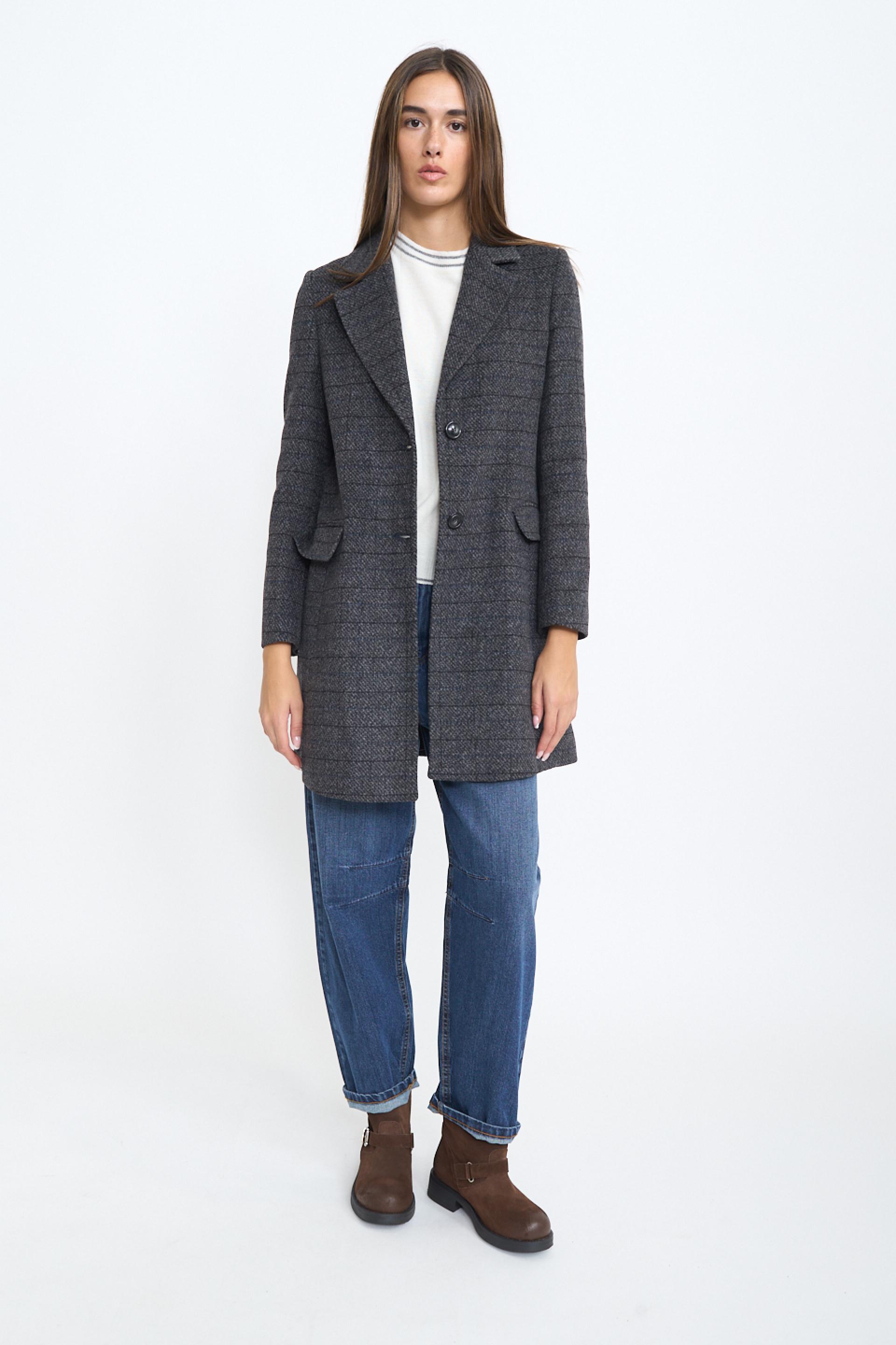 | Cappotto collo revers 3/4 con finte tasche con pattine. Chiusura tramite 2 bottoni. Fodera interna. | ||