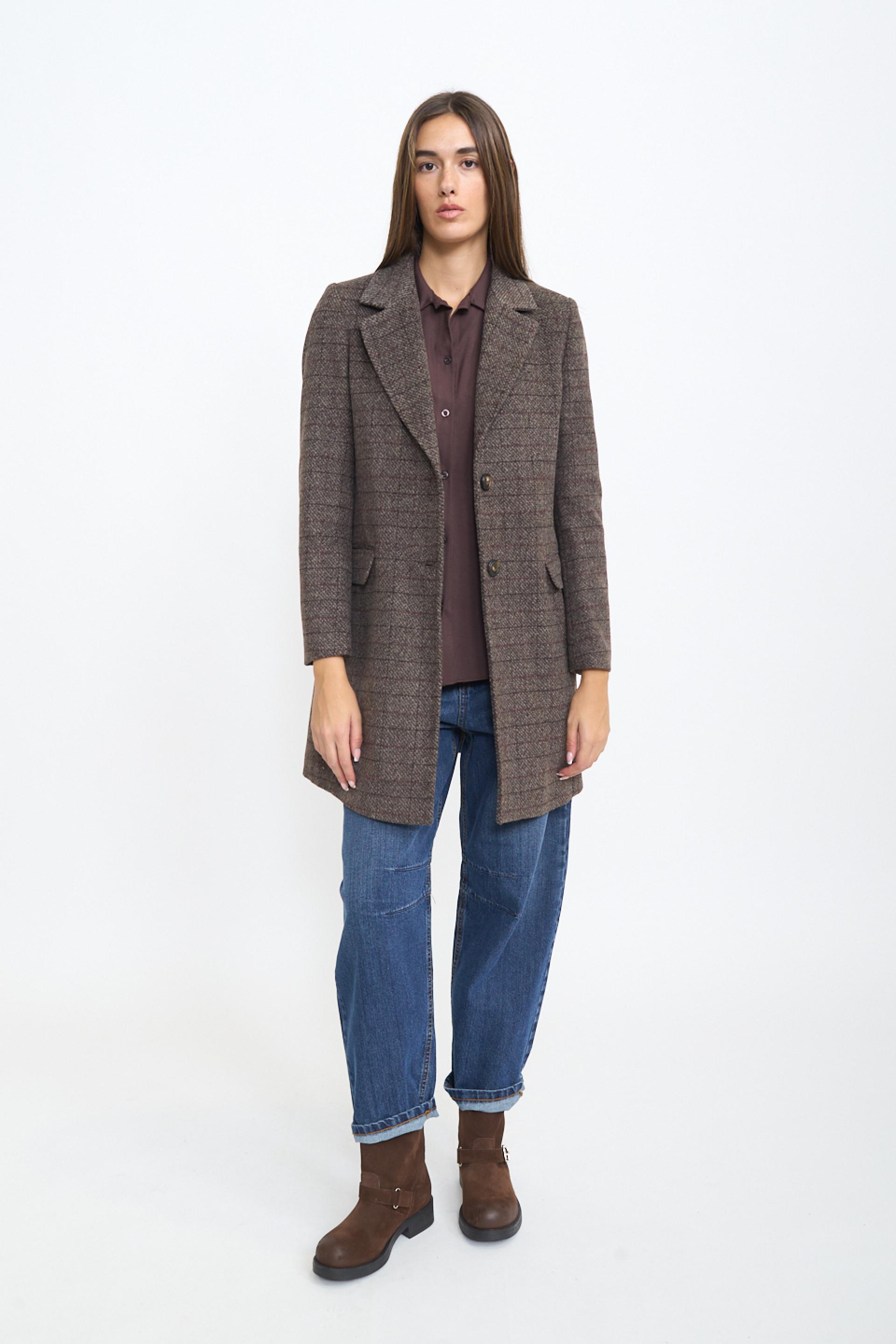 | Cappotto collo revers 3/4 con finte tasche con pattine. Chiusura tramite 2 bottoni. Fodera interna. | ||