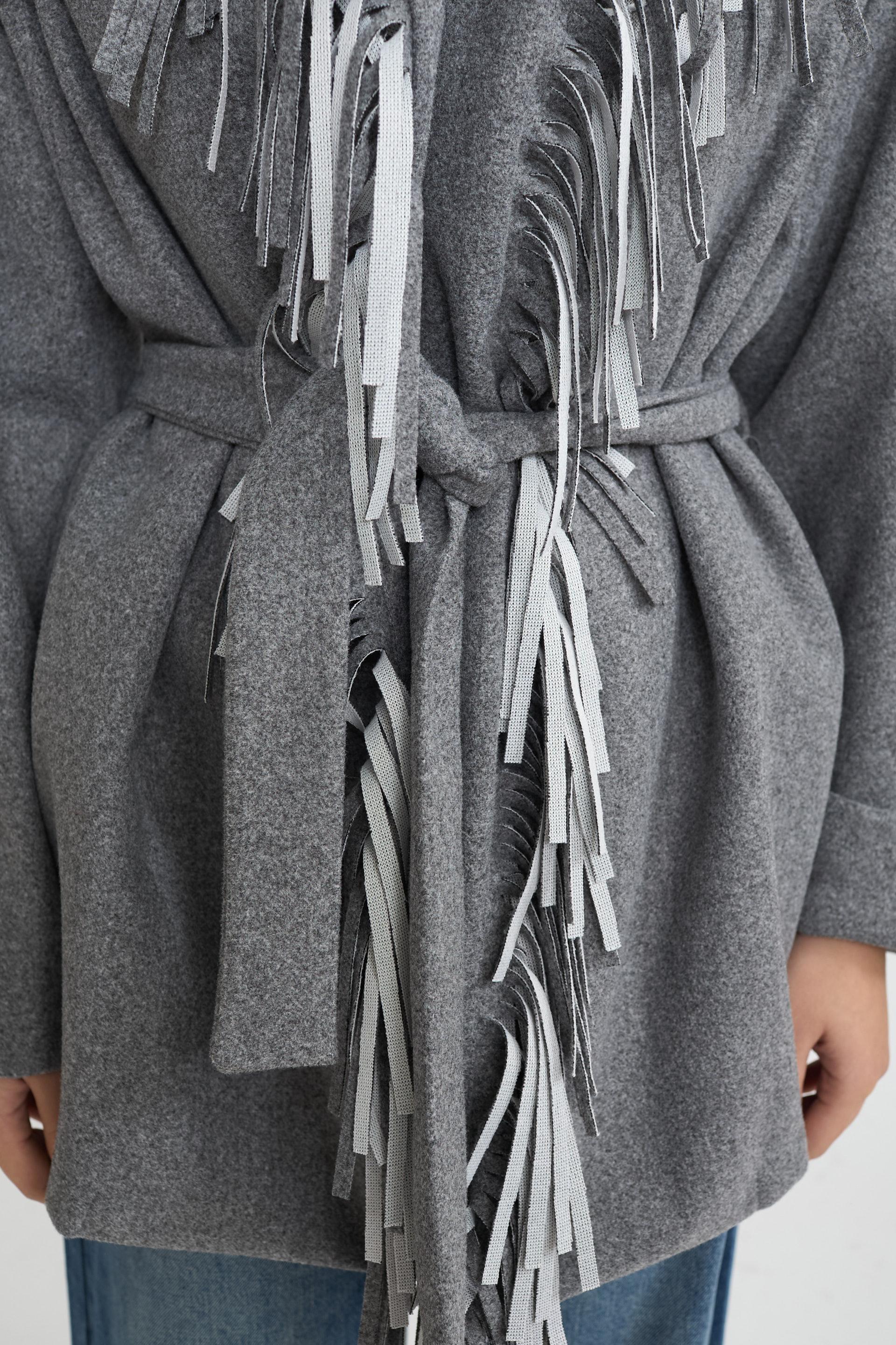 | Cappotto 3/4 in panno con cinta in tessuto e dettaglio di frange. | ||