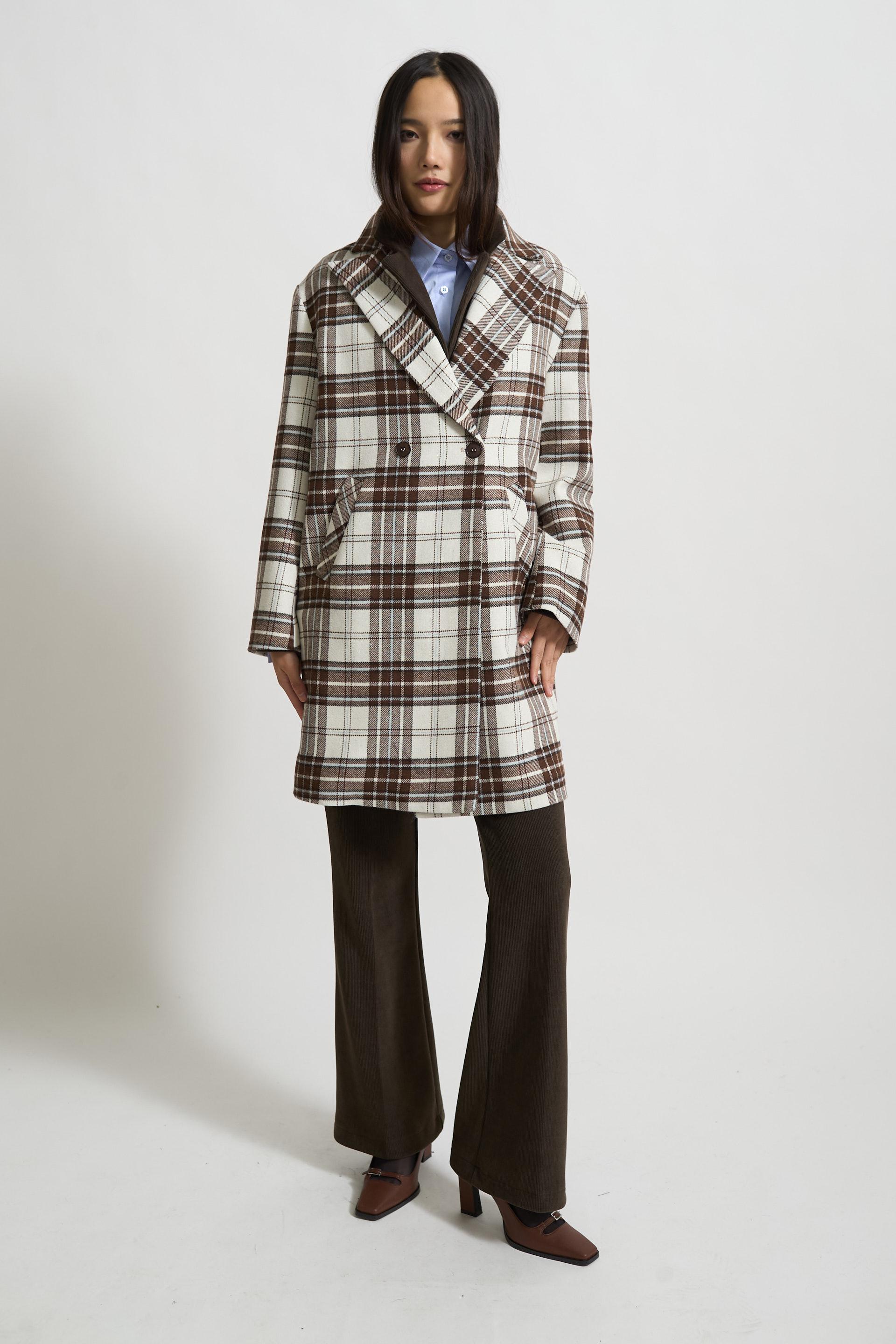 | Cappotto 3/4 doppio petto in tessuto check. Finte tasche laterali e fodera interna. | ||