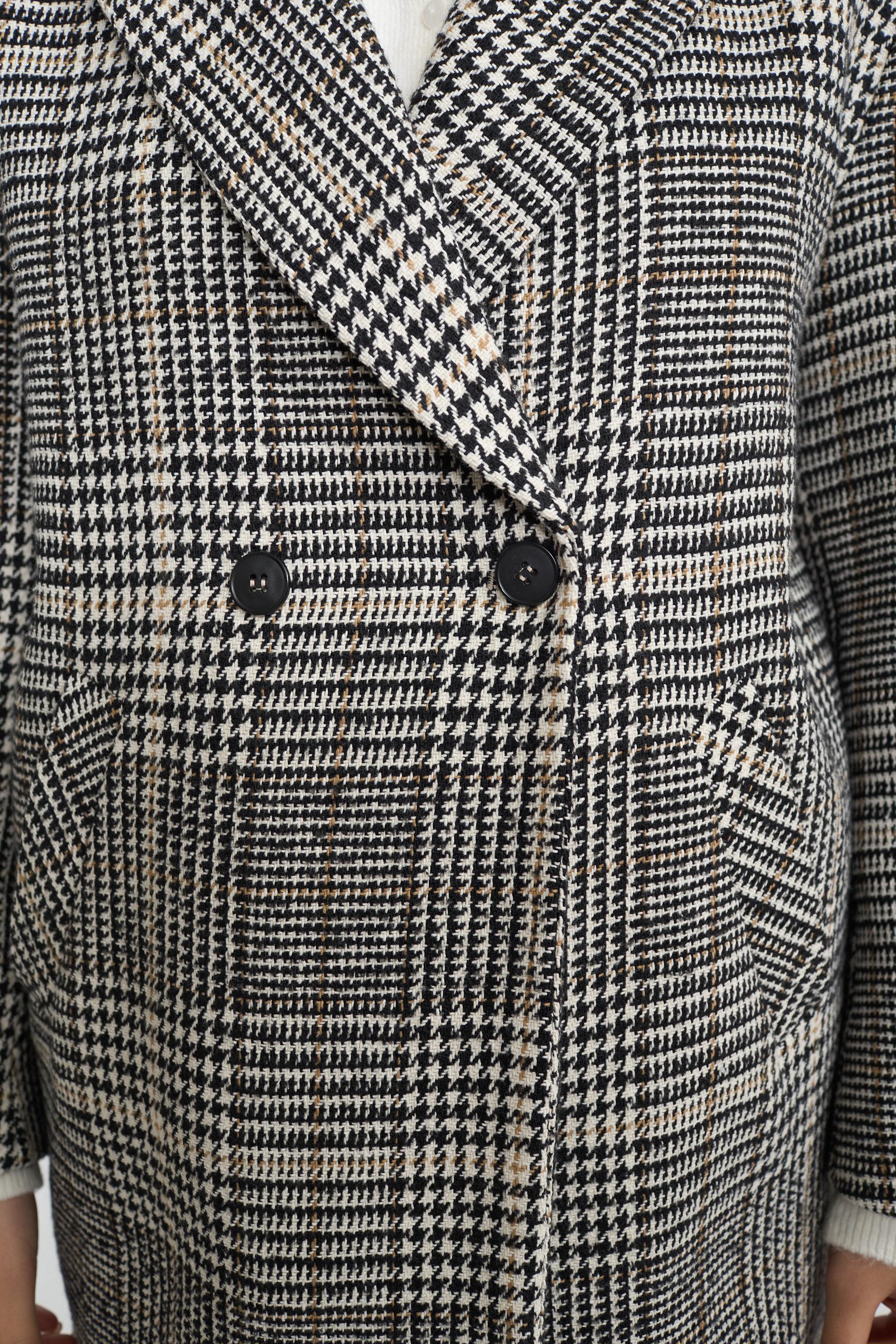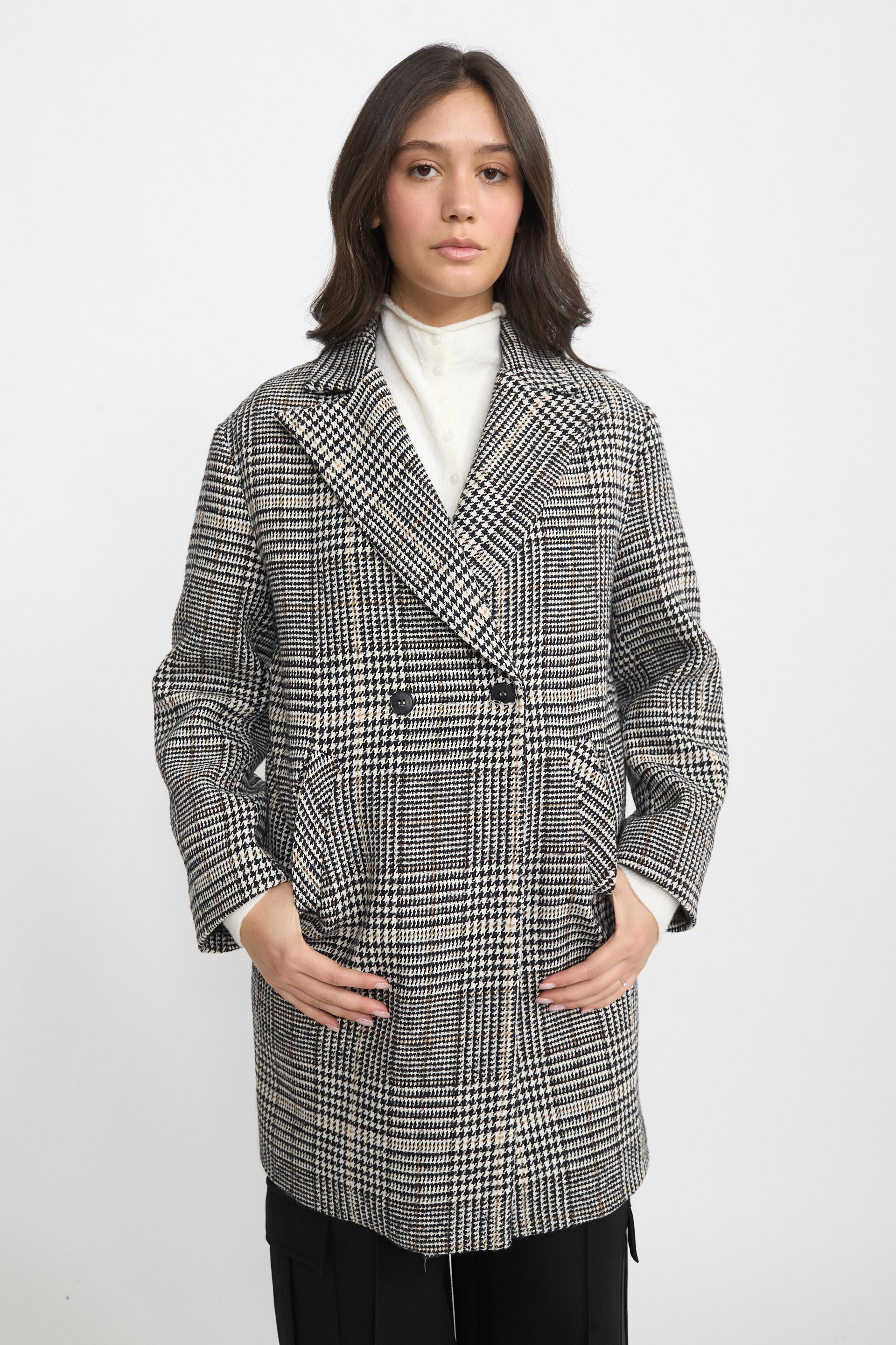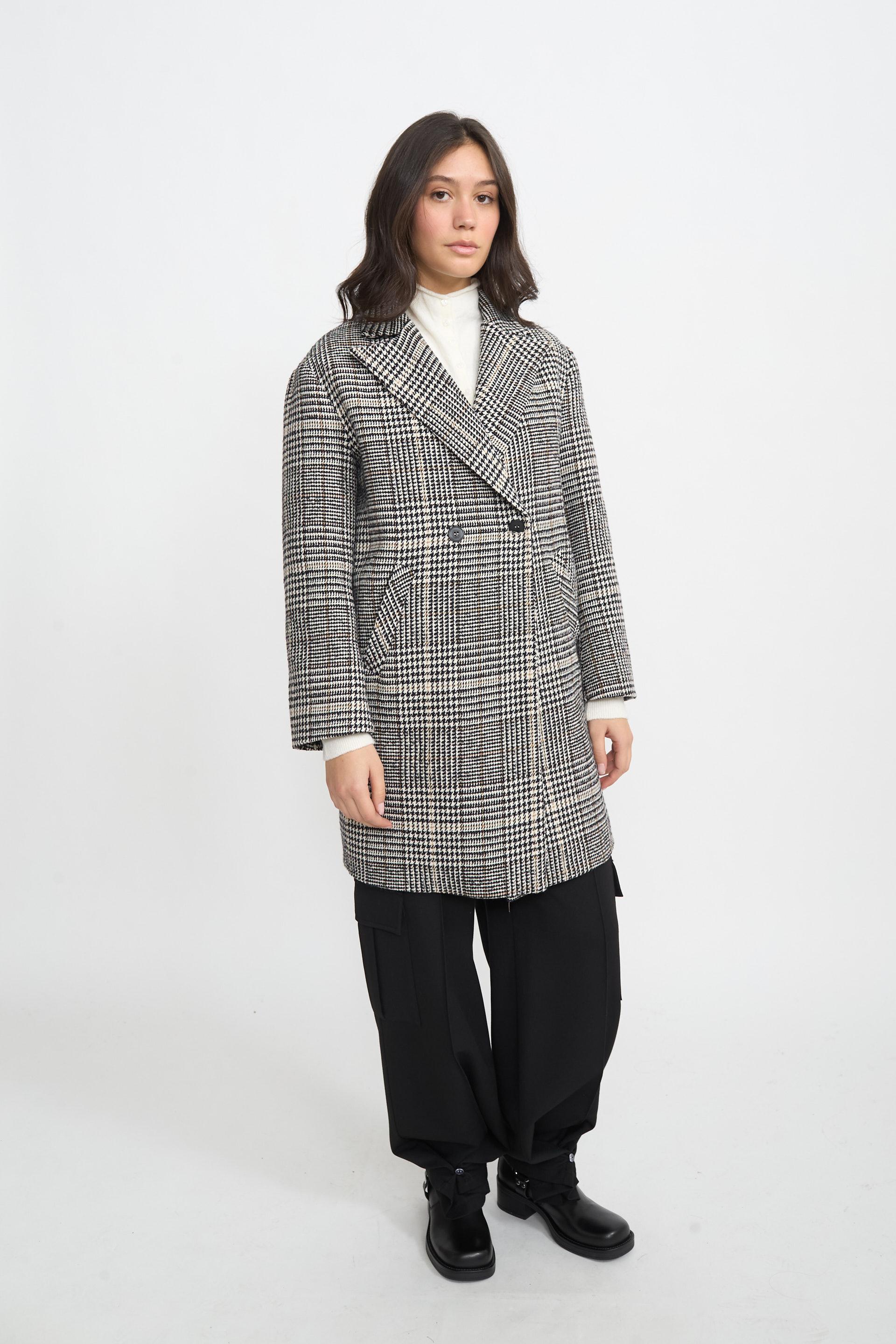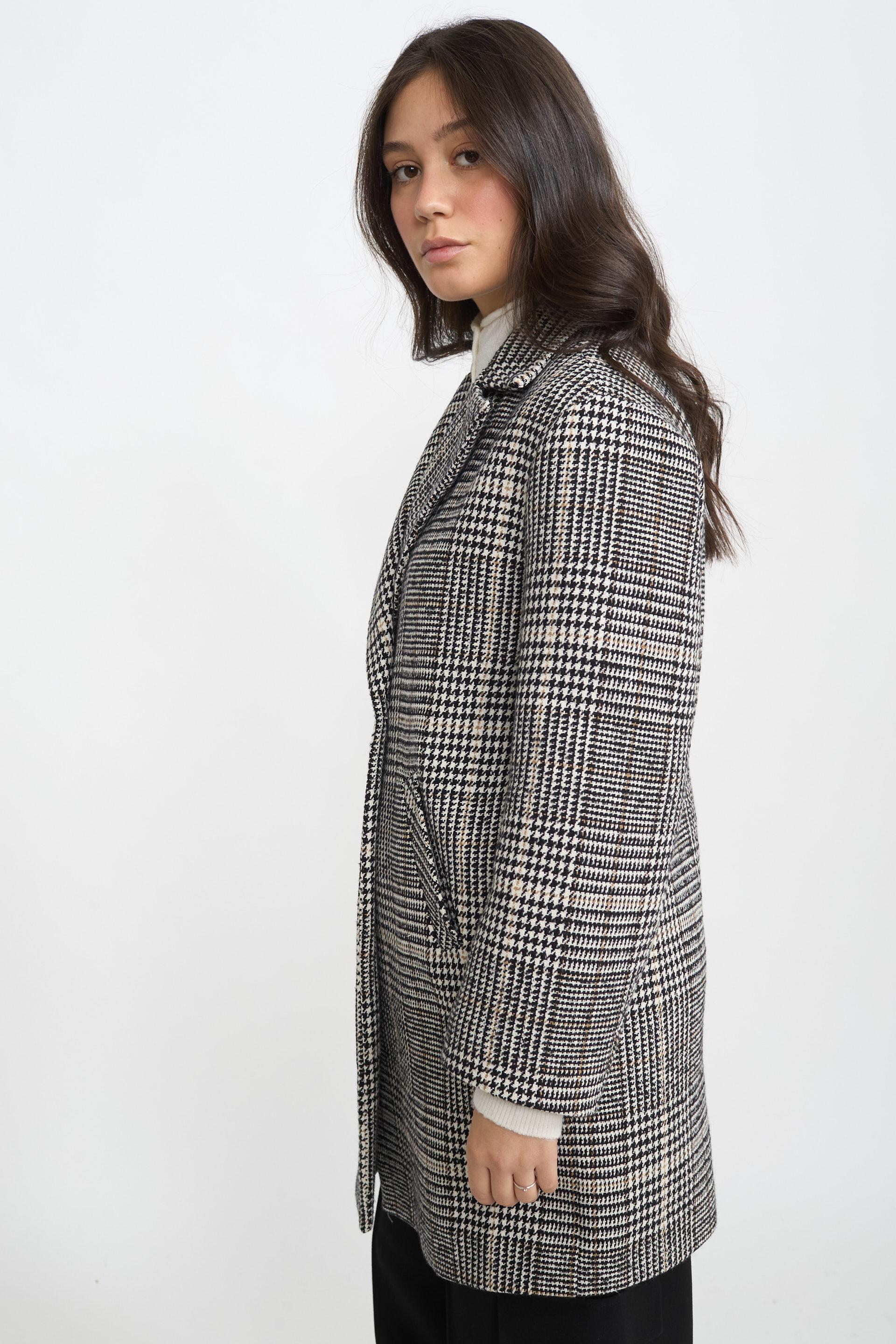 | Cappotto 3/4 doppio petto in tessuto check. Finte tasche laterali e fodera interna. | ||