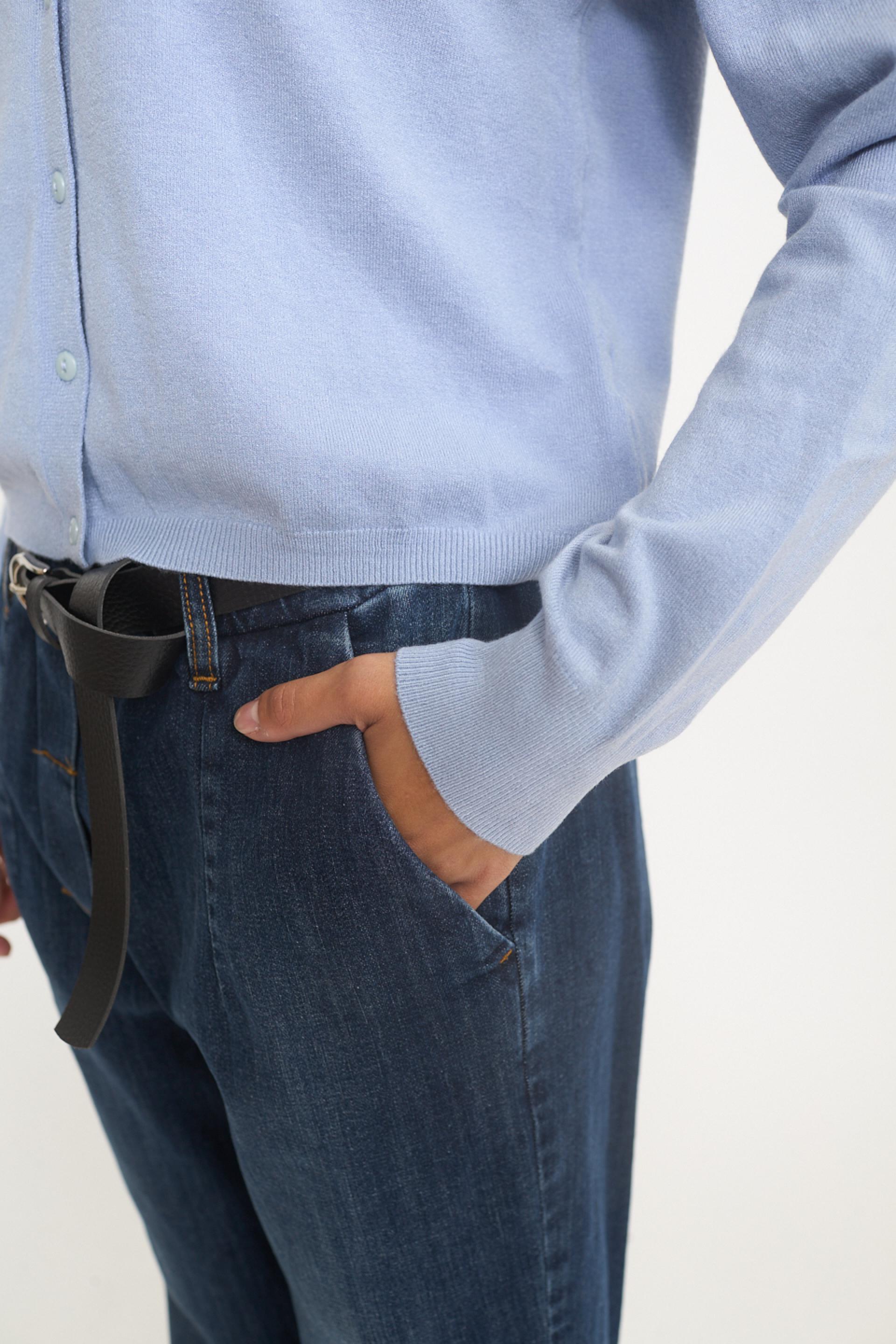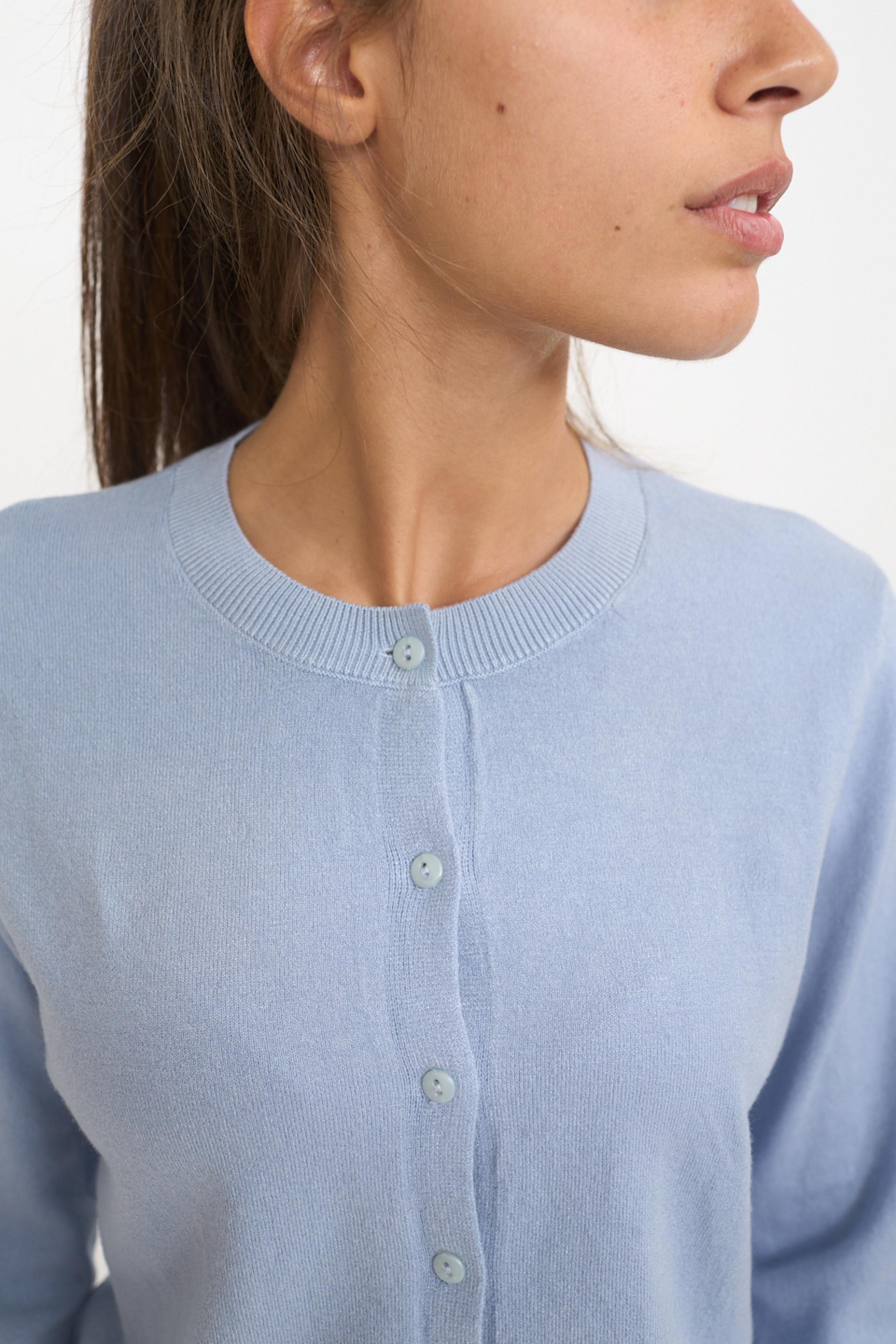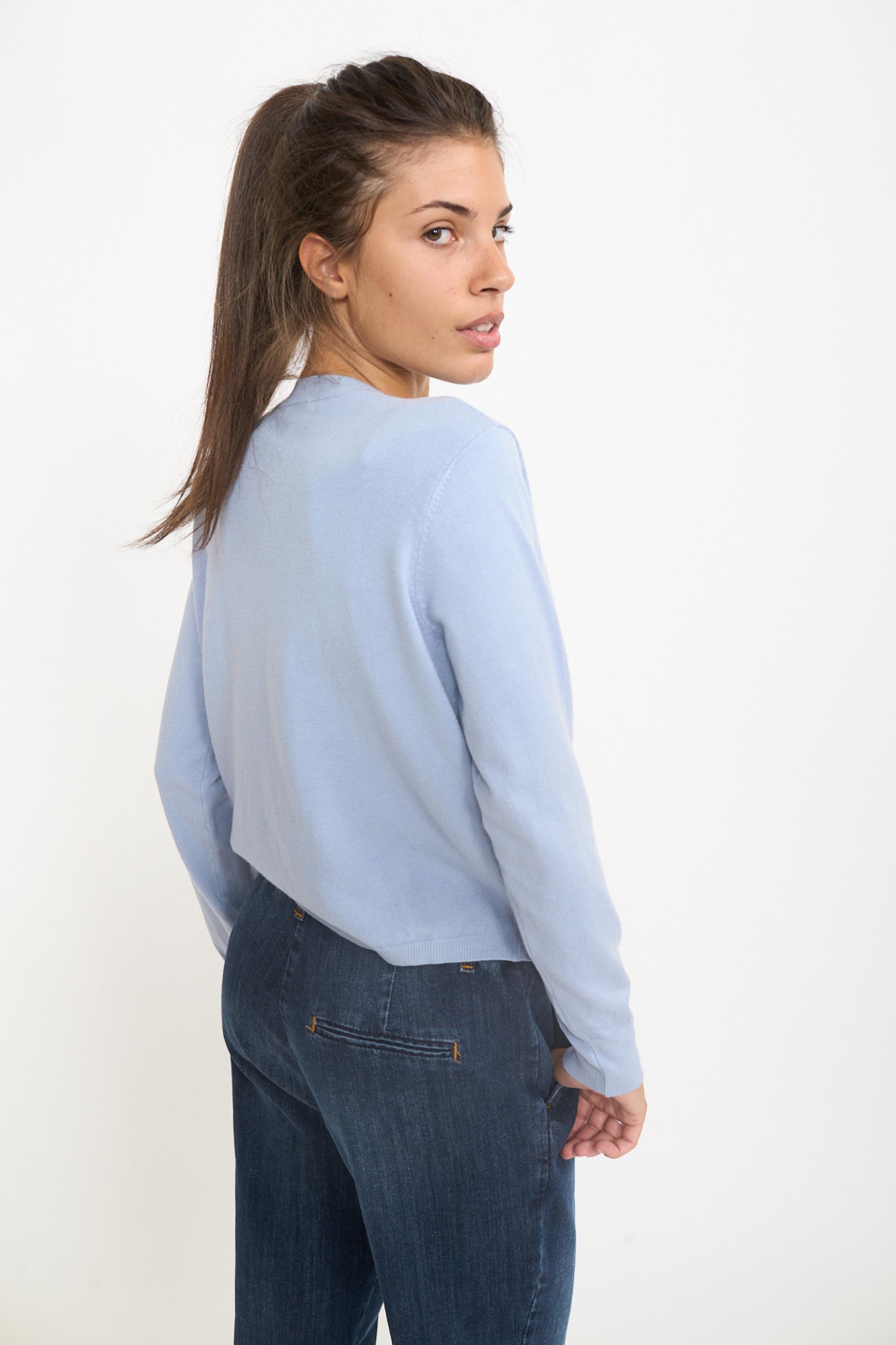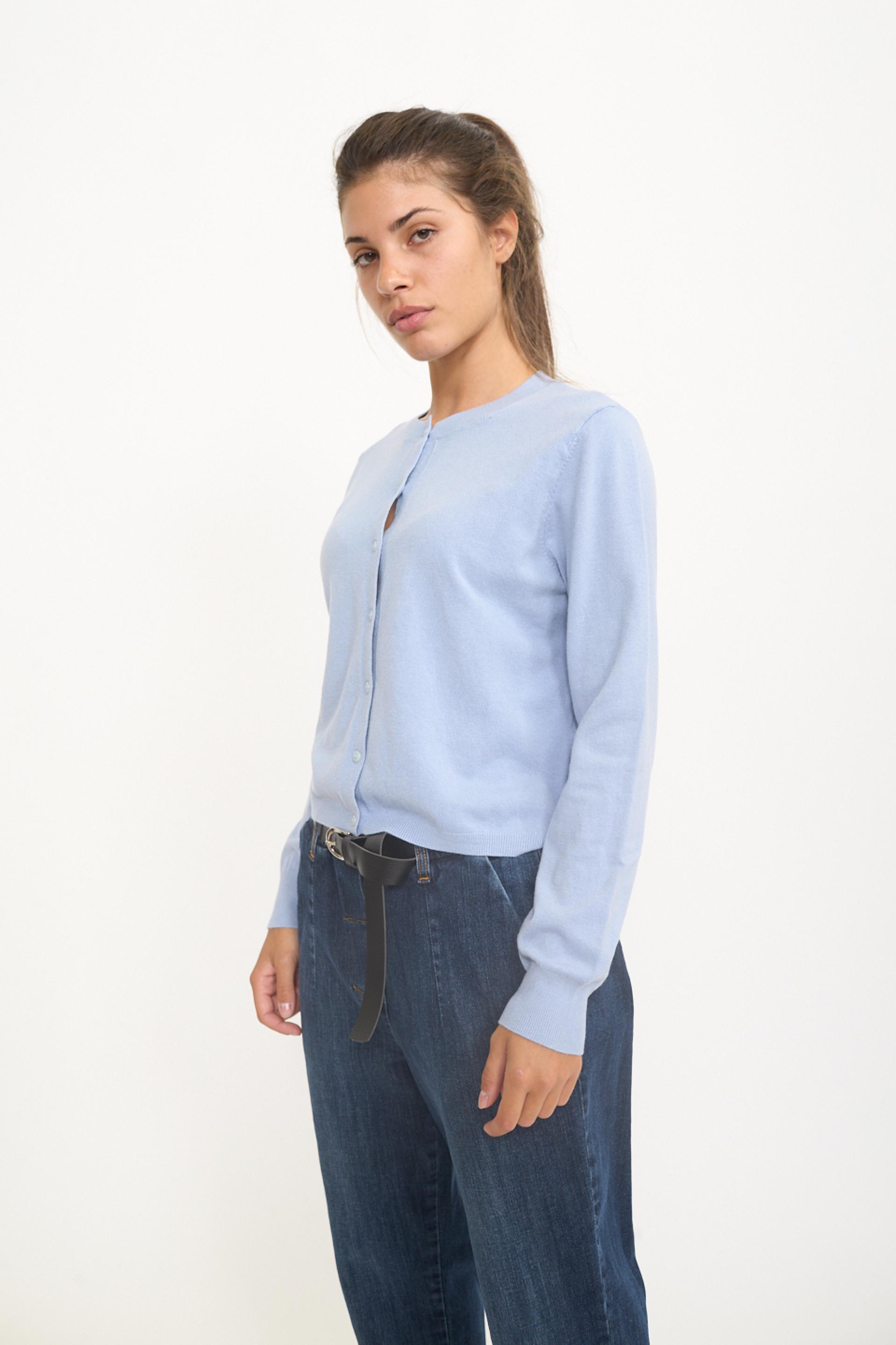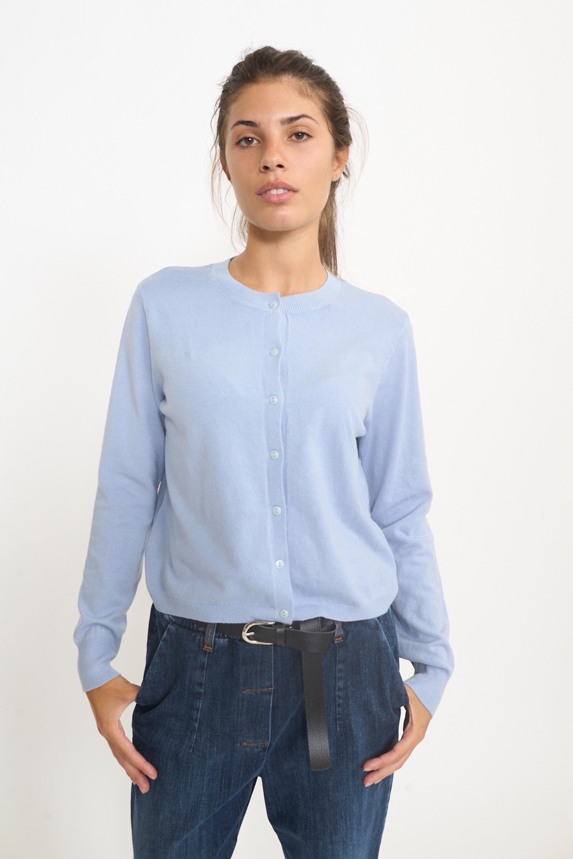 Cardigan scollo rotondo in misto viscosa tinta unita. Dettaglio di lavorazione a costine su scollo, polsini e orlo. Chiusura tramite bottoni tono su tono. | ||