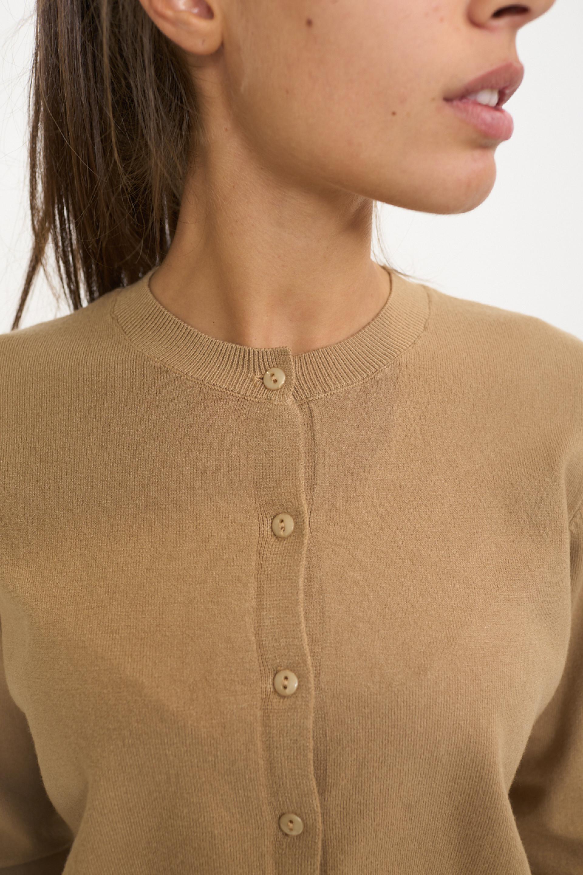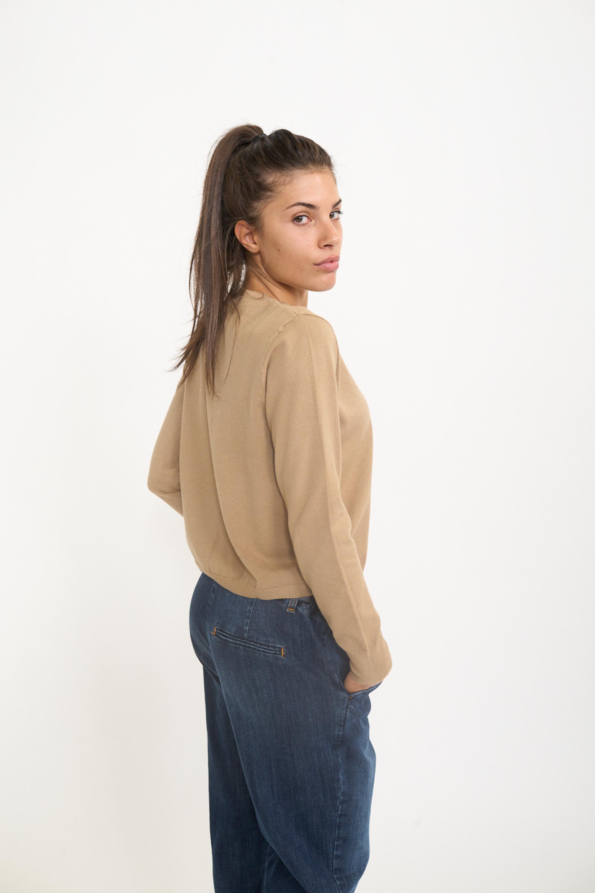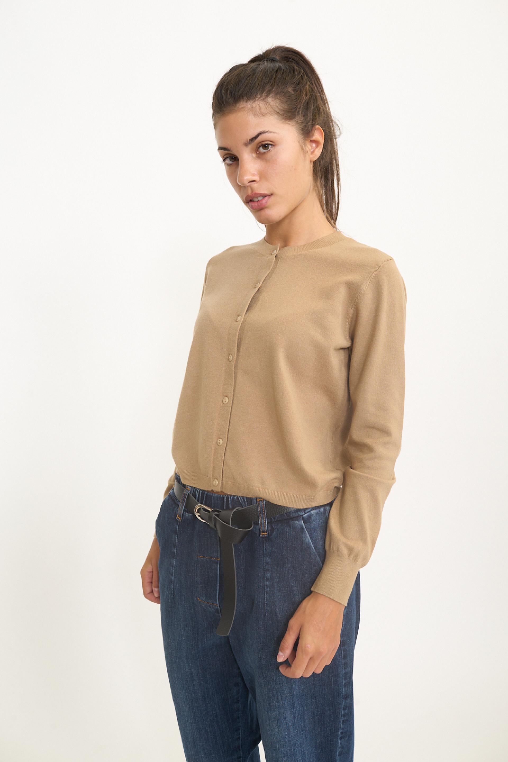 Cardigan scollo rotondo in misto viscosa tinta unita. Dettaglio di lavorazione a costine su scollo, polsini e orlo. Chiusura tramite bottoni tono su tono. | ||