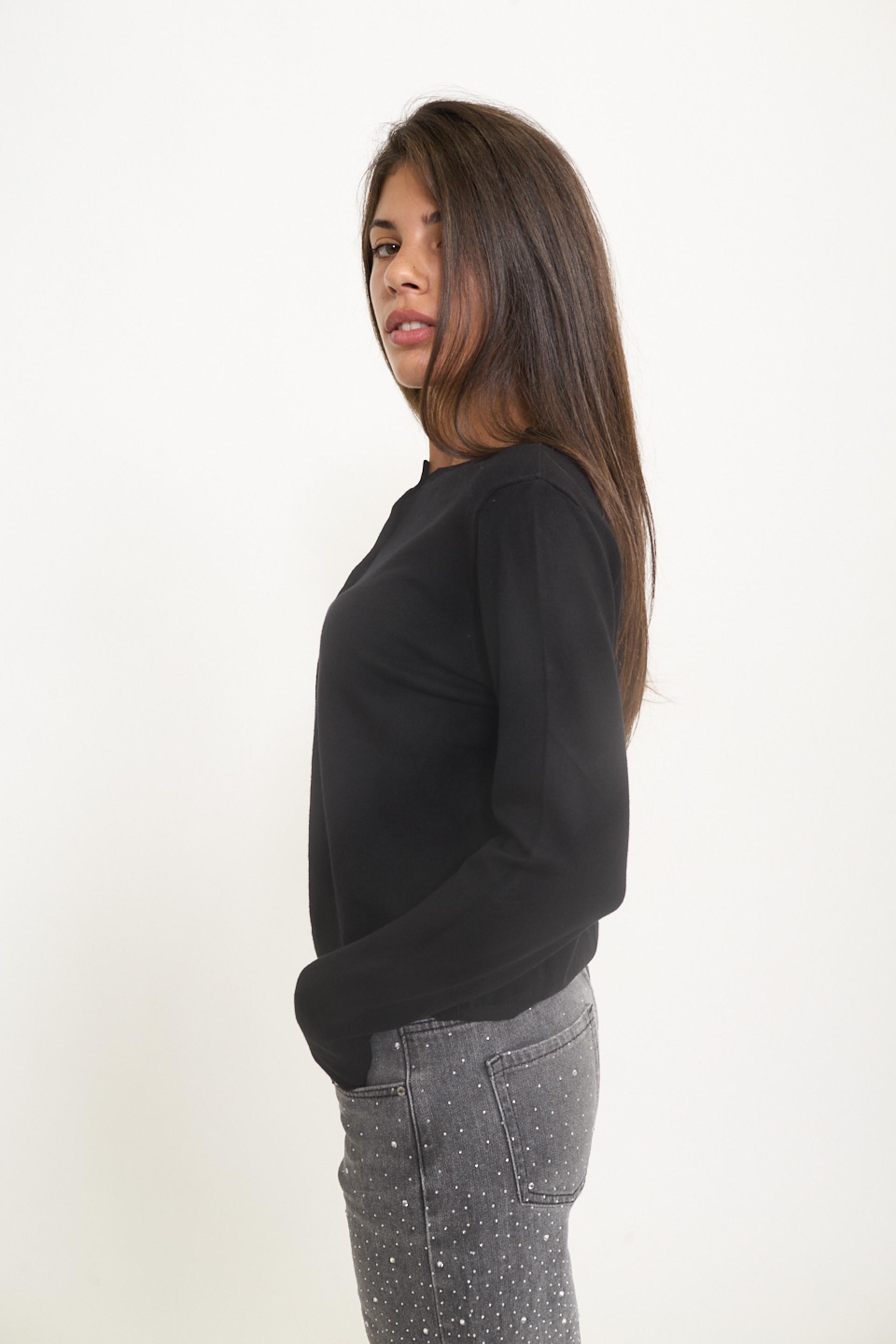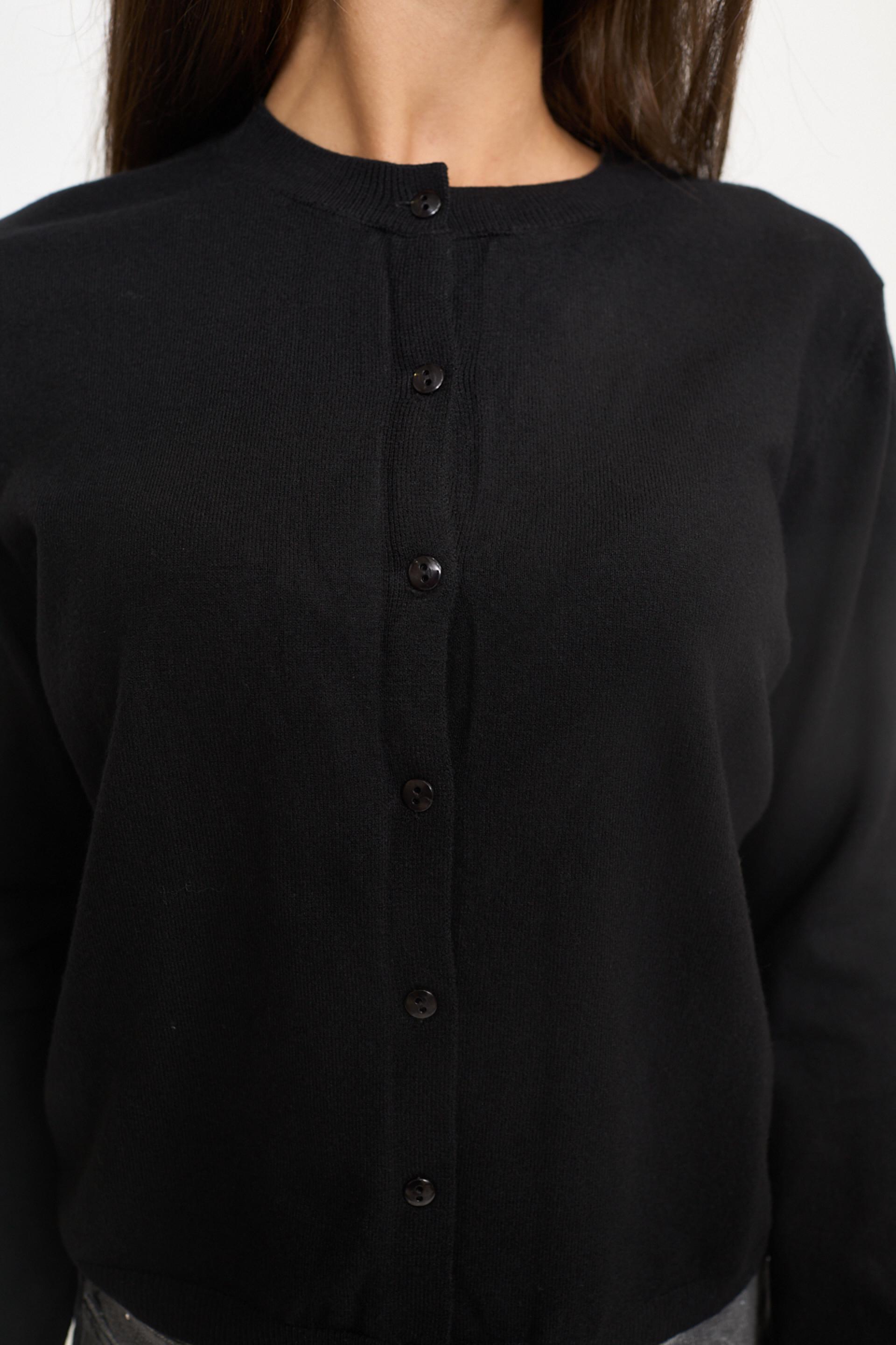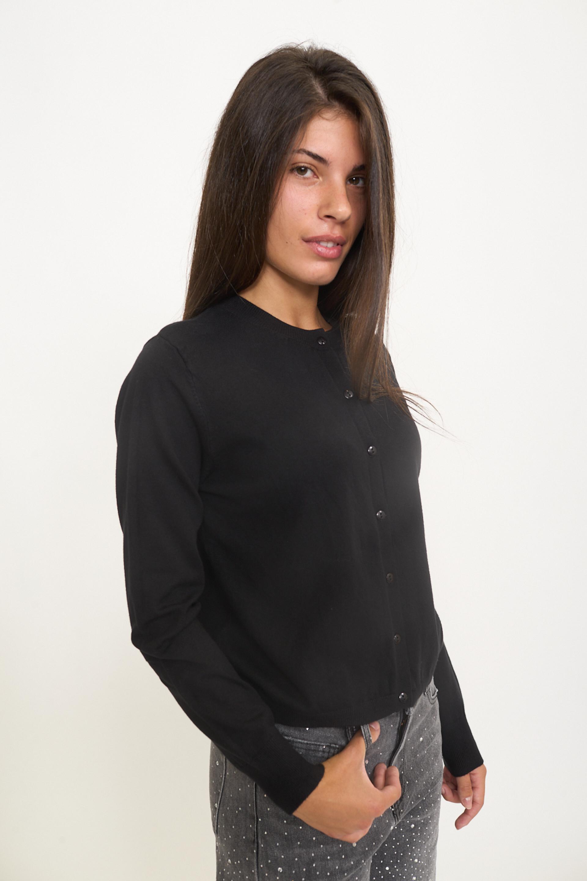 Cardigan scollo rotondo in misto viscosa tinta unita. Dettaglio di lavorazione a costine su scollo, polsini e orlo. Chiusura tramite bottoni tono su tono. | ||