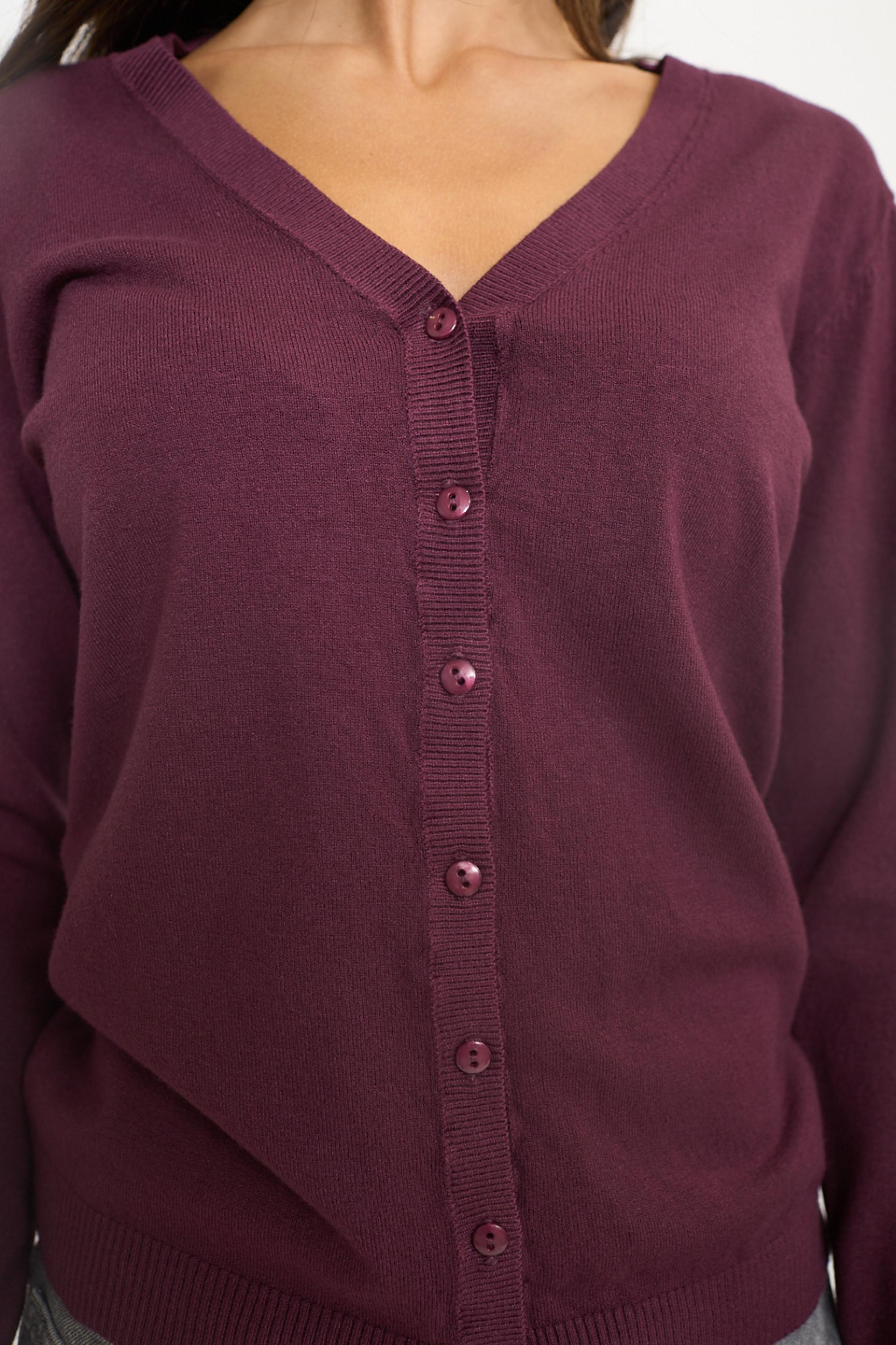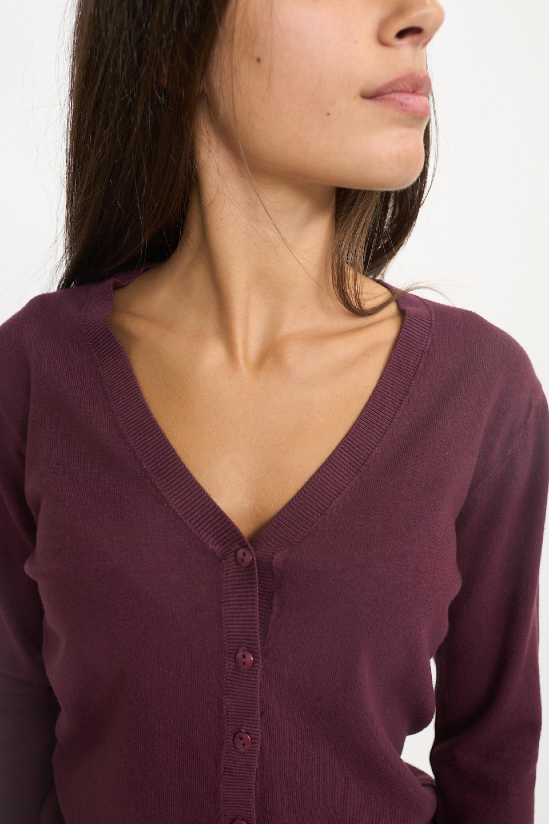 Cardigan scollo V in misto viscosa tinta unita. Dettaglio di lavorazione a costine su scollo, polsini e orlo. Chiusura tramite bottoni tono su tono. | ||
