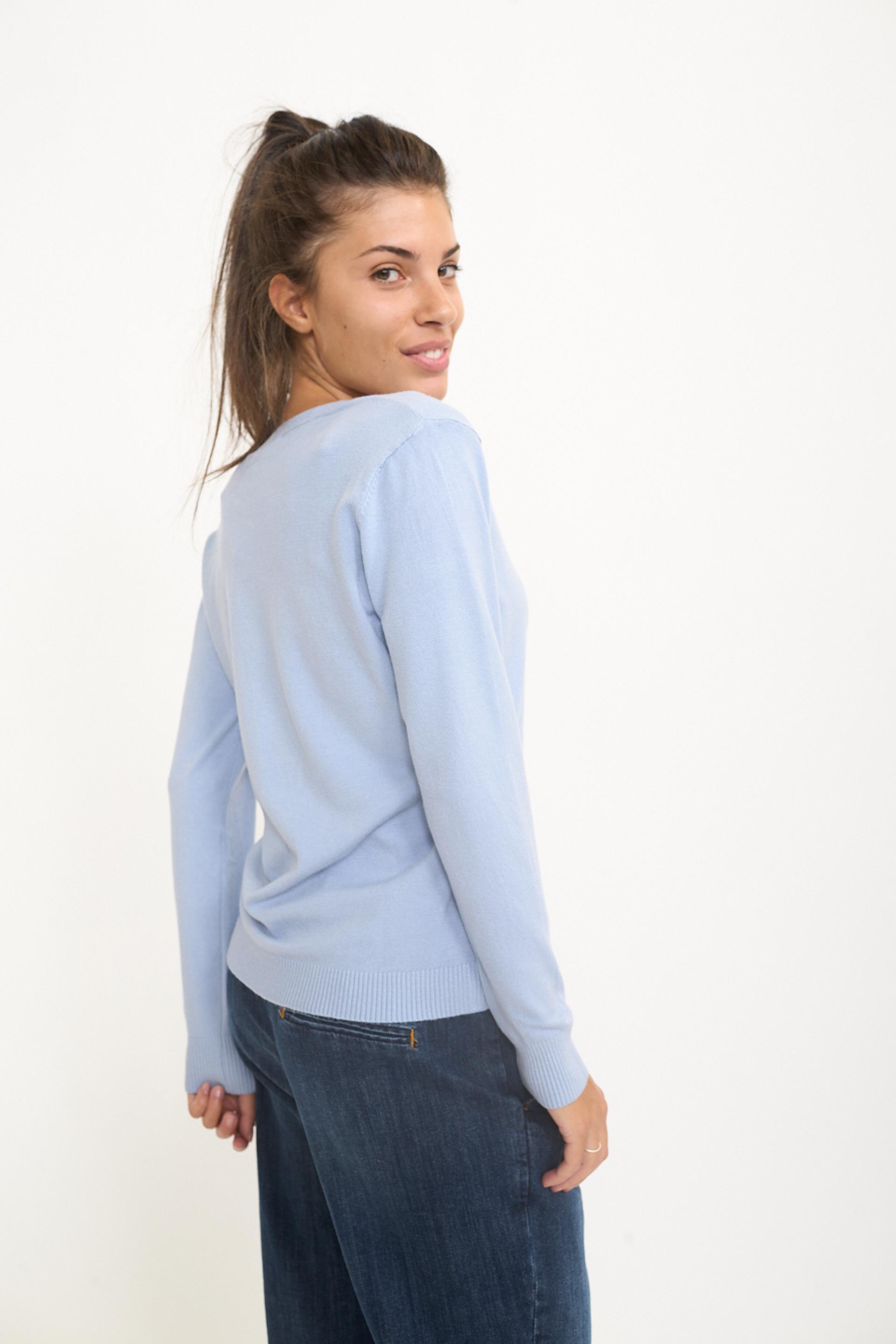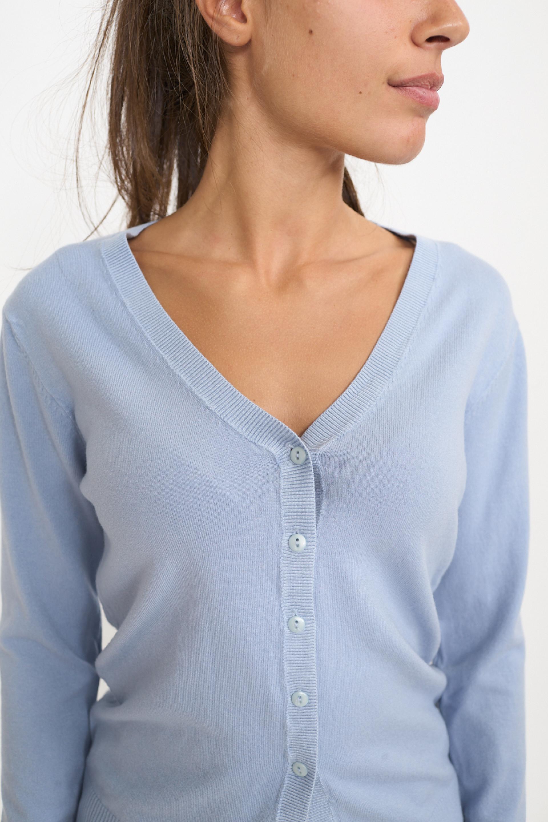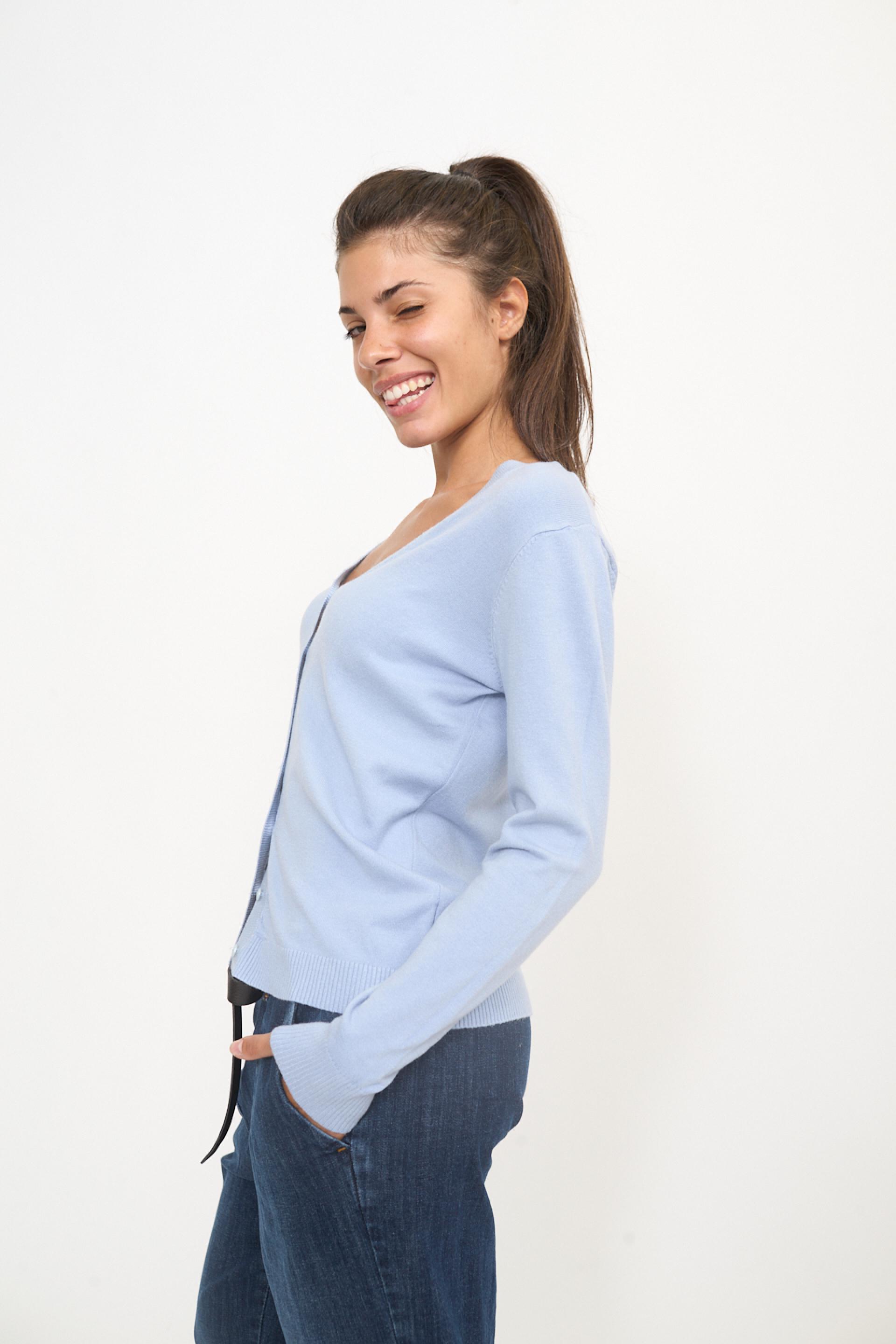 Cardigan scollo V in misto viscosa tinta unita. Dettaglio di lavorazione a costine su scollo, polsini e orlo. Chiusura tramite bottoni tono su tono. | ||