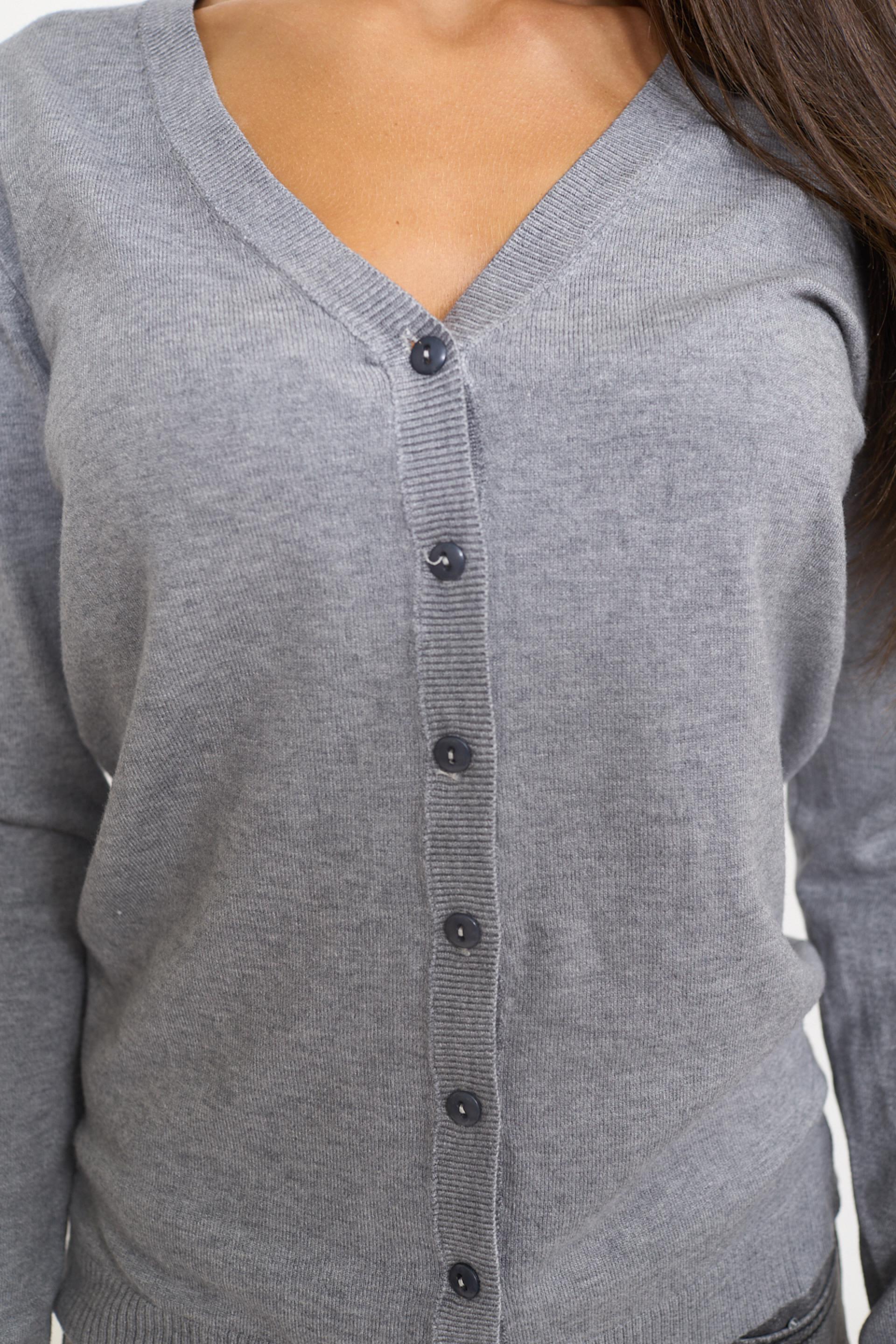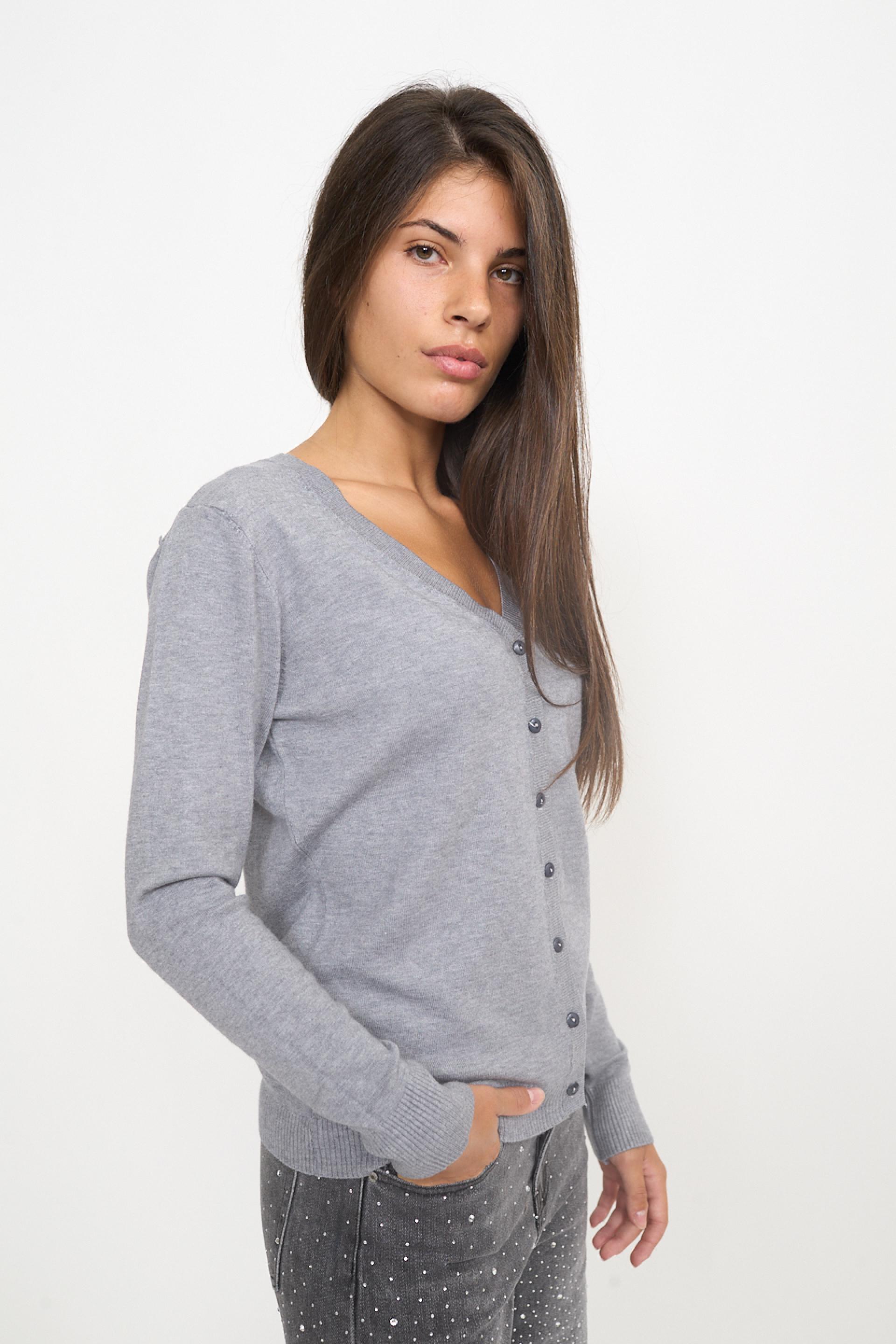 Cardigan scollo V in misto viscosa tinta unita. Dettaglio di lavorazione a costine su scollo, polsini e orlo. Chiusura tramite bottoni tono su tono. | ||