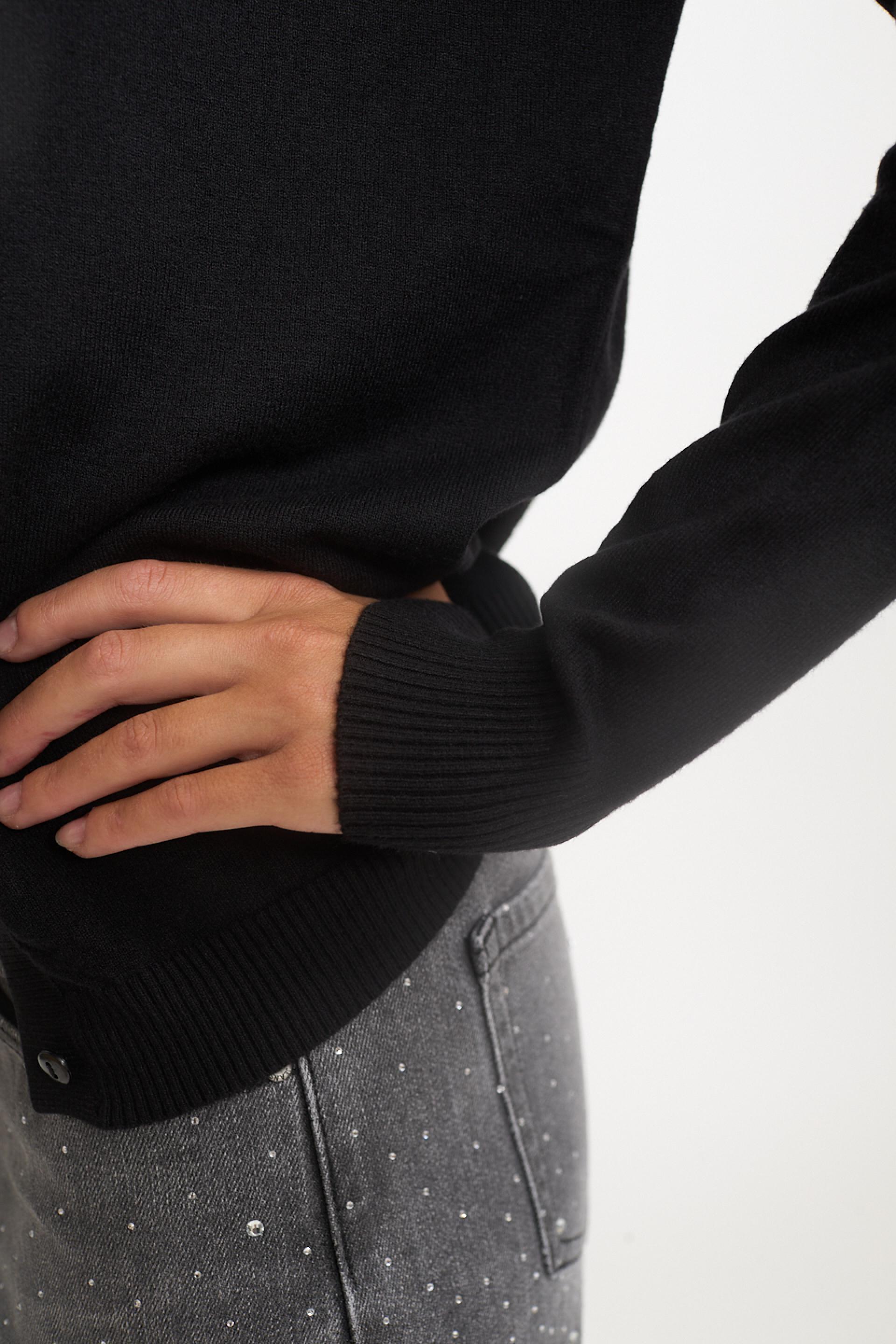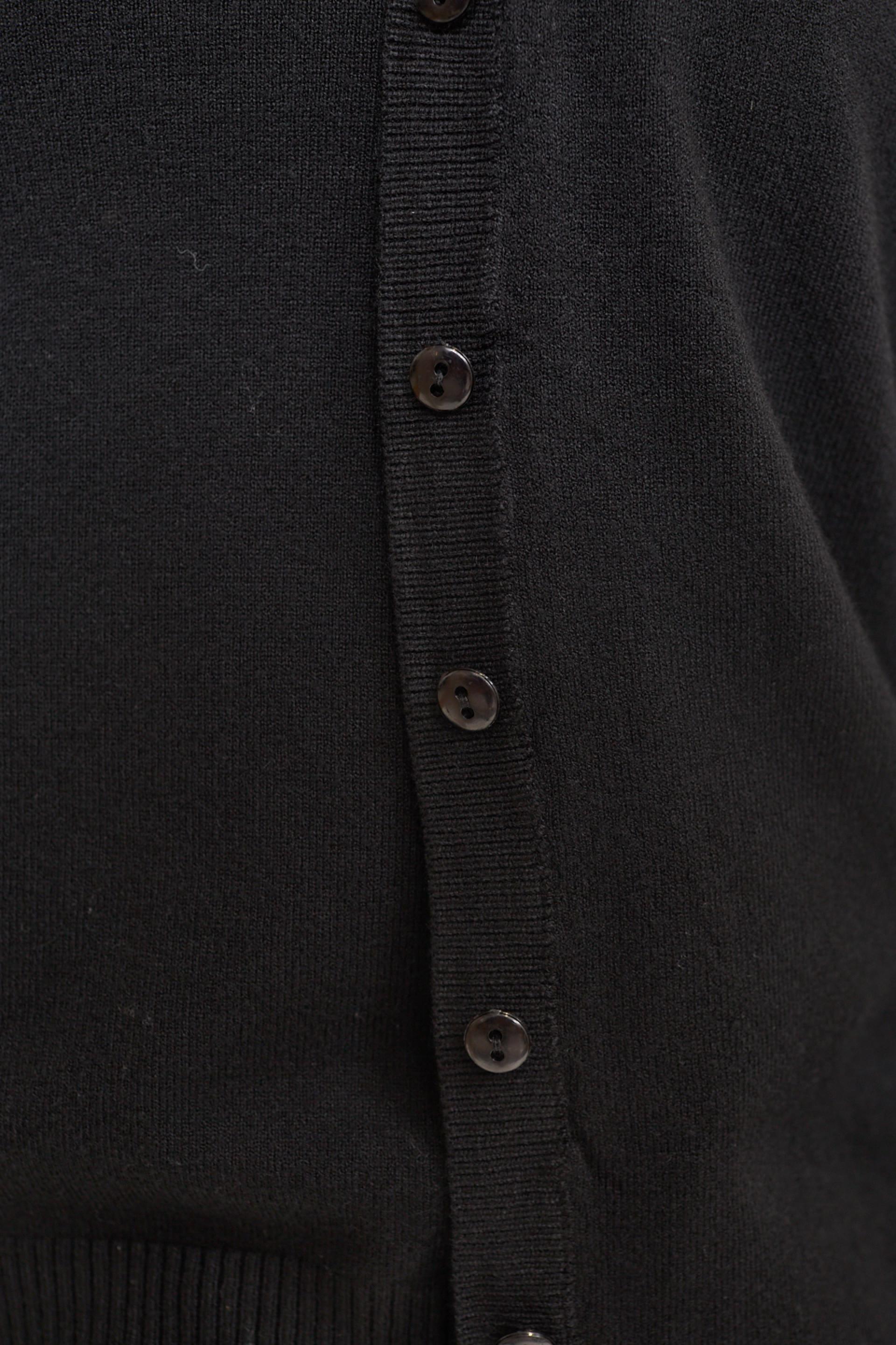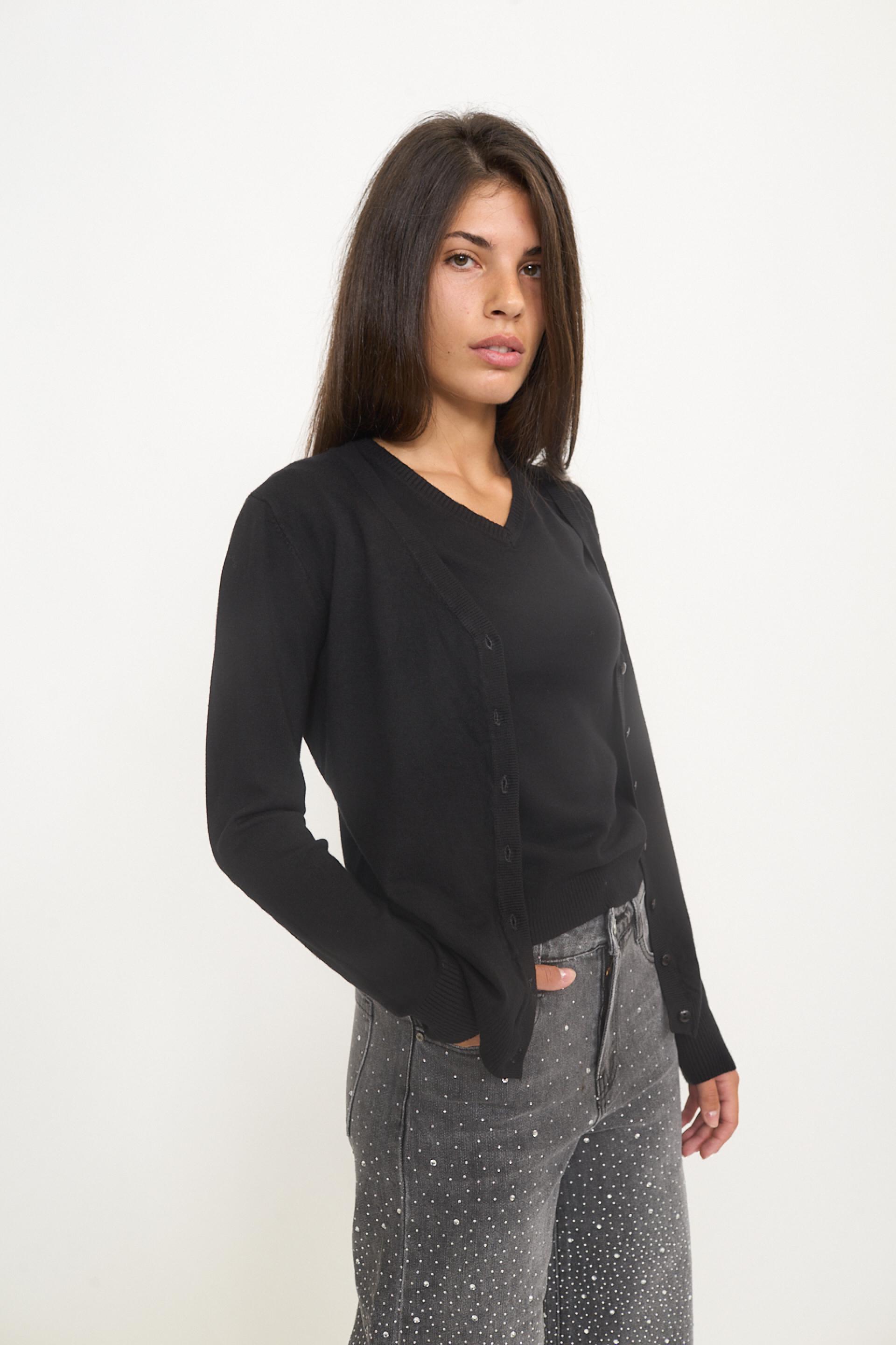 Cardigan scollo V in misto viscosa tinta unita. Dettaglio di lavorazione a costine su scollo, polsini e orlo. Chiusura tramite bottoni tono su tono. | ||