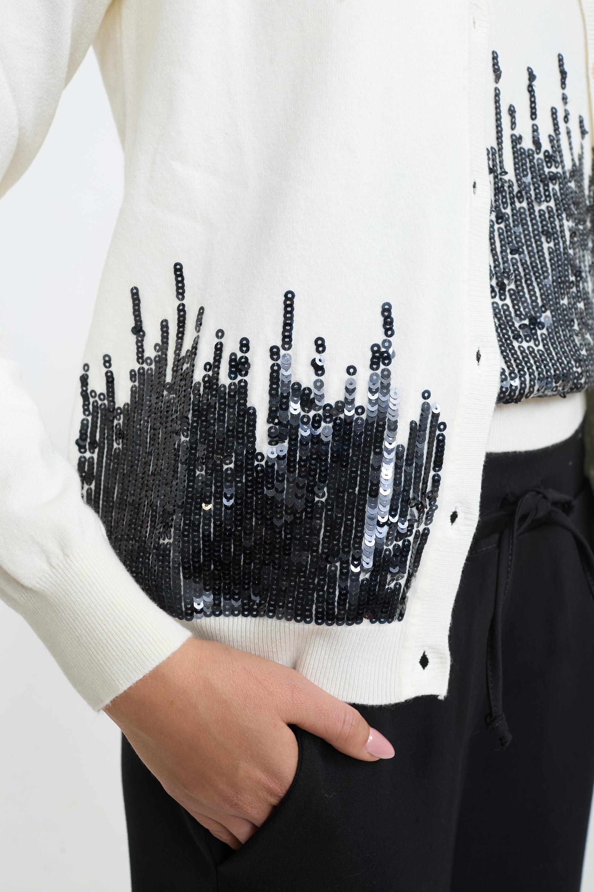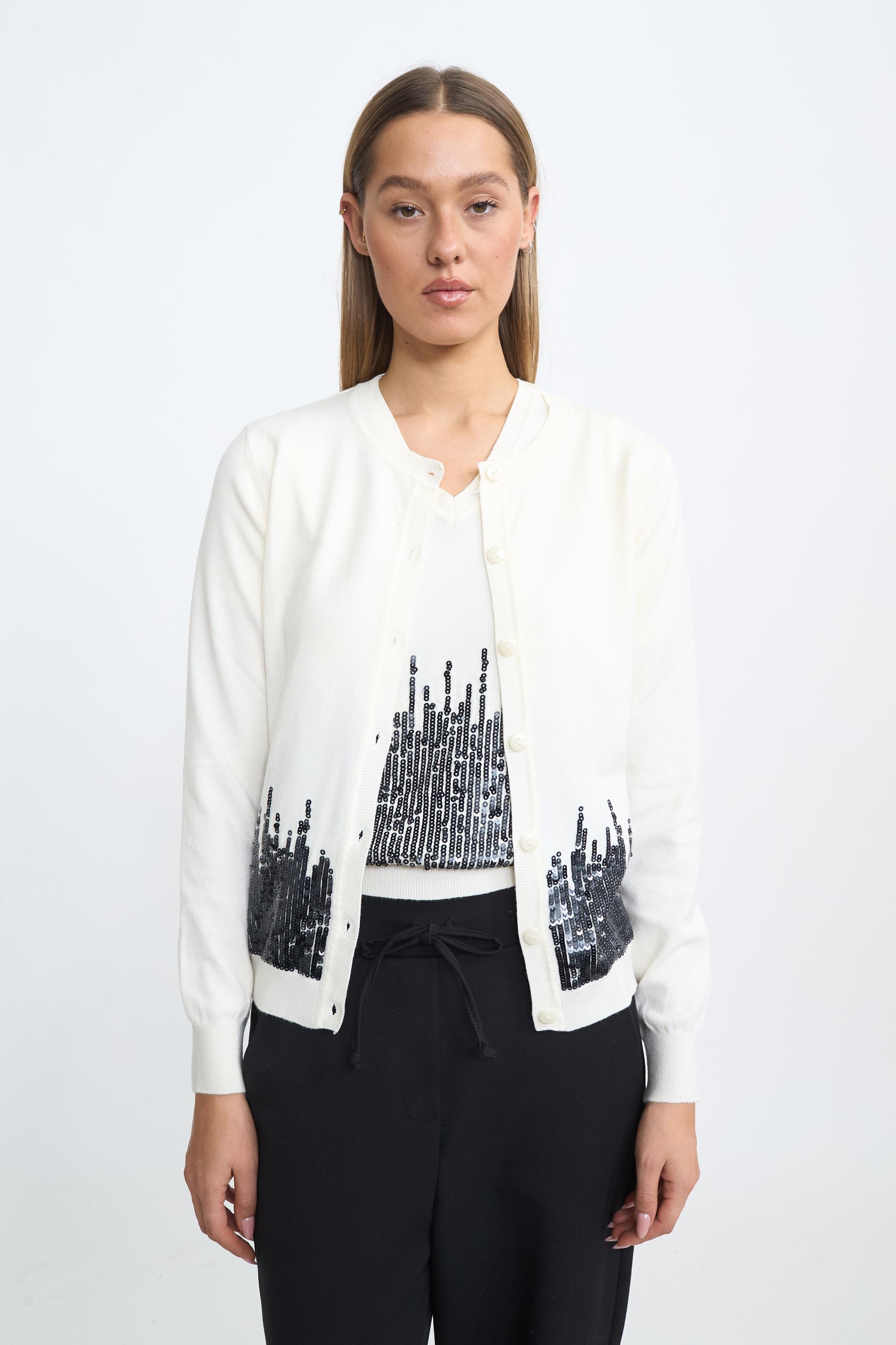 | Cardigan scollo rotondo con dettaglio di disegno di paillettes. Chiusura tramite bottoni. | ||