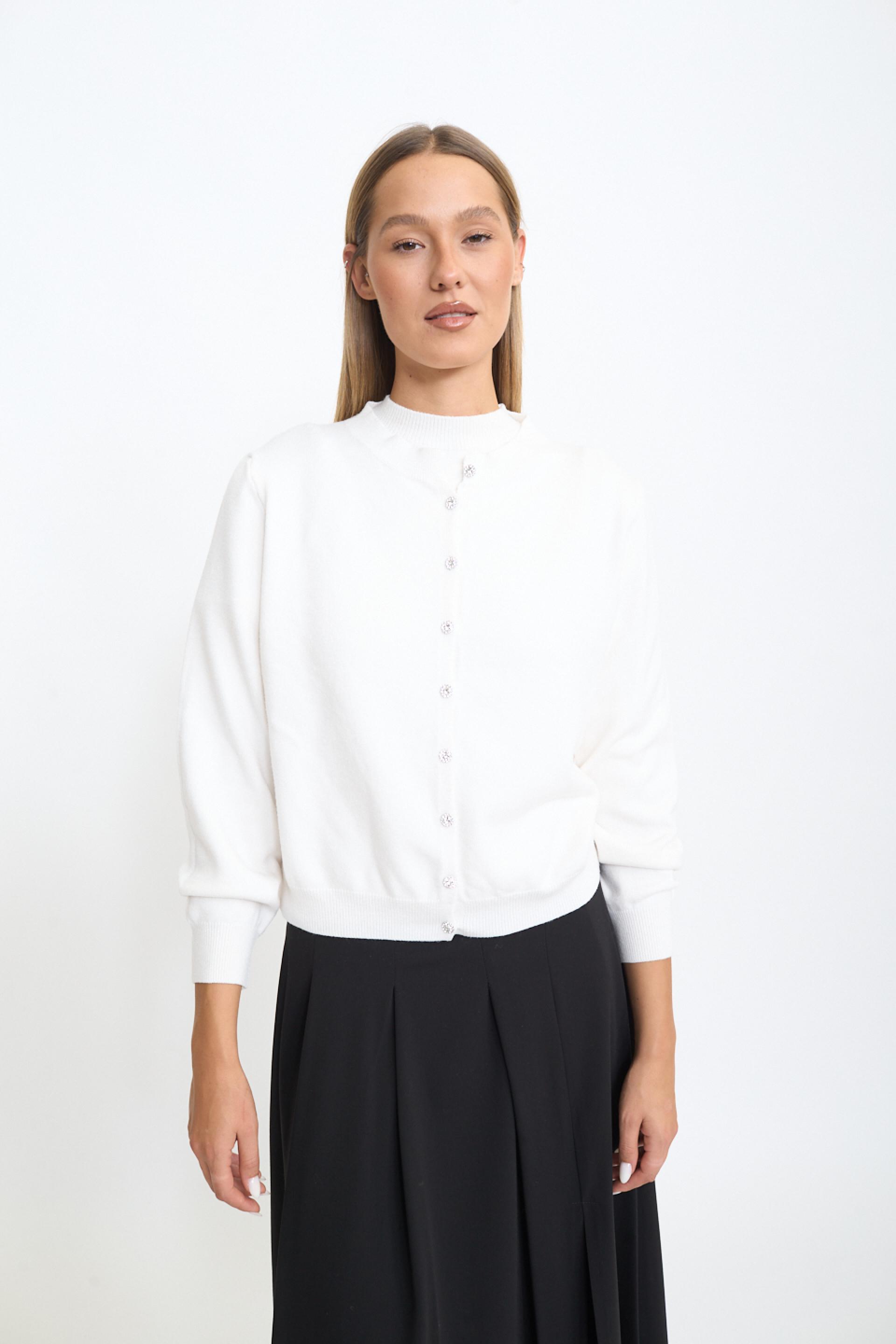 | Cardigan girocollo con chiusura tramite bottoni gioiello. | ||