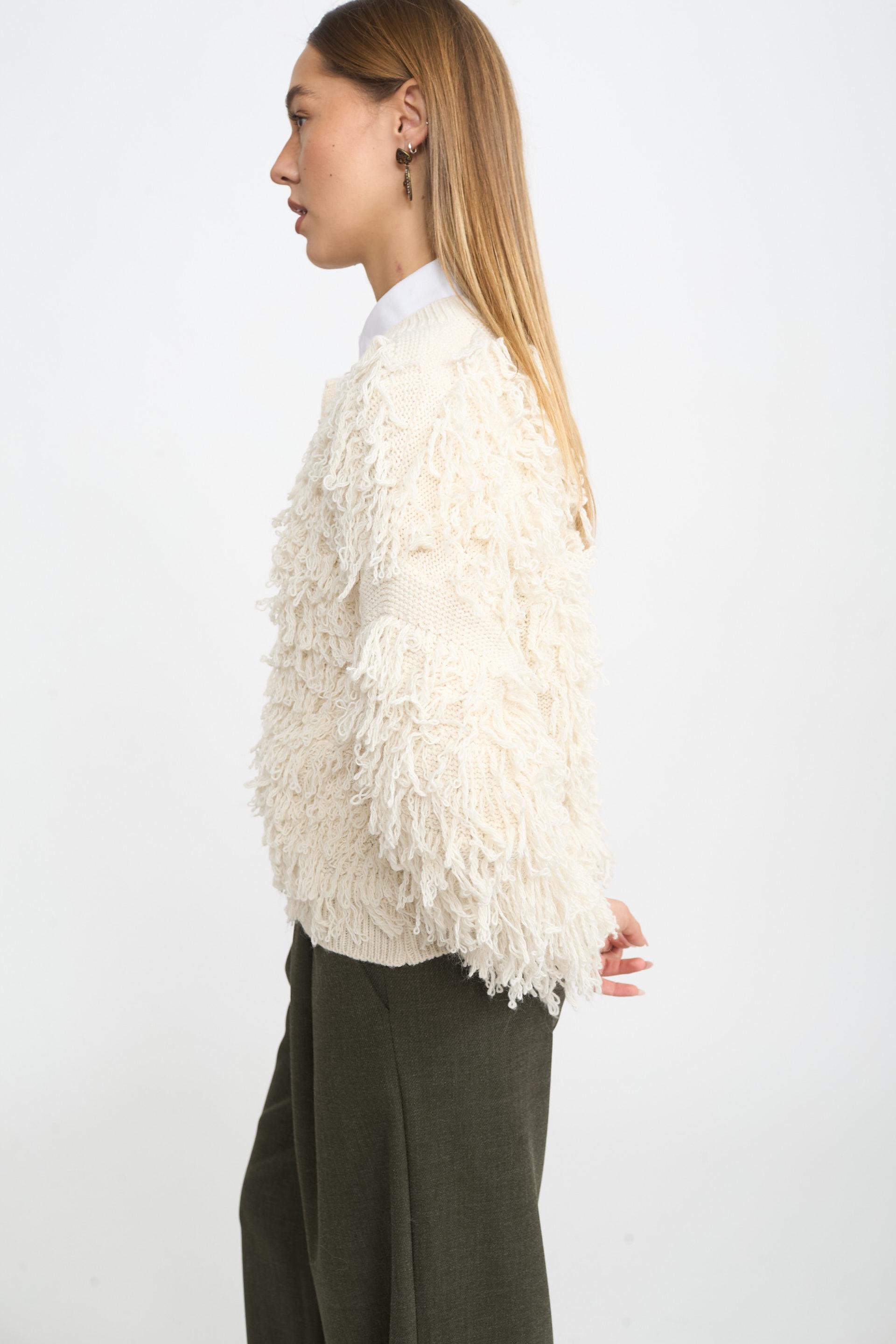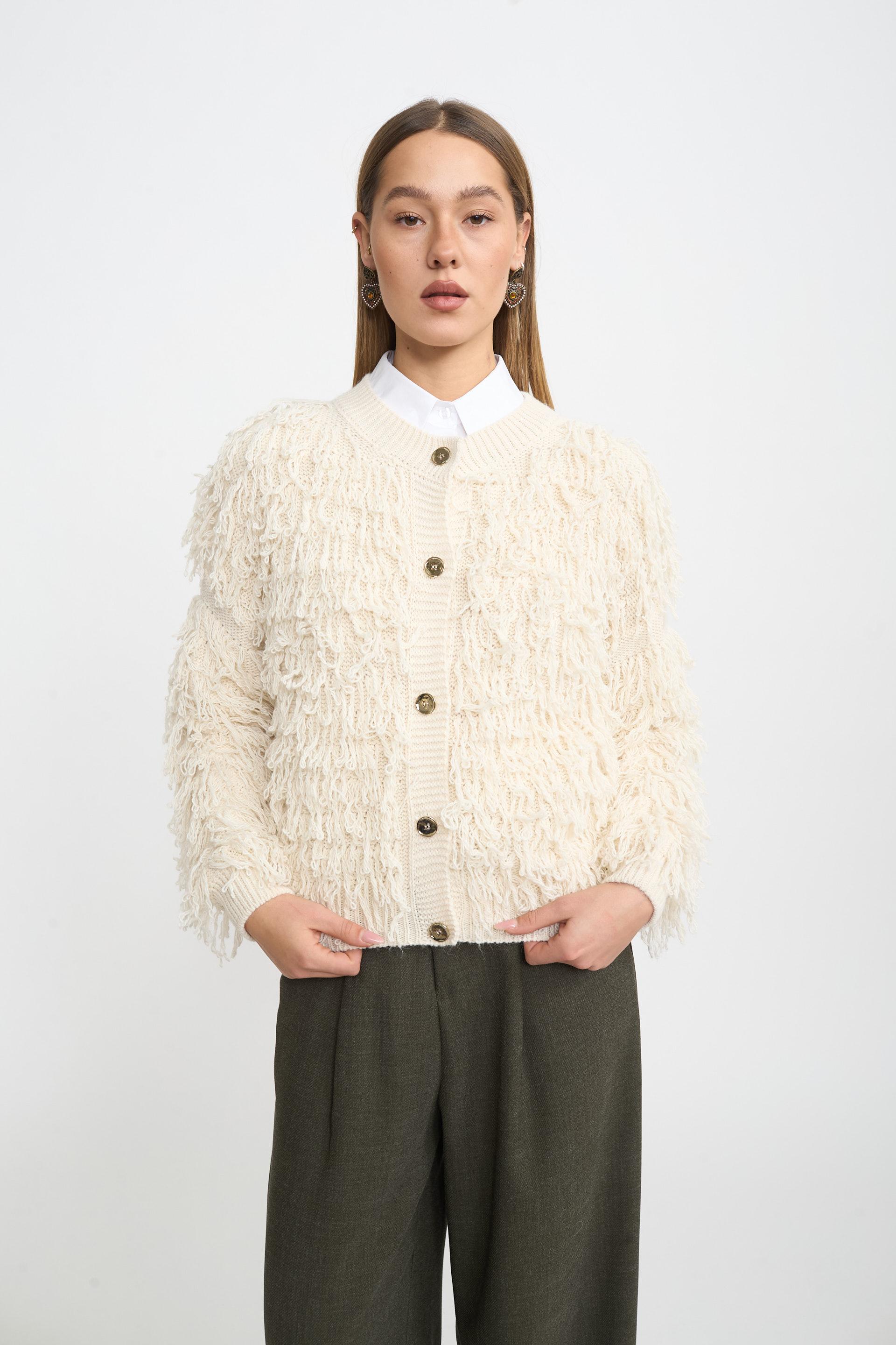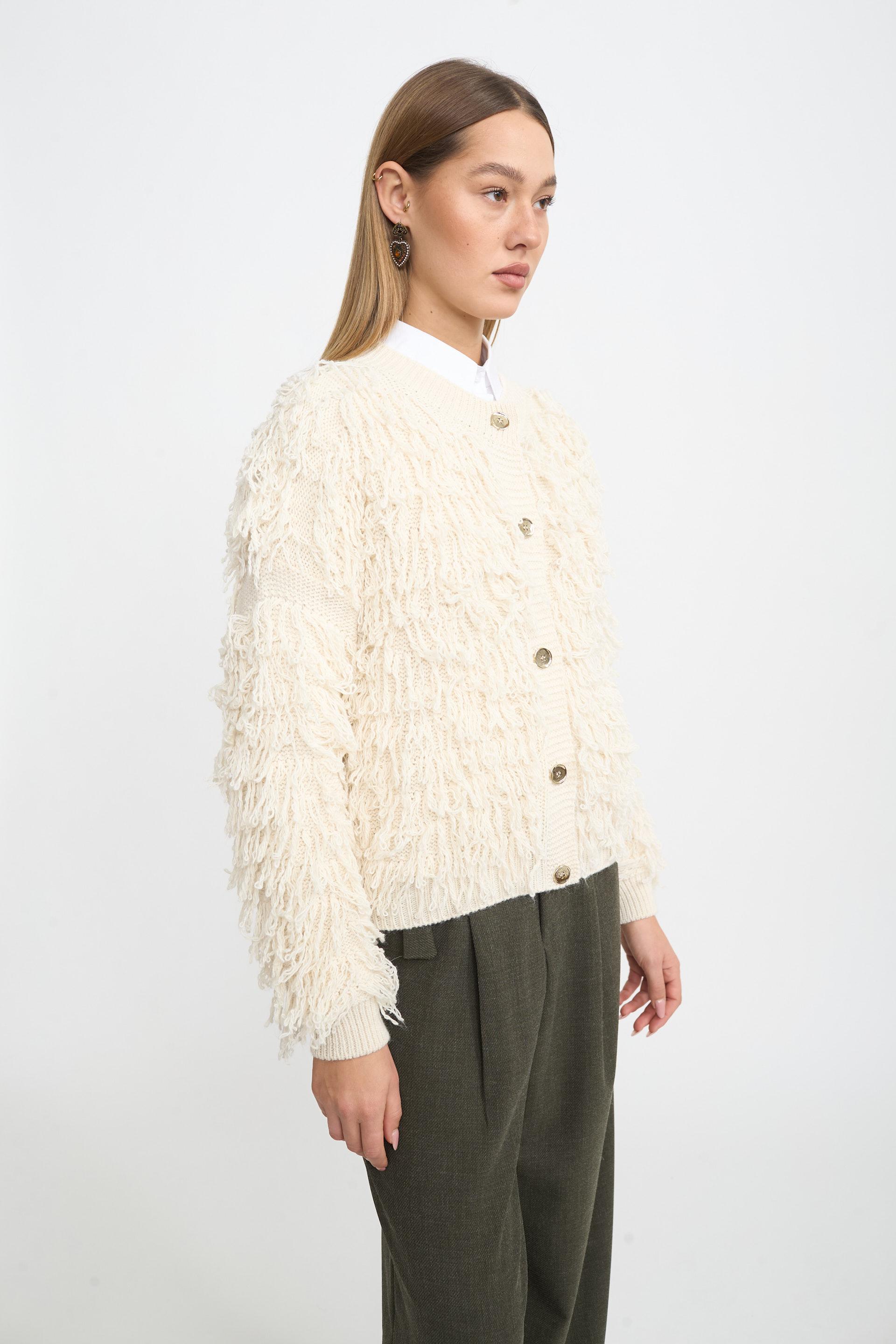 | Cardigan effetto mongolia con bottoni metallici. | ||