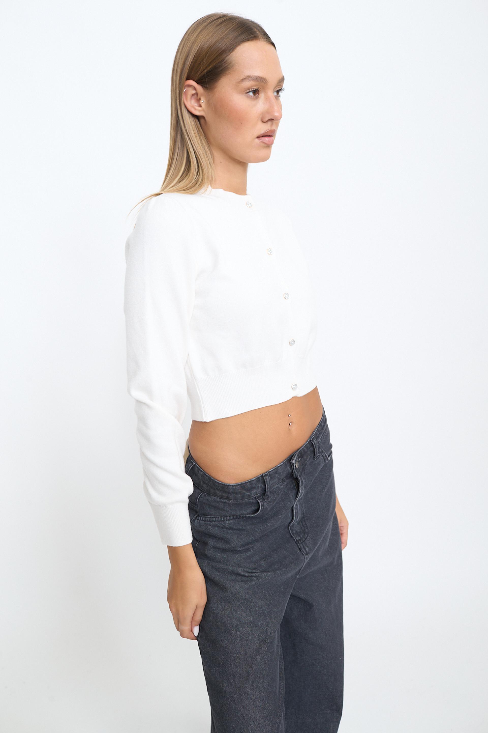 | Cardigan girocollo corto con bottoni in madreperla. | ||