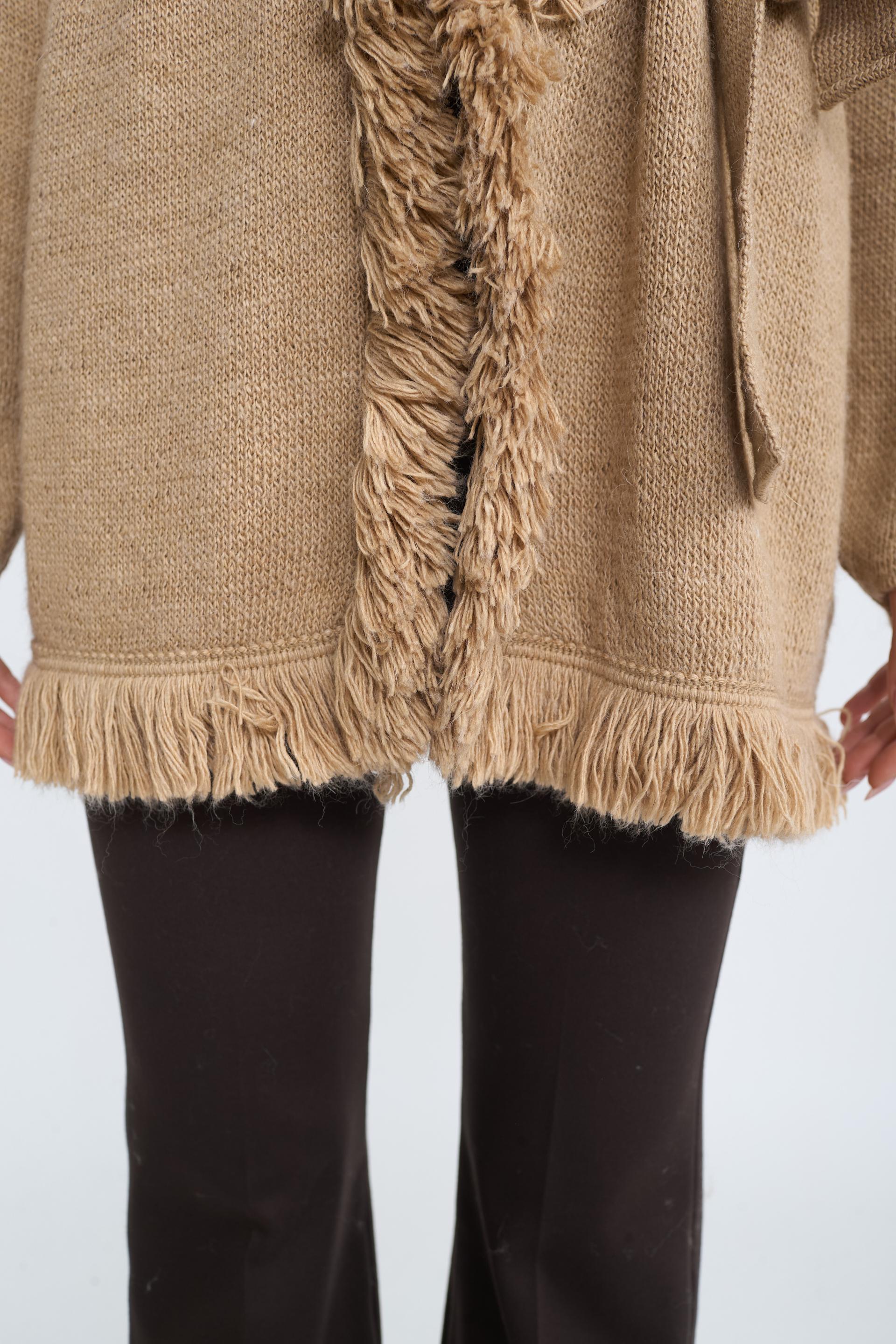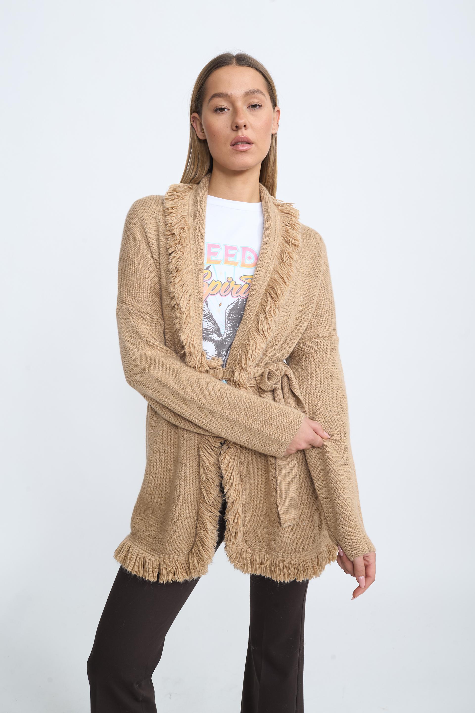 Cardigan lungo tinta unita con cinta. Dettaglio di bordi con frange. | ||