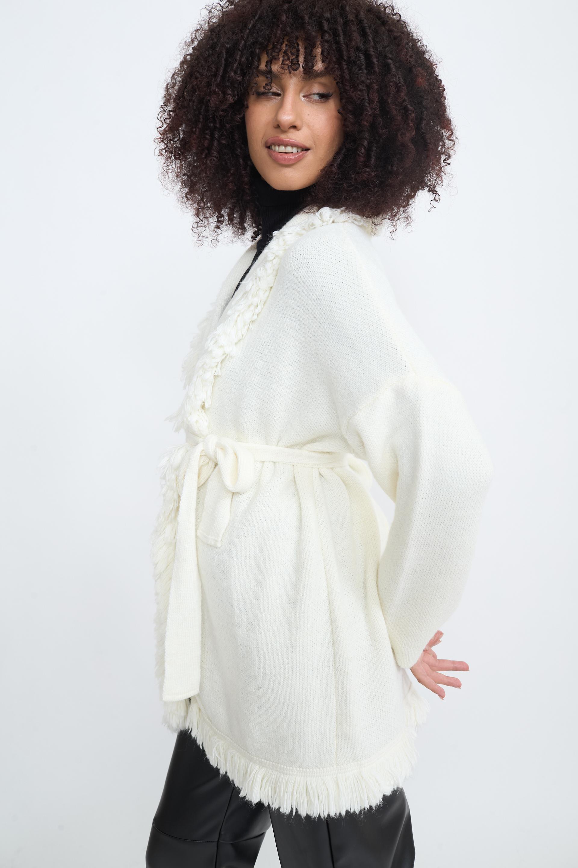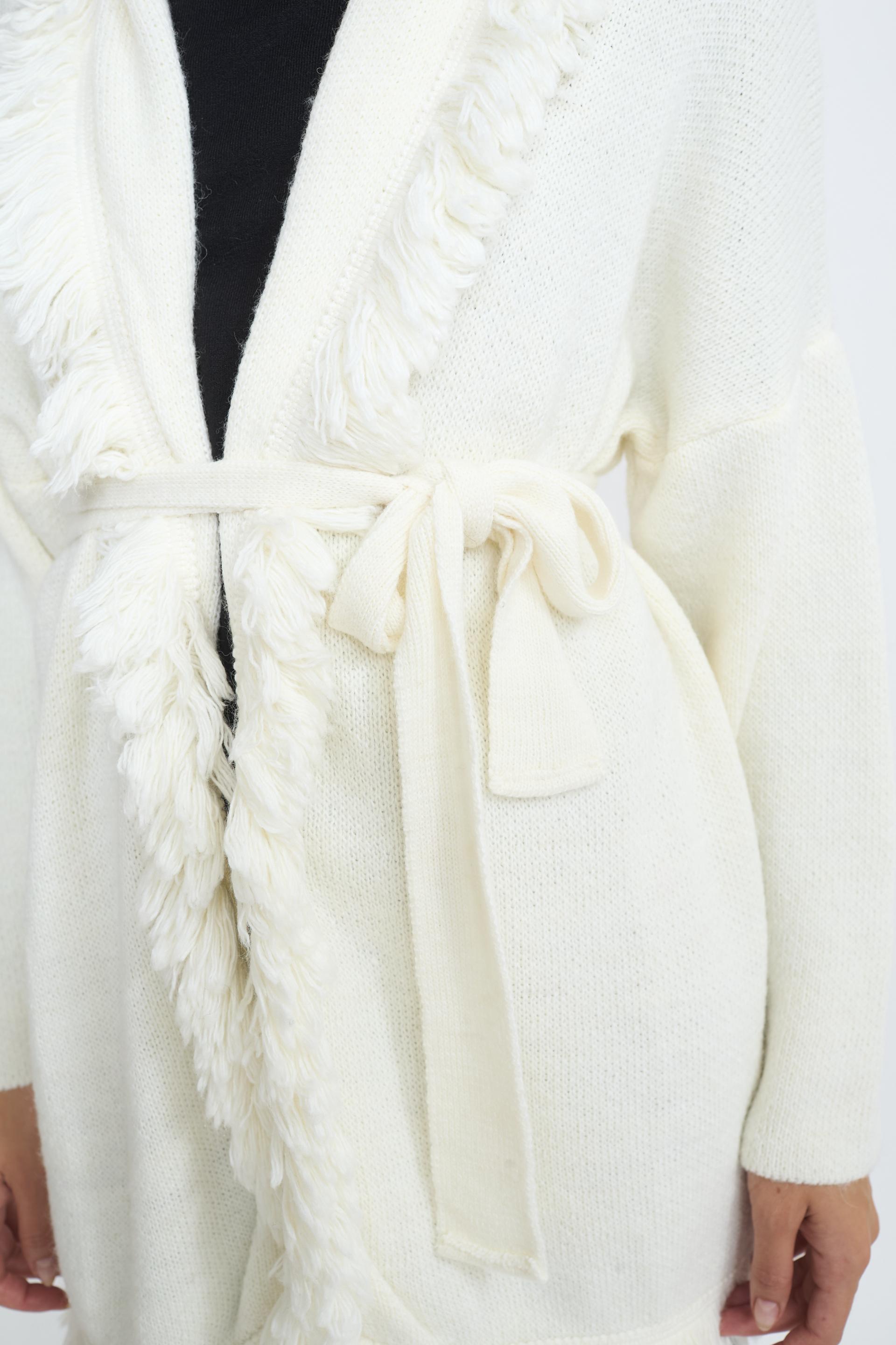 Cardigan lungo tinta unita con cinta. Dettaglio di bordi con frange. | ||