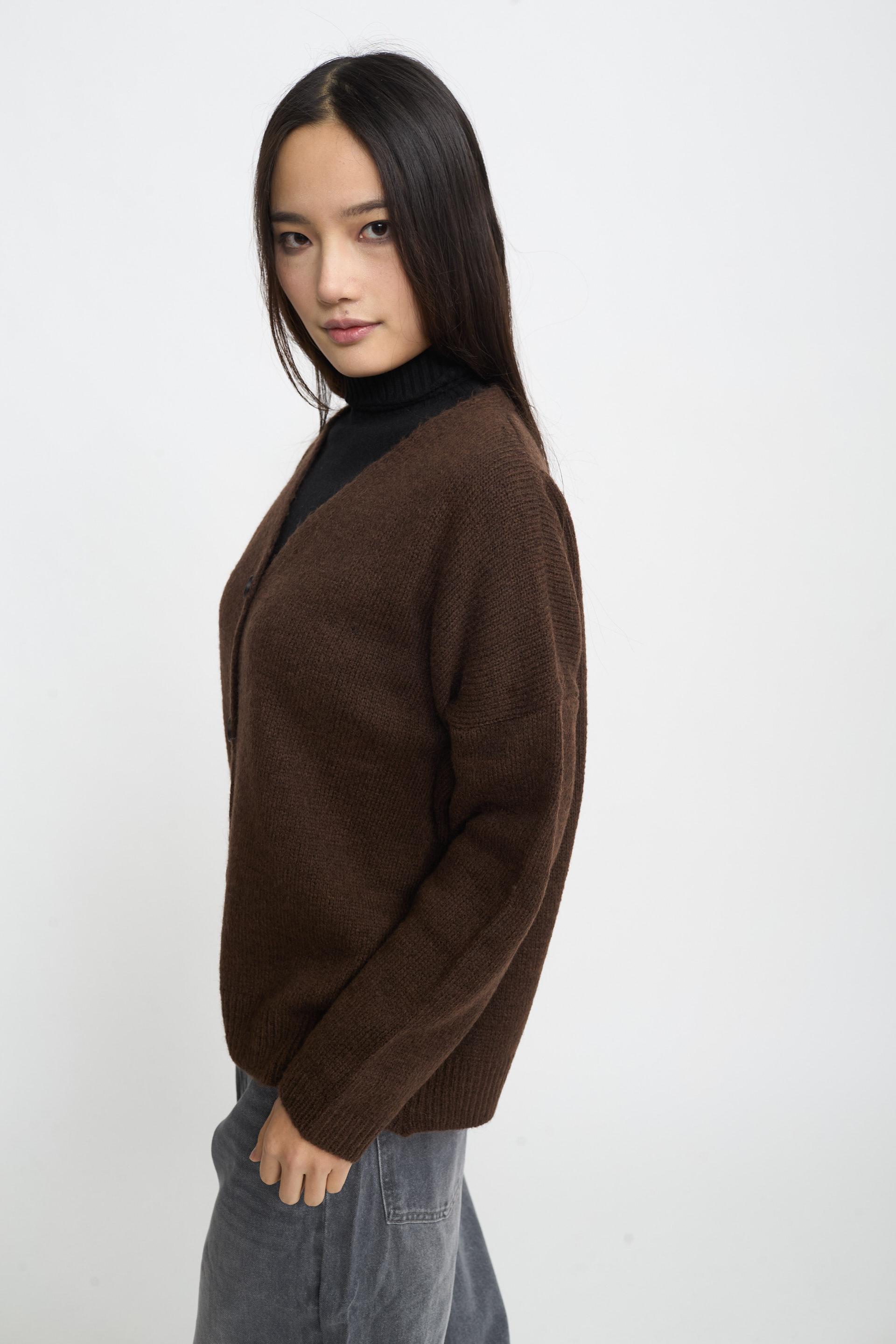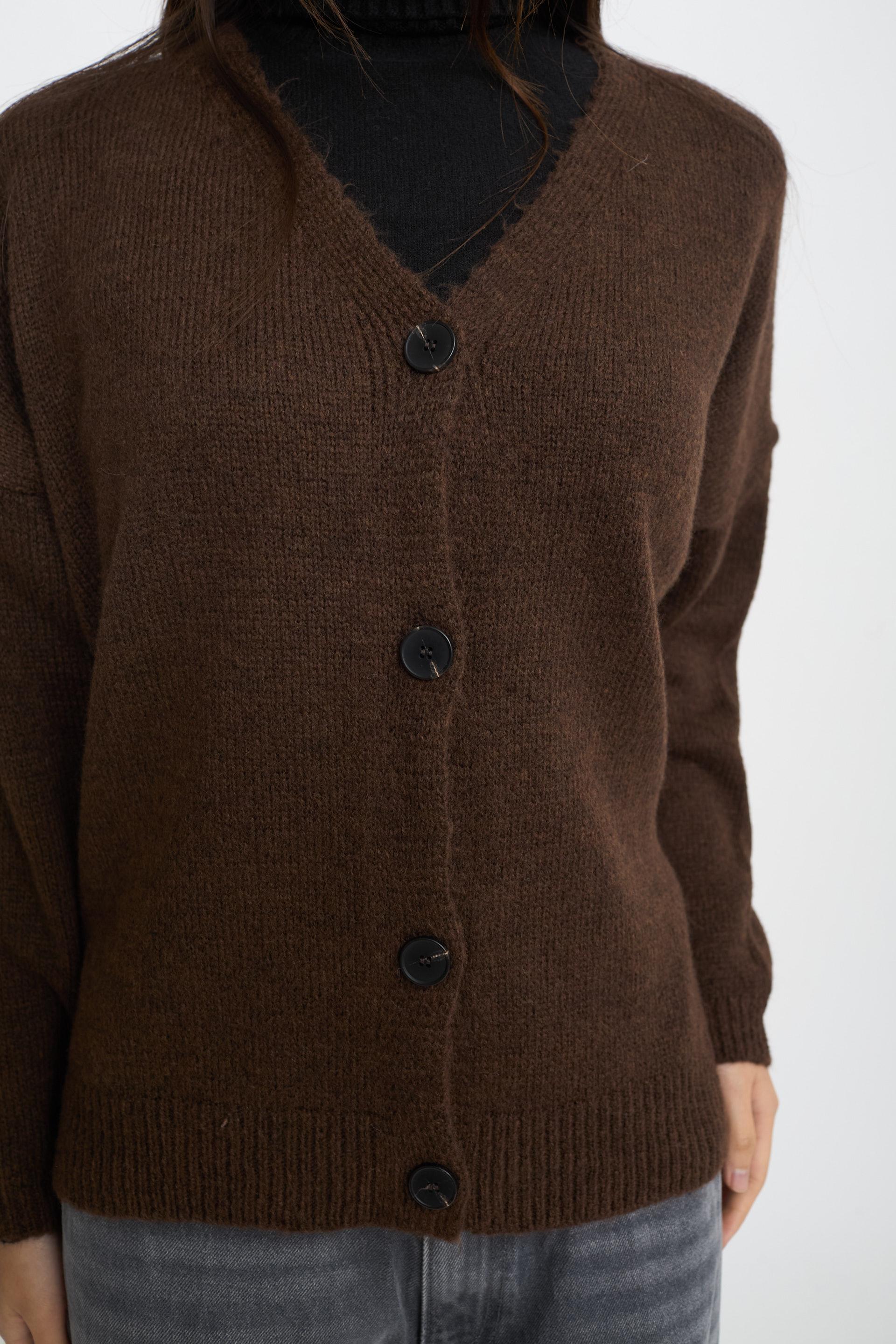 | Cardigan scollo V con bottoni e lavorazione a coste su polsini e orlo. | ||